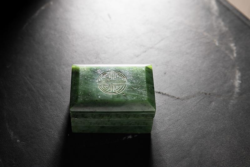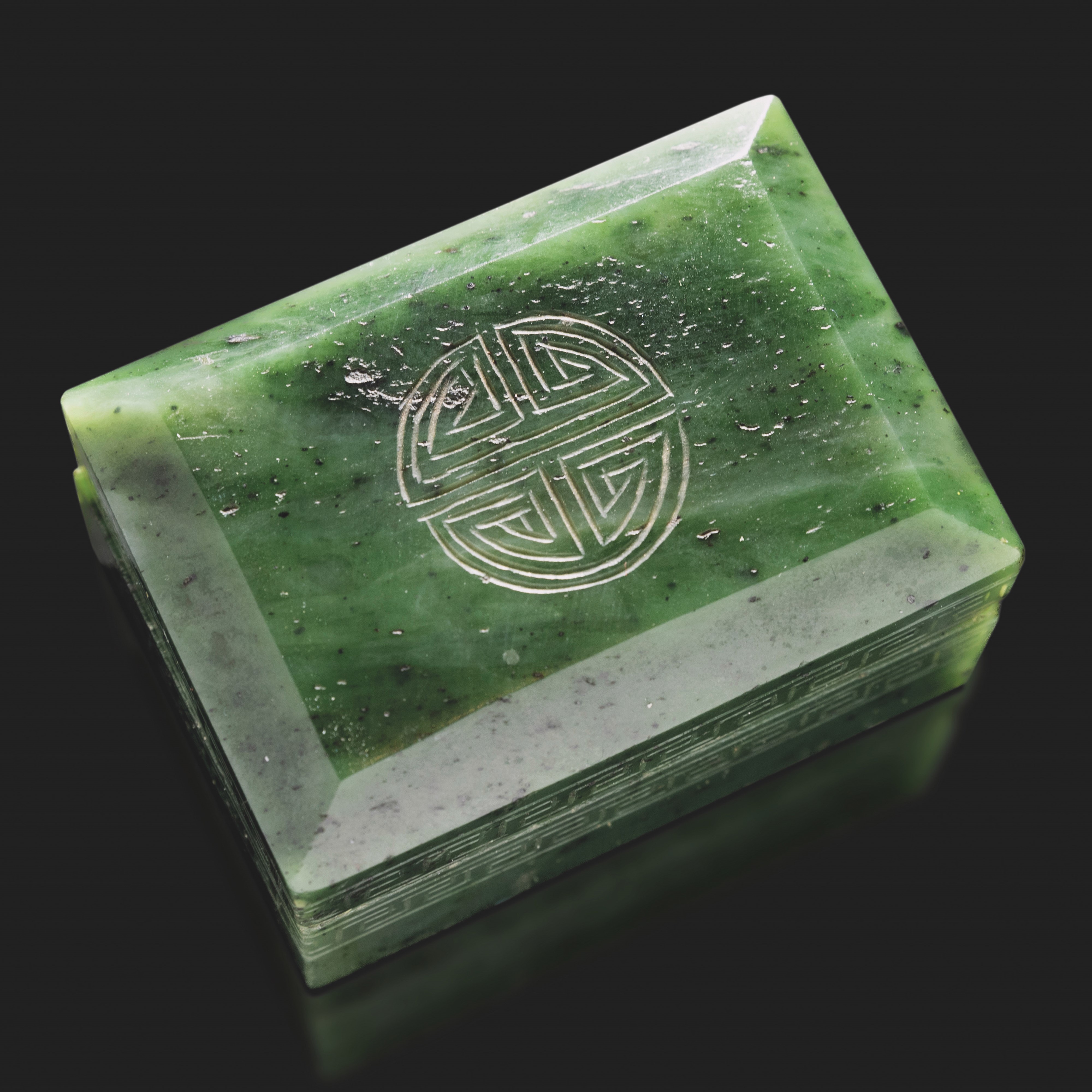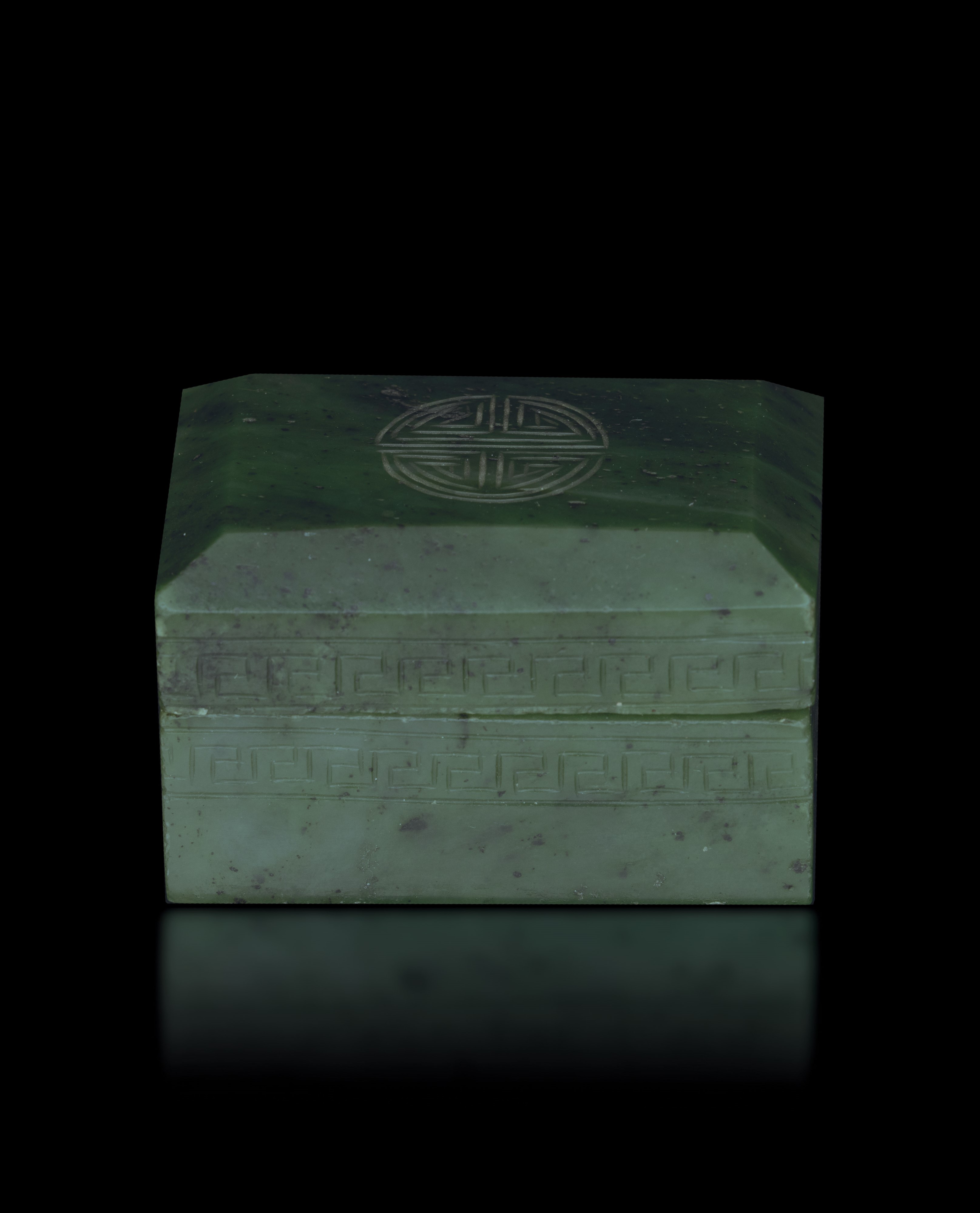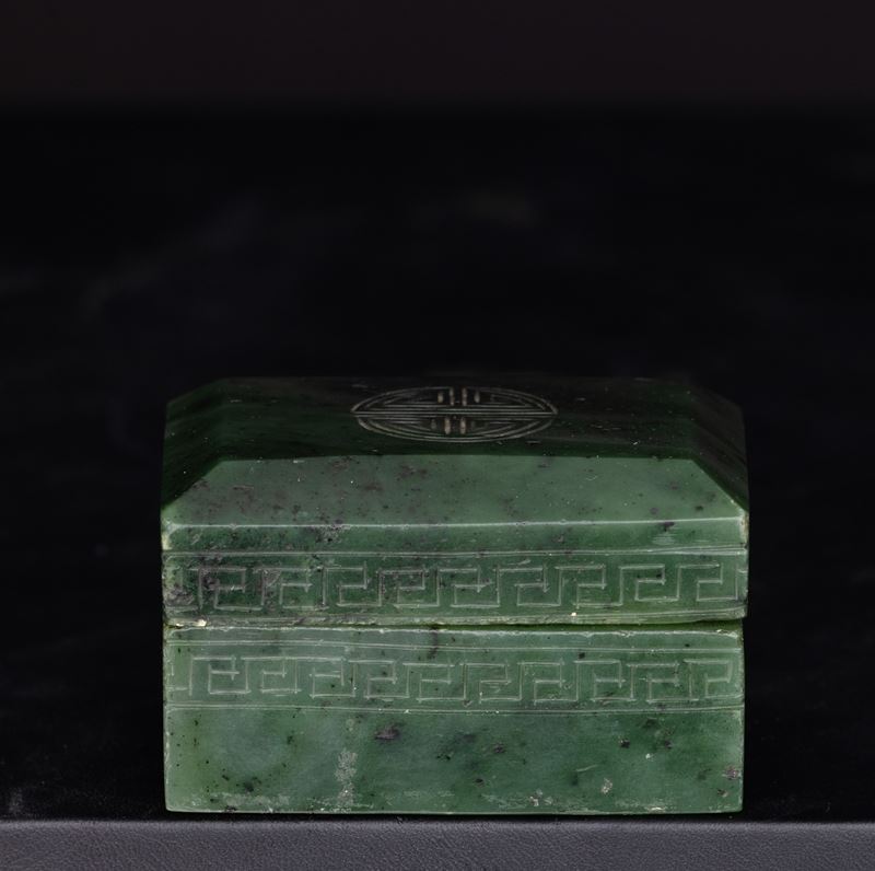 Spinach green jade box with engraved decorations on the edges, China, Qing Dynasty, 19th century