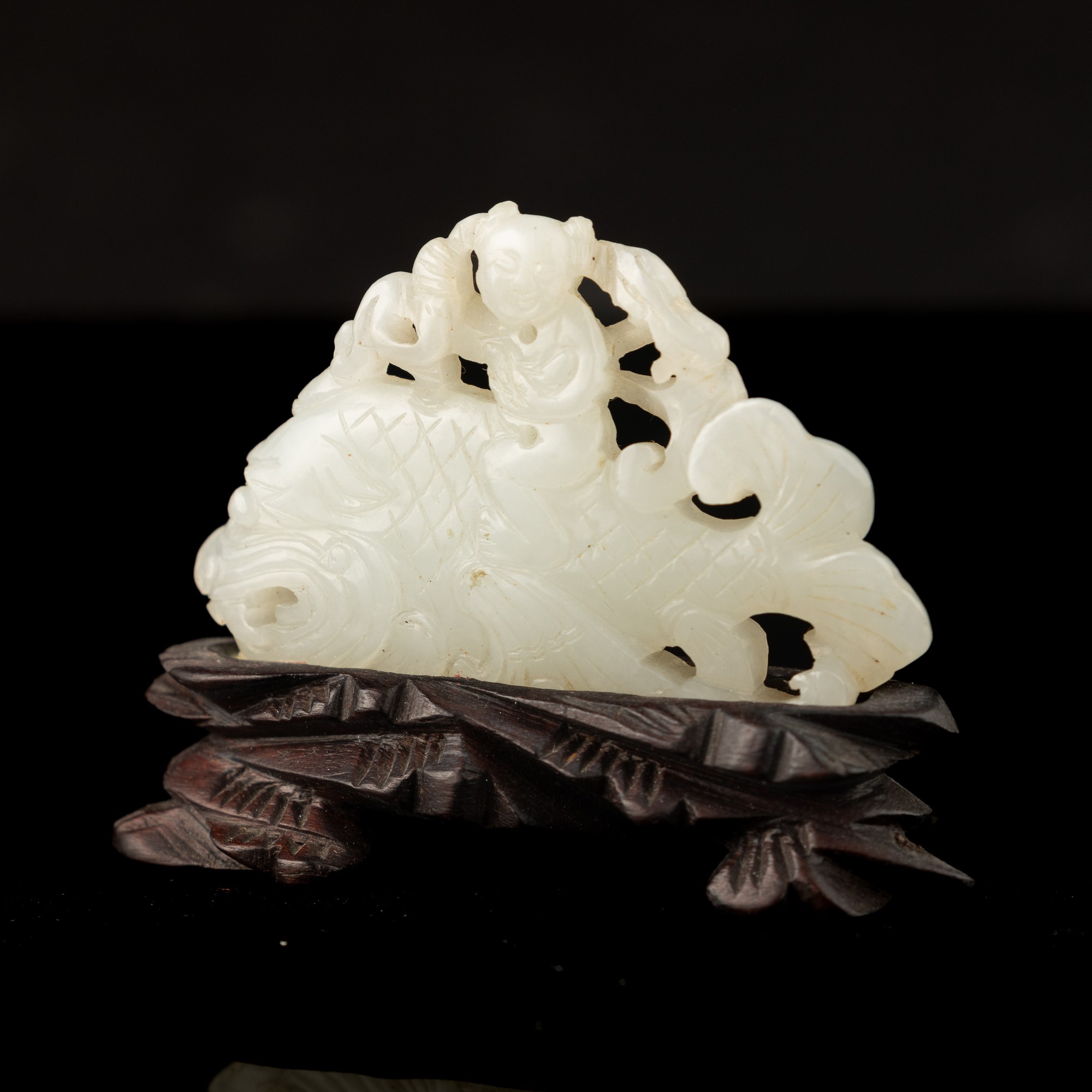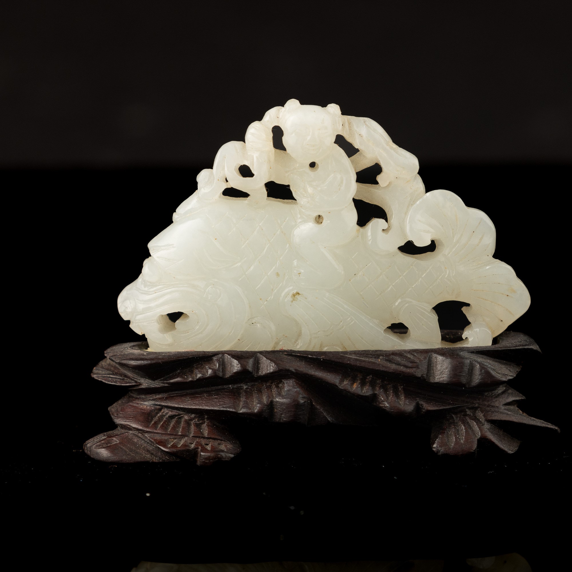 White fretwork jade element depicting fish figure with monk, China, Qing Dynasty, Qianlong period, 18th century