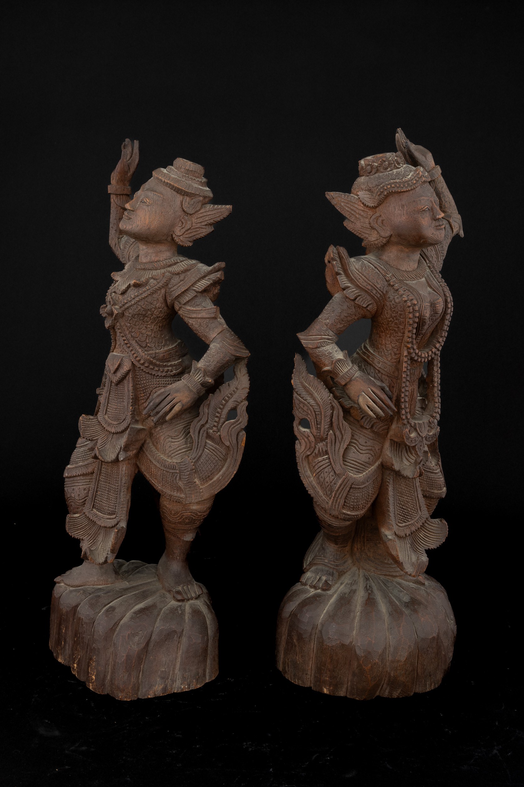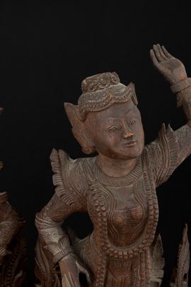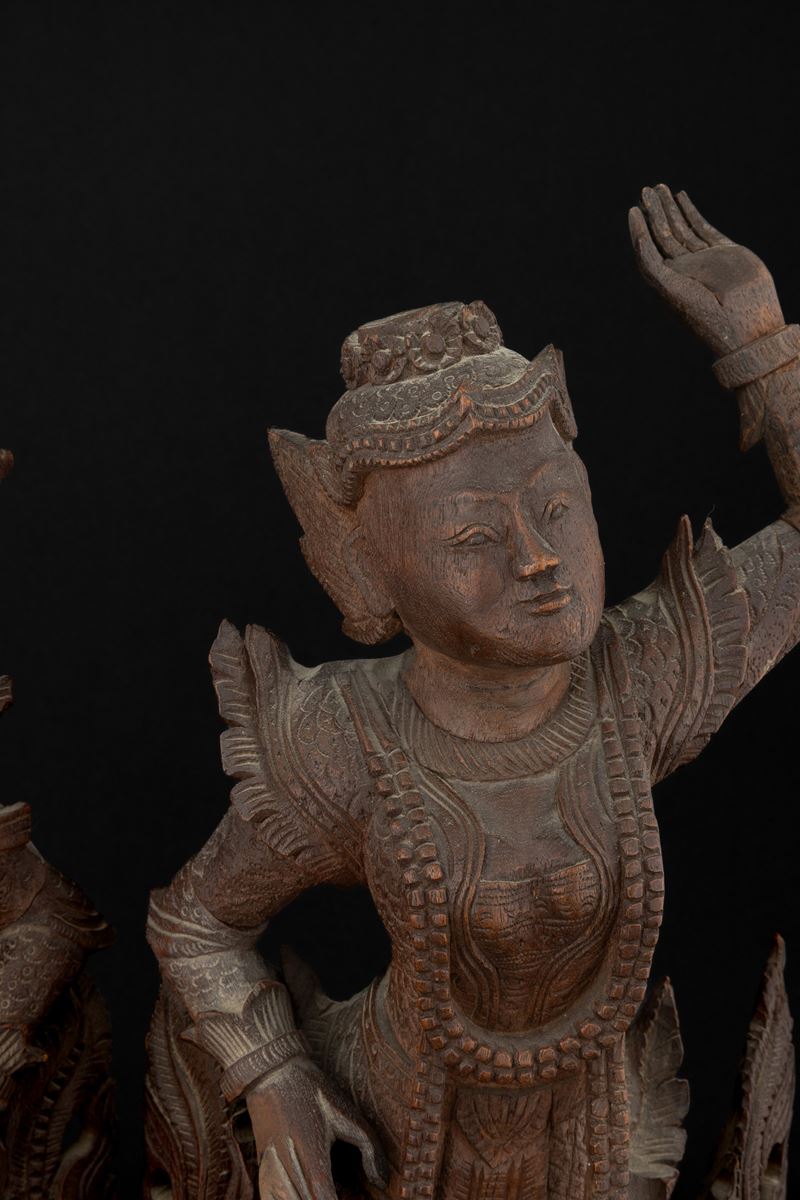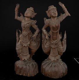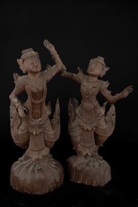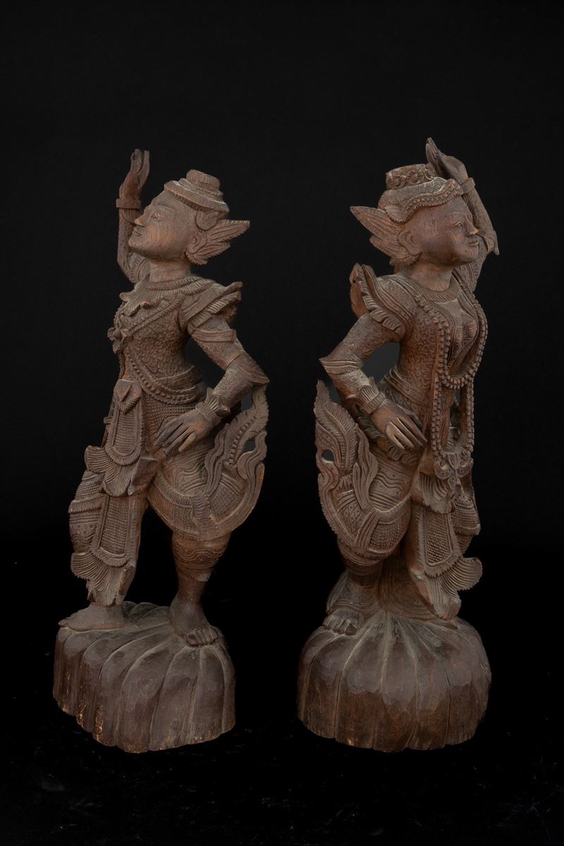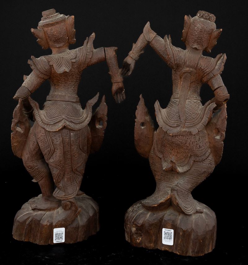 Coppia di figure di divinità in legno, Thailandia, Regno di Rattanakosin/ del Siam (1782-1932), XIX secolo