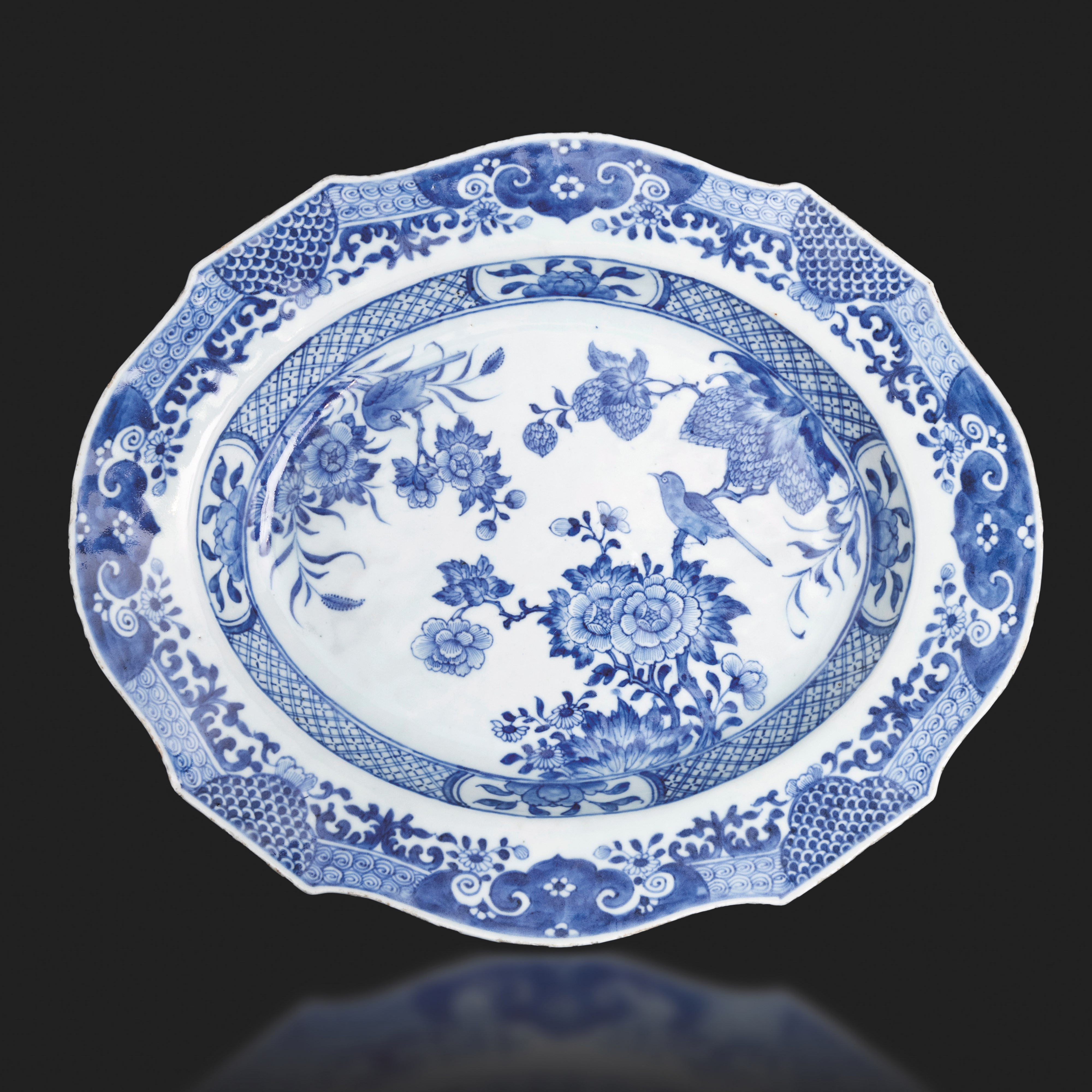 Piatto sagomato in porcellana bianca e blu con decori floreali, Cina, Dinastia Qing, epoca Qianlong, XVIII secolo