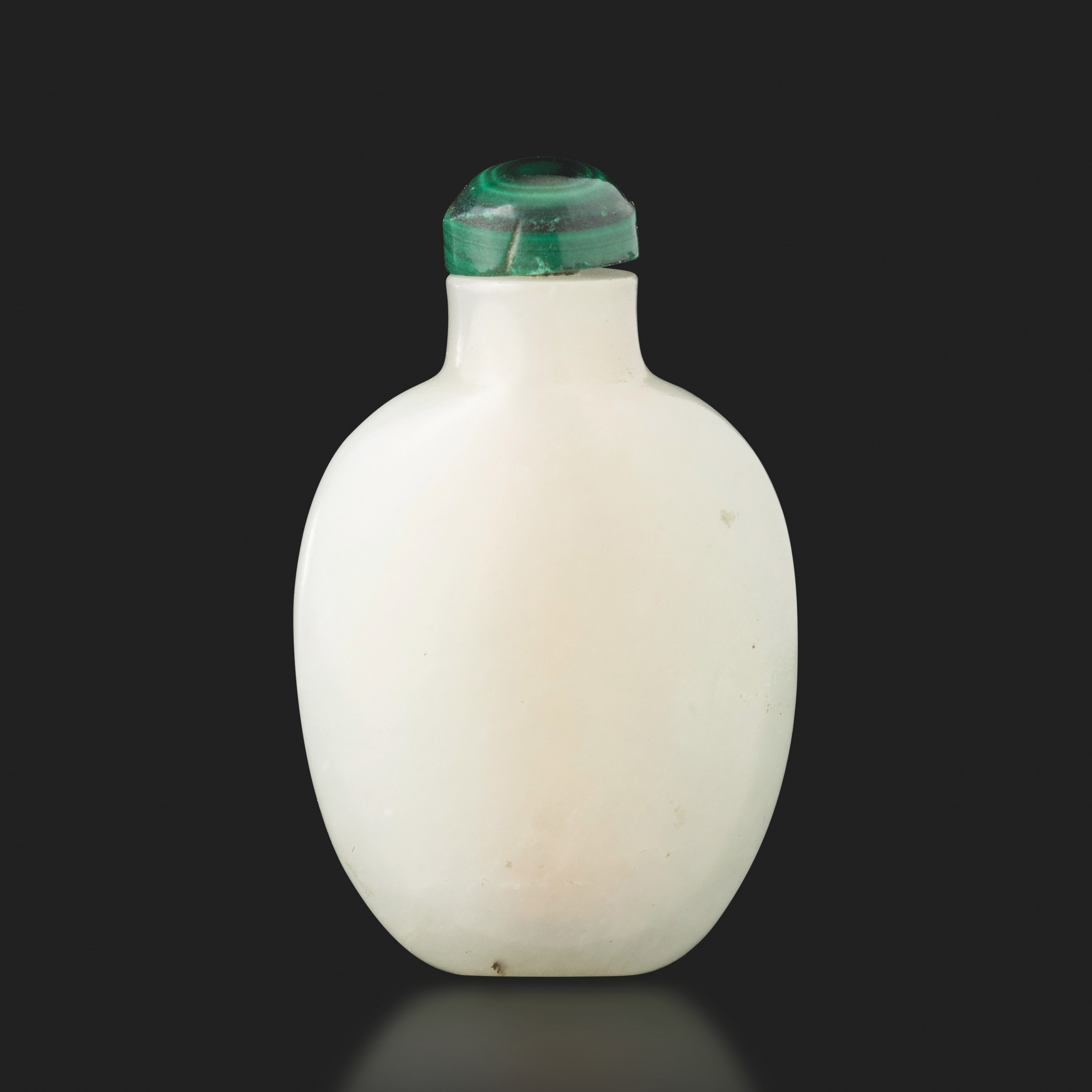 Snuff bottle in giada bianca e tappo in malachite, Cina, Dinastia Qing, XIX secolo