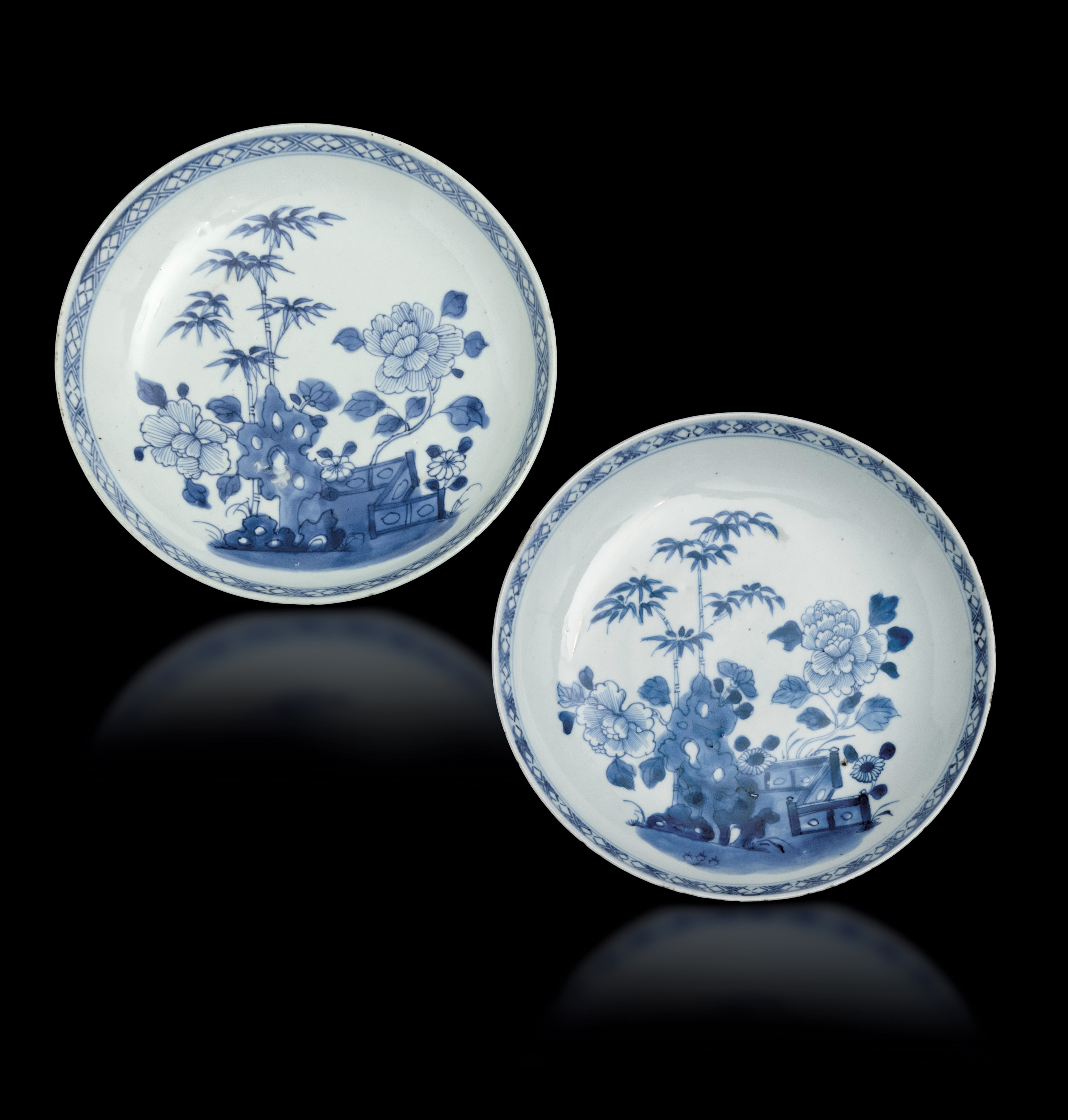 Tre piatti in porcellana bianca e blu con decori floreali, Cina, Dinastia Qing, epoca Qianlong, XVIII secolo