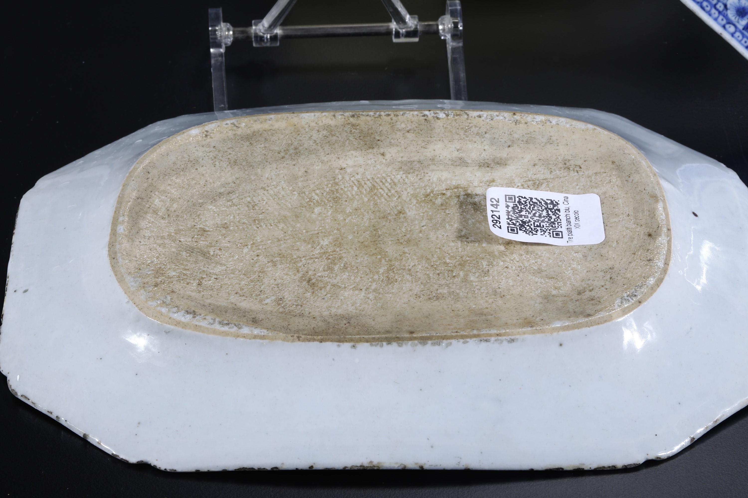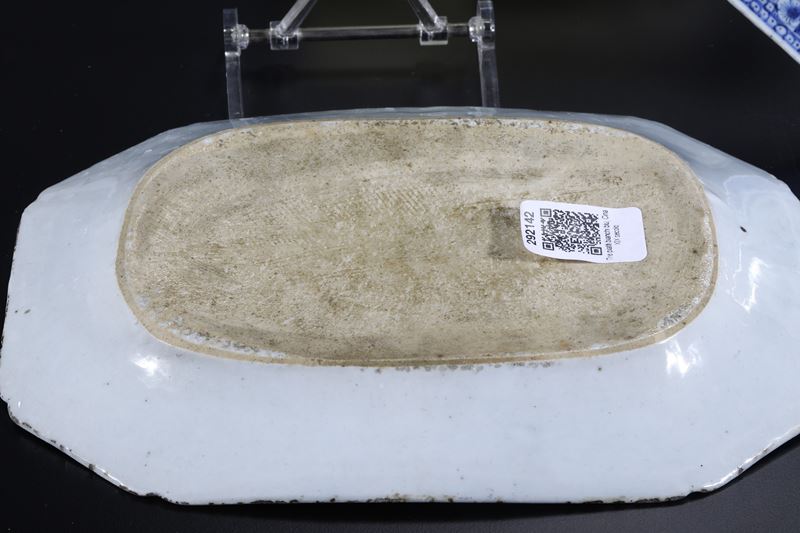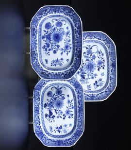 Tre piatti ottagonali bianchi blu con decoro di fiori, Cina, Dinastia Qing, epoca Qianlong, XVIII secolo