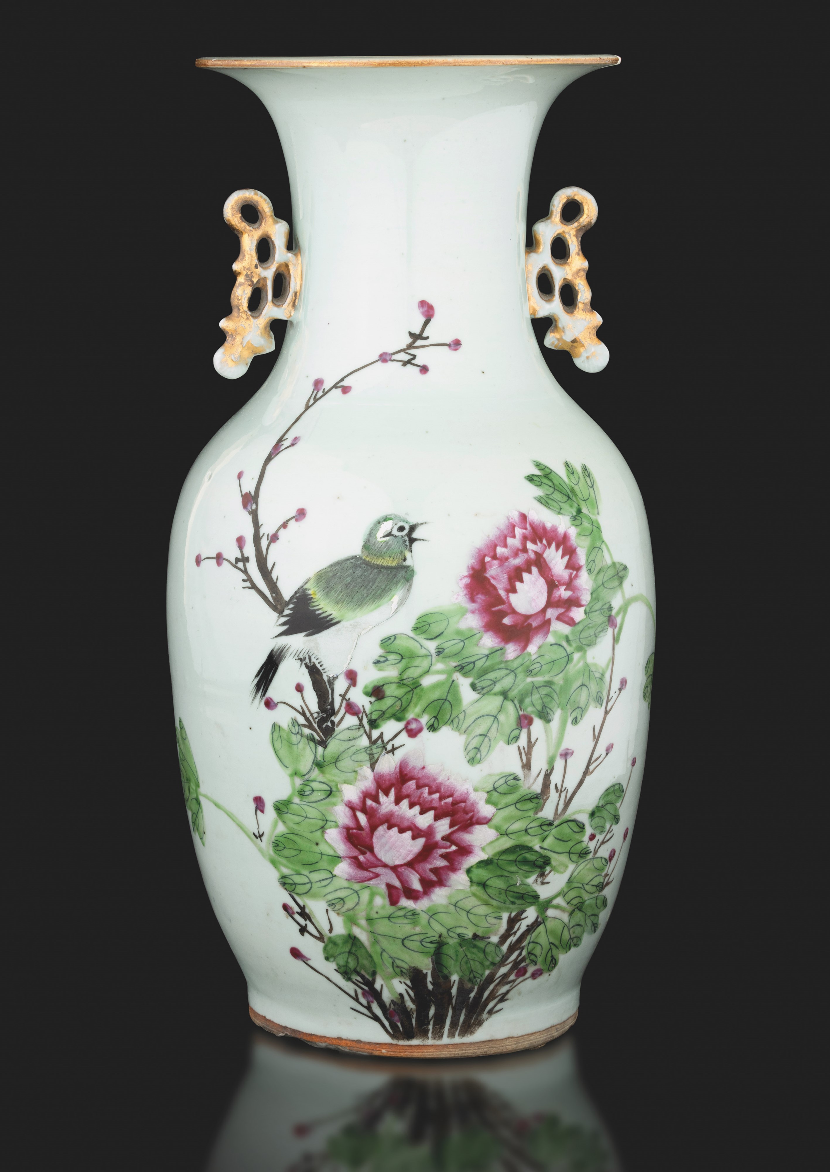 Vaso in porcellana a smalti Famiglia Rosa a soggetto naturalistico con anse a foggia di rami, Cina, periodo Repubblica, [..]