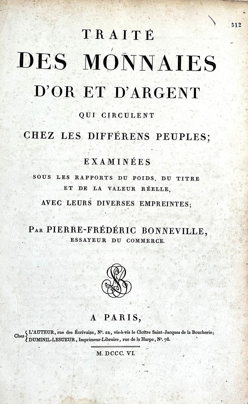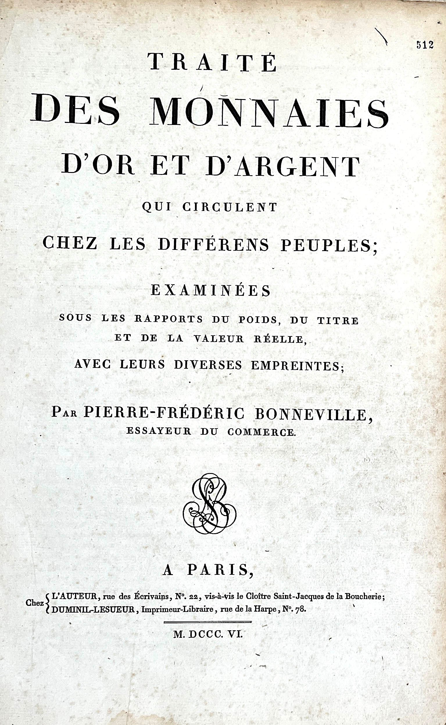 BONNEVILLE P. F. RAITÉ DES MONNAIES D'OR ET D'ARGENT, QUI CIRCULENT CHEZ LES DIFFERENS PEUPLES; EXAMINÉES SOUS LES RAPPORTS DU POIDS, DU TITRE ET DE LA VALEUR RÉELLE, AVEC LEURS DIVERSES EMPREINTES.