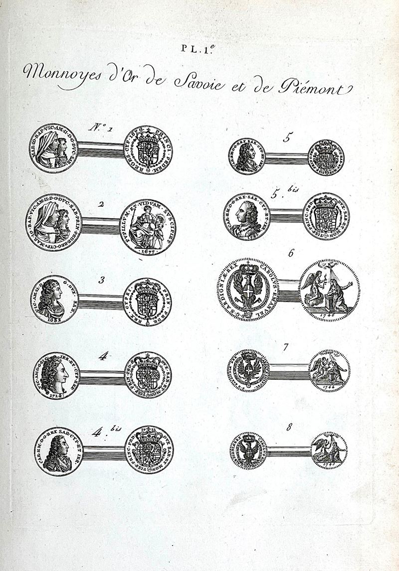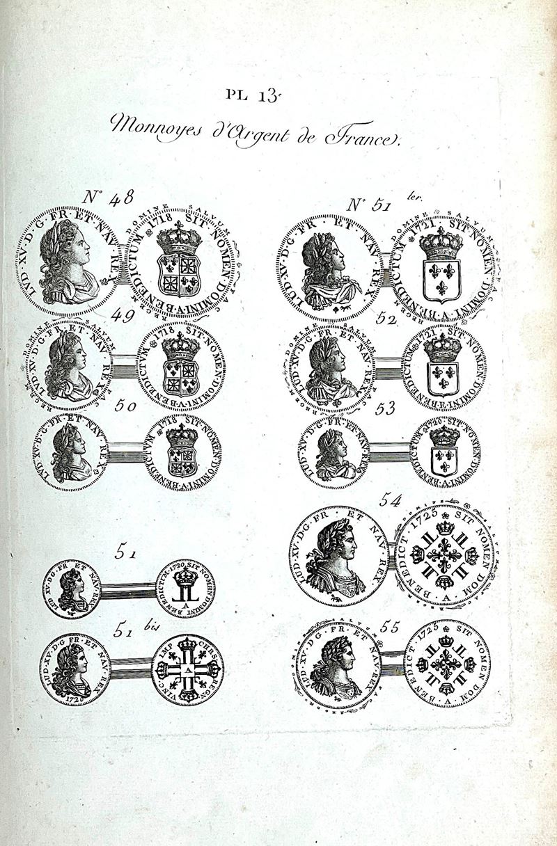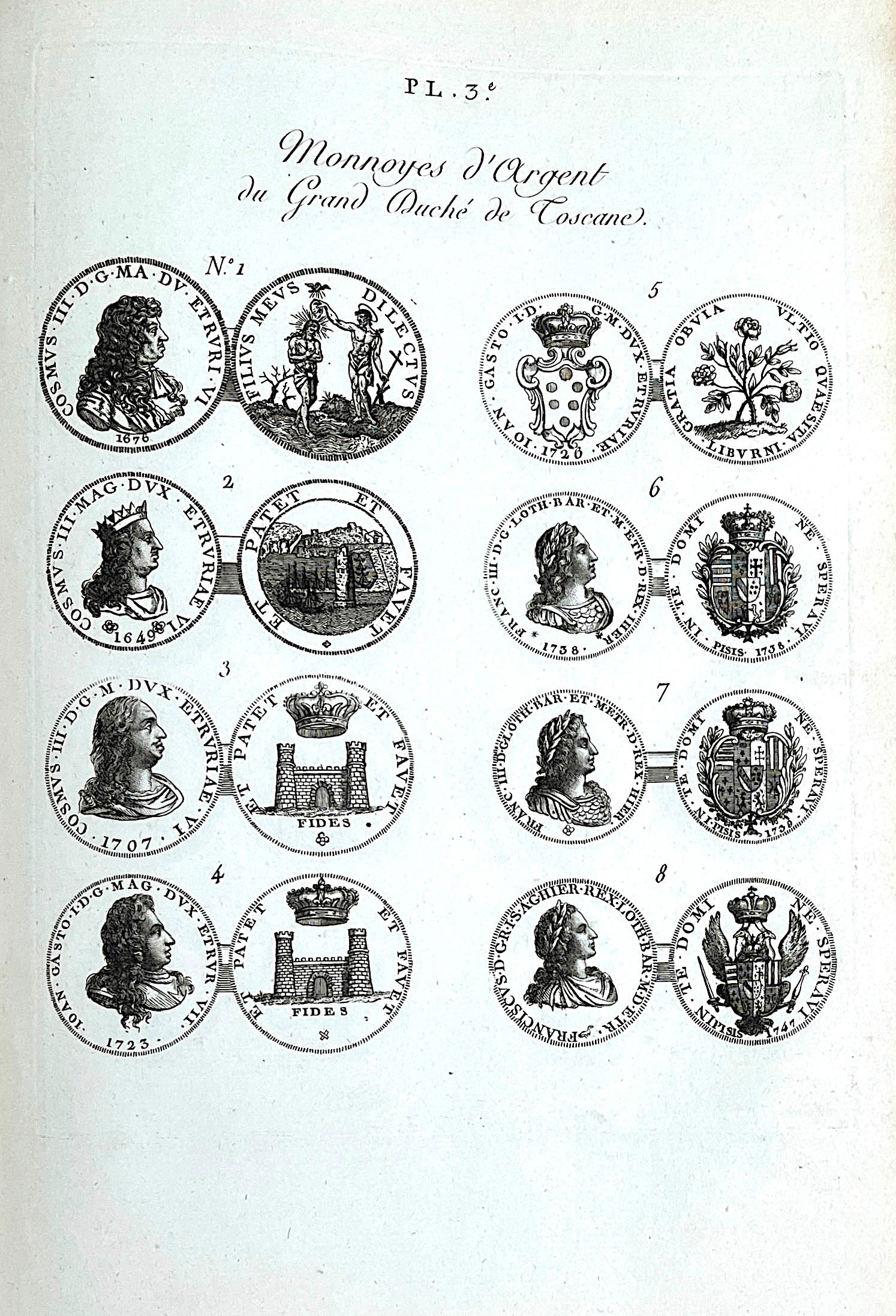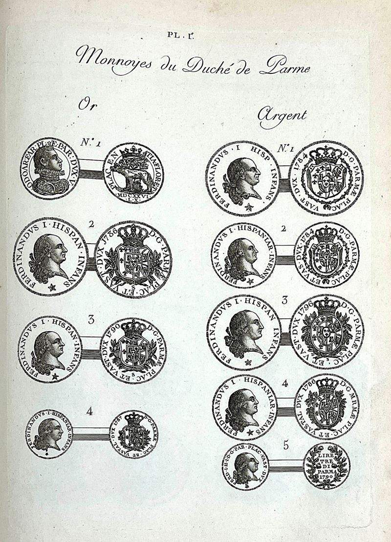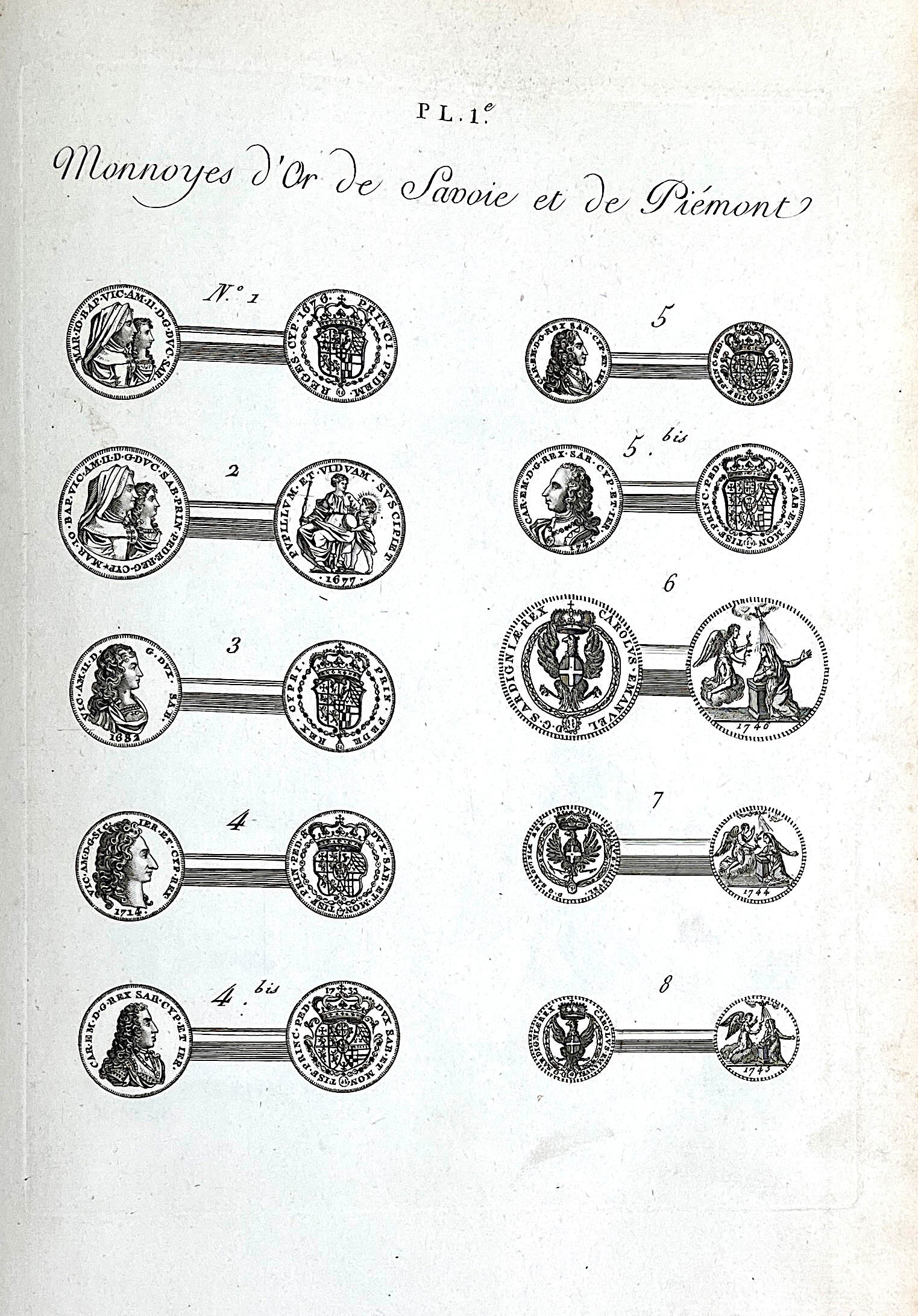 Parigi, 1806. 266 pp. Numerose tavole con bellissimi disegni di monete. Formato in folio circa cm. 25x38. Rilegatura in mezza pelle. Condizioni esterne discrete, interne buone. Qualche strappo.