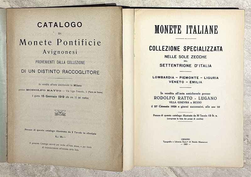 - Lugano, 27 gennaio 1926. MONETE ITALIANE NELLE SOLE ZECCHE DEL SETTENTRIONE D'ITALIA. nn. 2472 lotti offerti, 160 pp. non illustrate. Brossura editoriale. Condizioni molto buone.