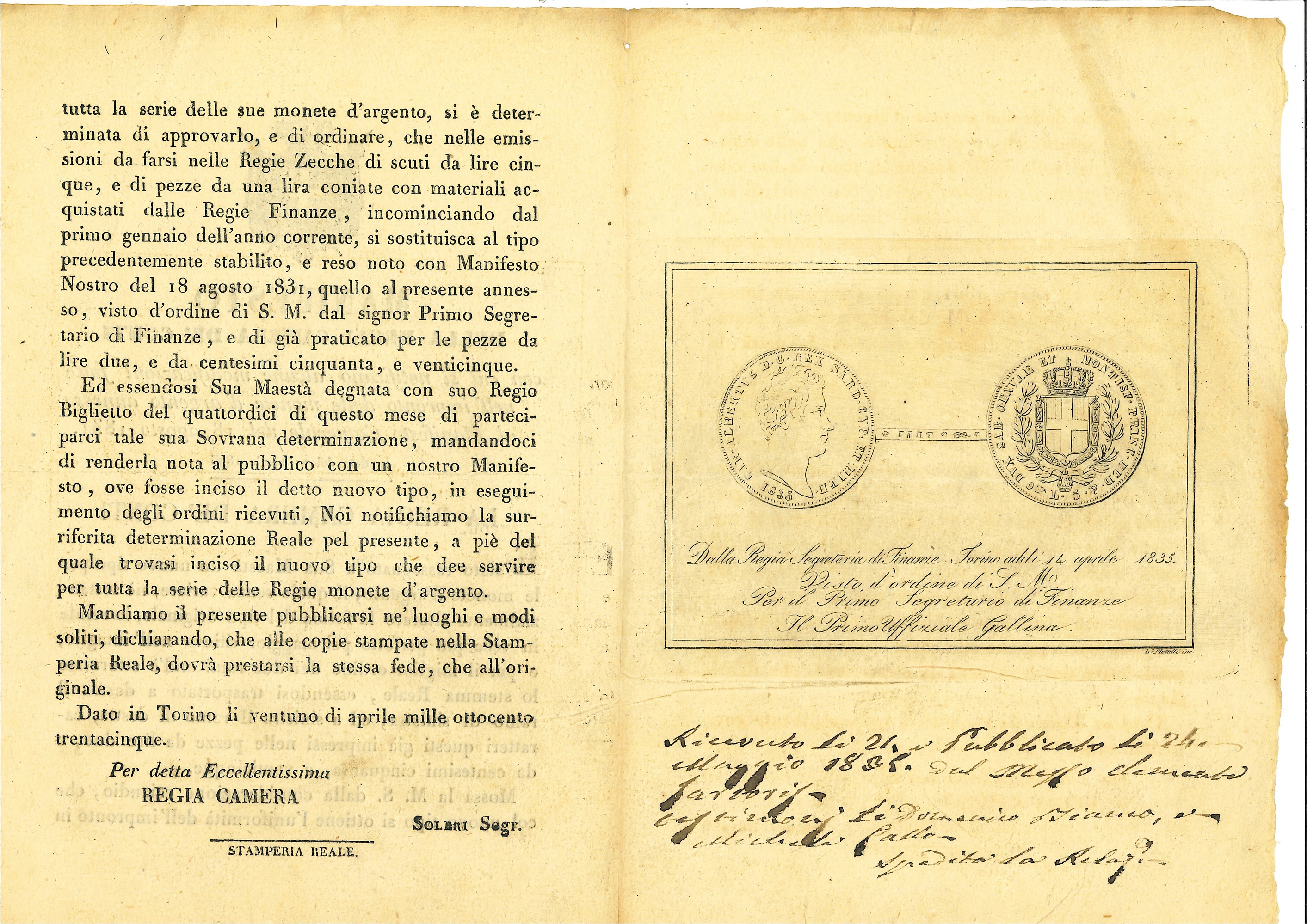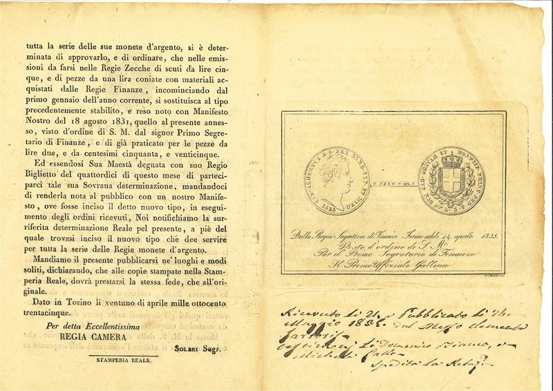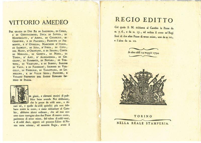 Editti e decreti regi datati fra il 14 maggio 1794 e il 7 marzo 1901. Interessanti documenti sulle disposizione monetarie vigenti nei regni di Sardegna e d'Italia sotto i re Vittorio Amedeo III, Napoleone, Carlo Alberto, Vittorio Emanuele II e Vittorio Emanuele III. Mediamente in condizioni molto buone.
