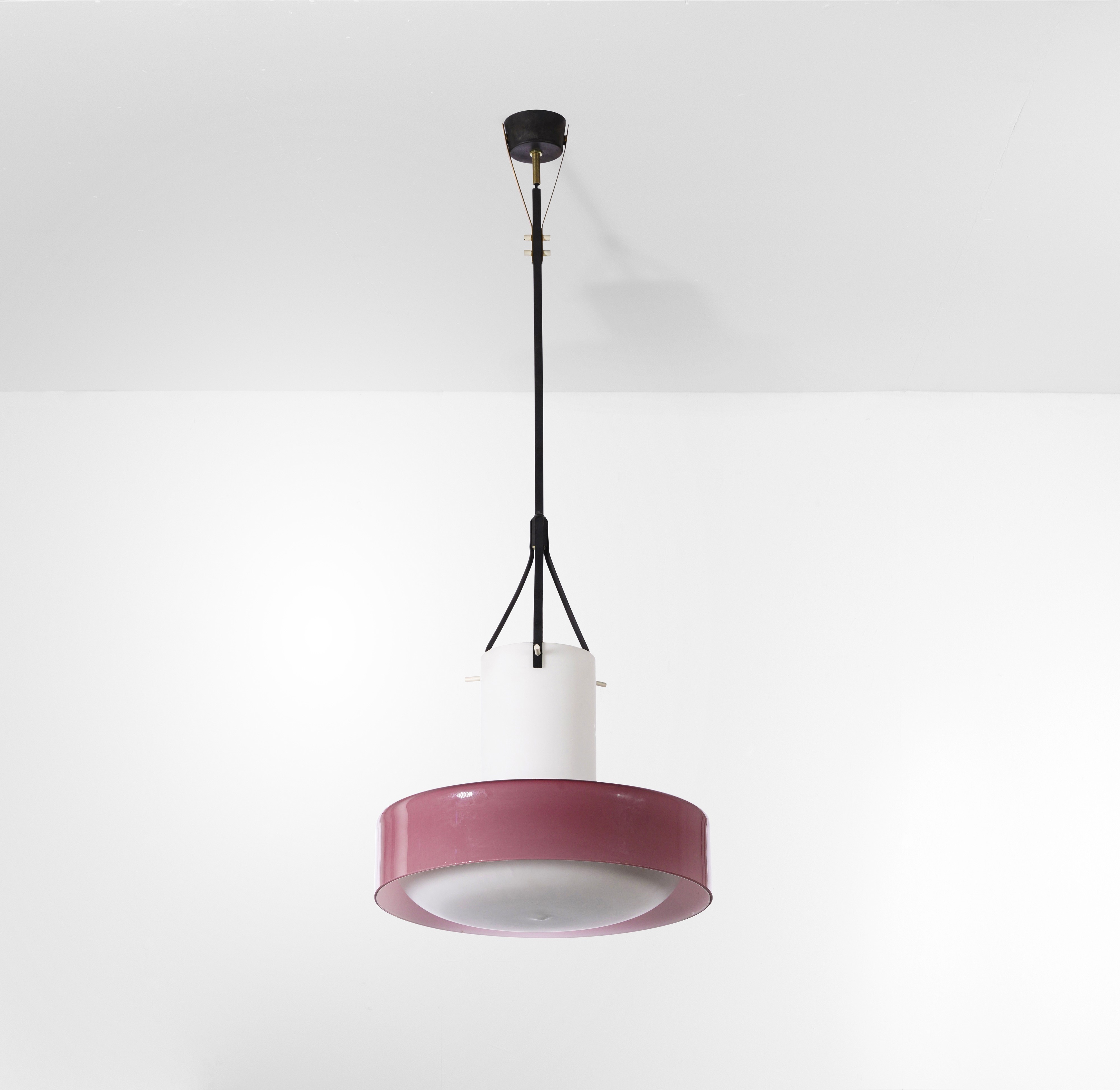 Struttura in metallo laccato e diffusori in vetro satinato e vetro incamiciato colorato.