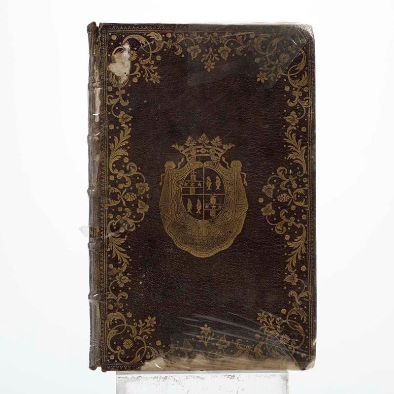 In-8°. Ex libris a timbro al frontespizio anteriore. Bella rilegatura coeva con armi nobiliari ai piatti. Mancanza di una porzione di pelle al piatto anteriore