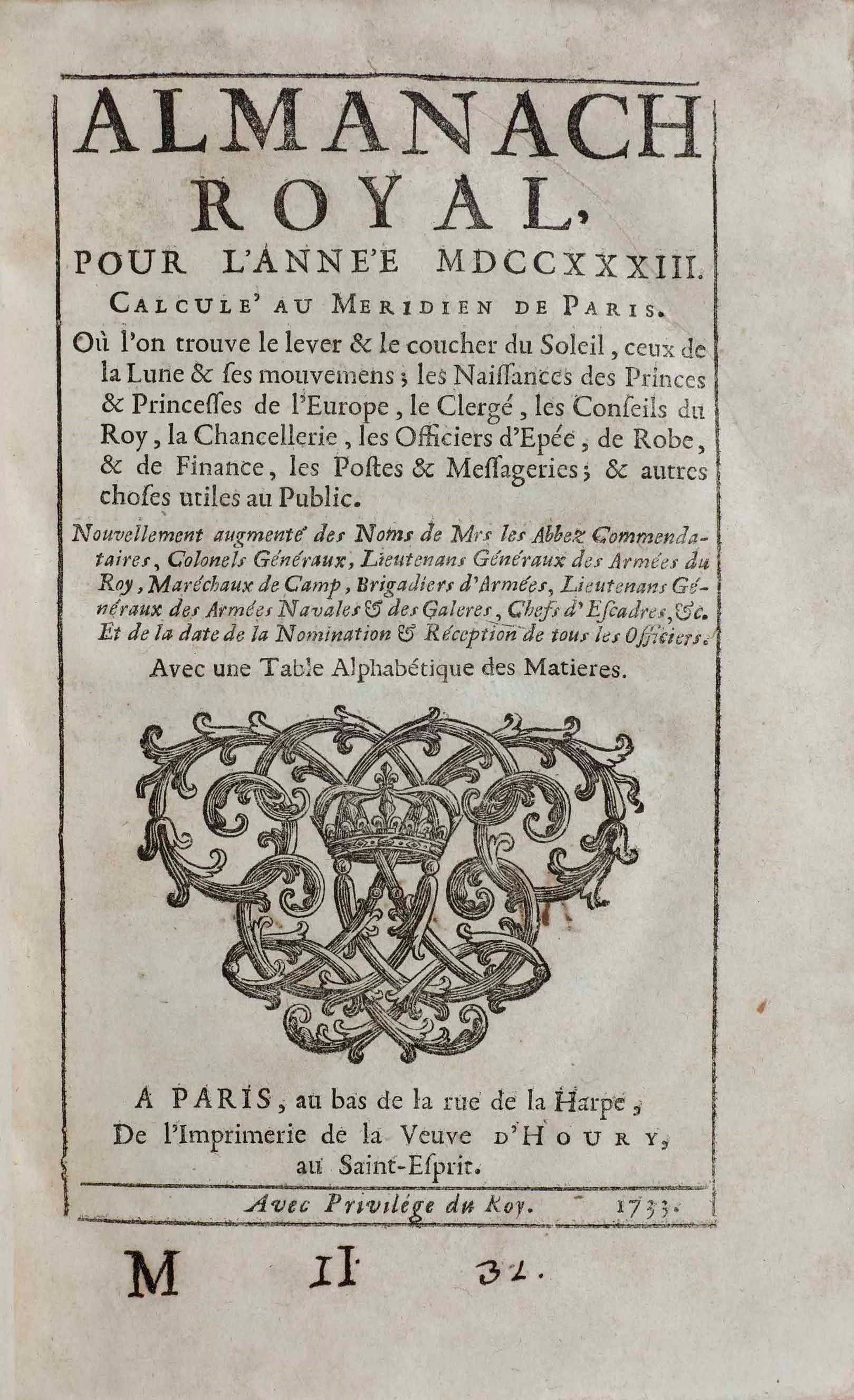 Autori Vari Almanach Royal, pour l’année 1733 e 1734, a Paris, de l’Imprimerie de la Veuve d’Houry