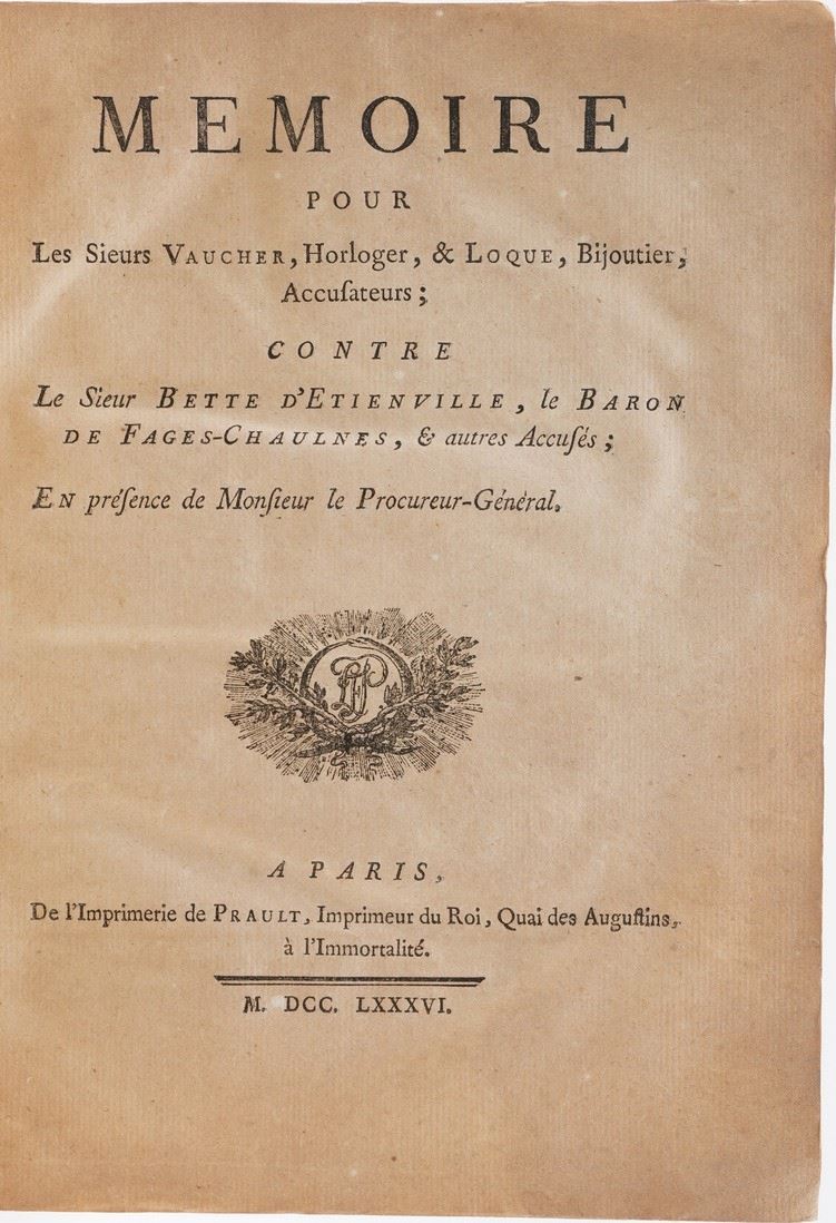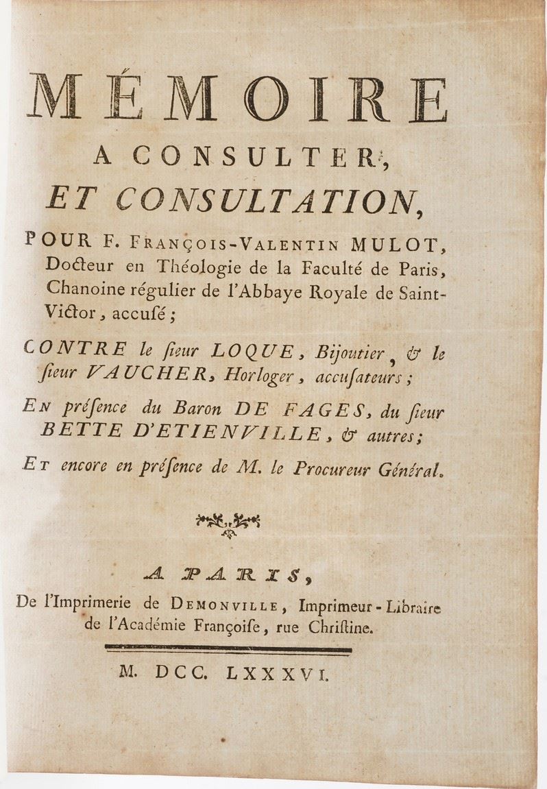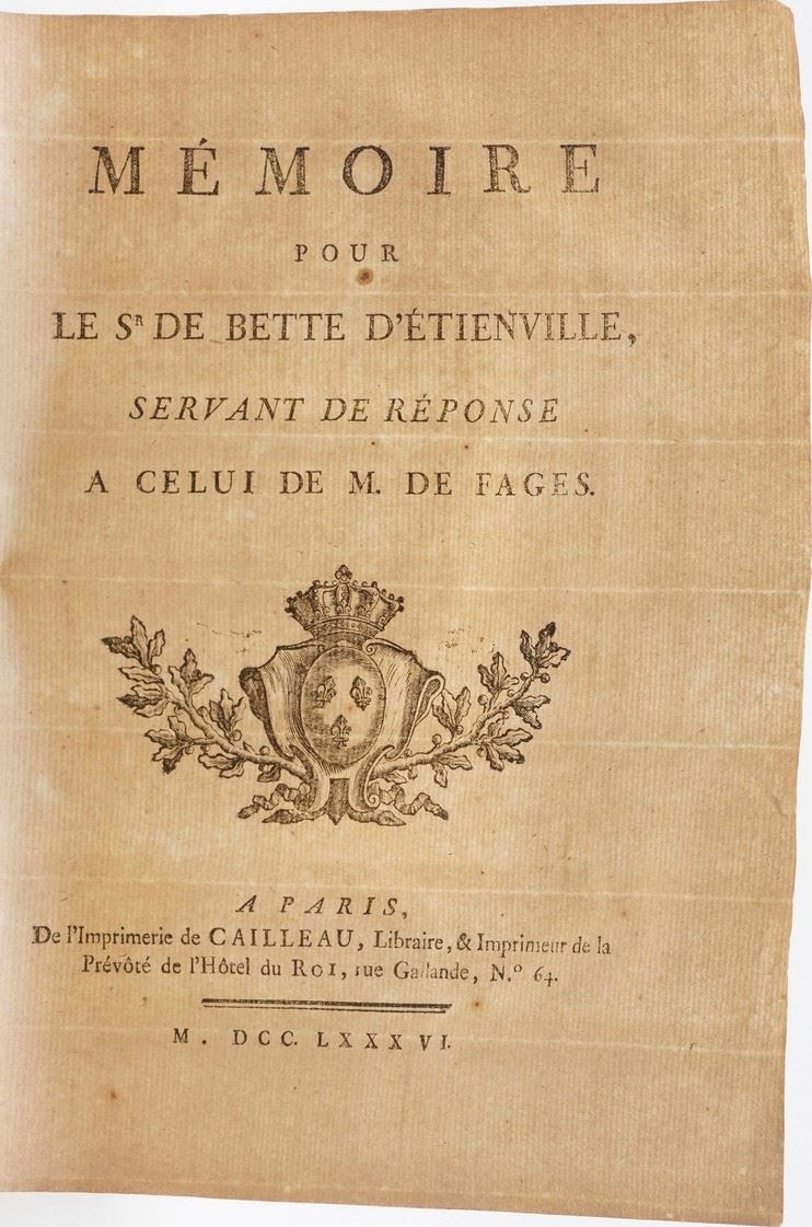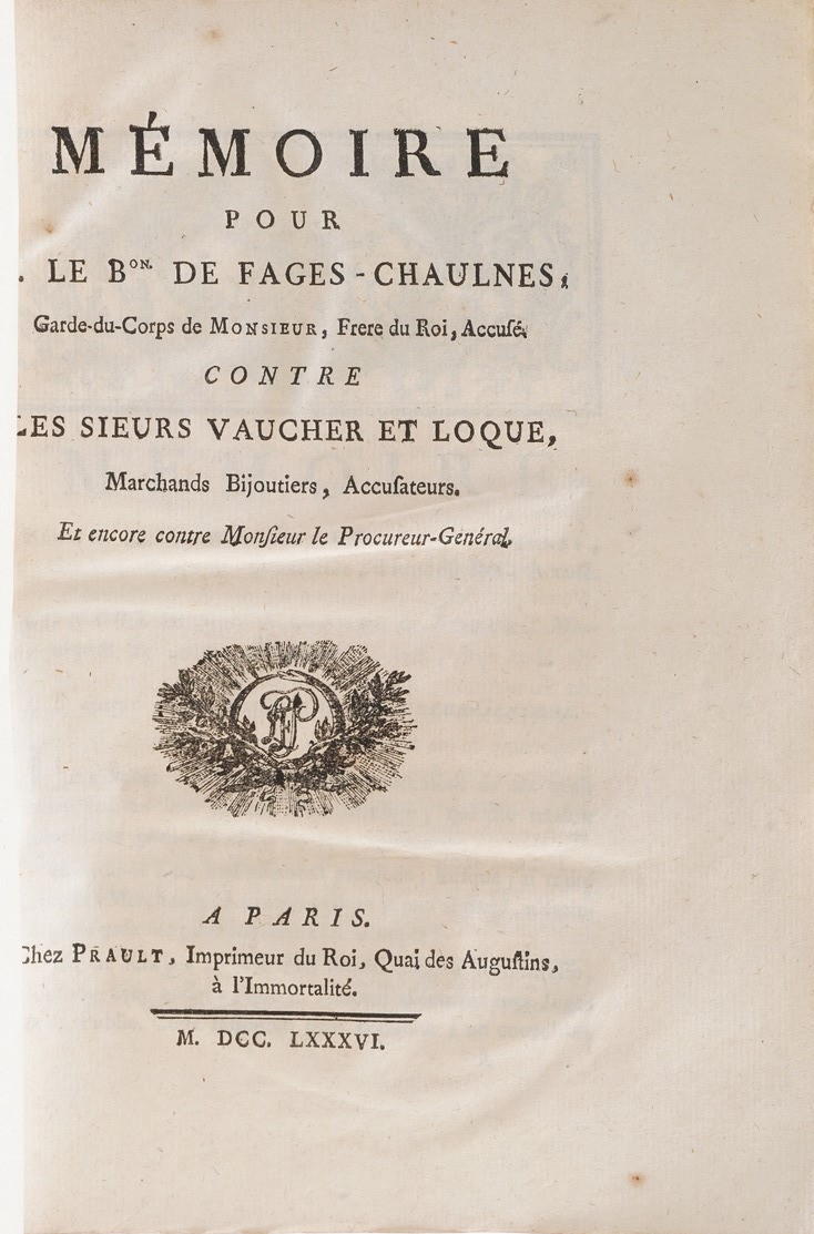 Si uniscono al lotto: Memorire pour M. Le bon de fages- chaulnes, A Paris 1786; Memoire pour le sr de bette d’entienville, A Paris 1786; Memoire a consulter et consultation, A Paris 1786; Defense a une accusation d’escoroquere memoire a consulter et consultation; Reponse de M. le Comte de precourt, A Paris 1786; The history of the council of trent, Londra 1676.