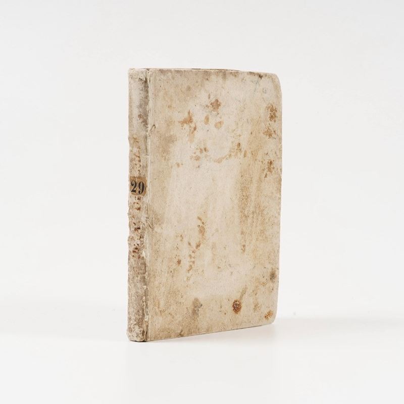 In-4°. Rilegatura coeva in cartone alla rustica. Danno da bruciatura al margine delle prime carte, lontano dal testo, per altro bell'esemplare in barbe. Timbri della Biblioteca Civica di Bergamo, che come è noto alienò i propri duplicati, nella prima metà del secolo XX