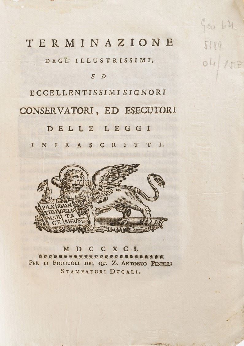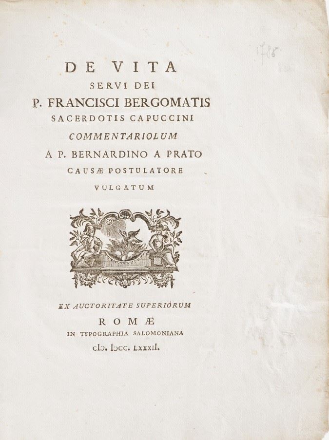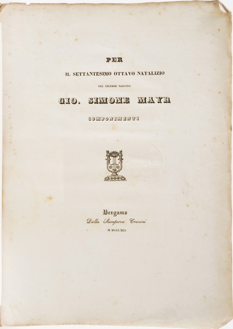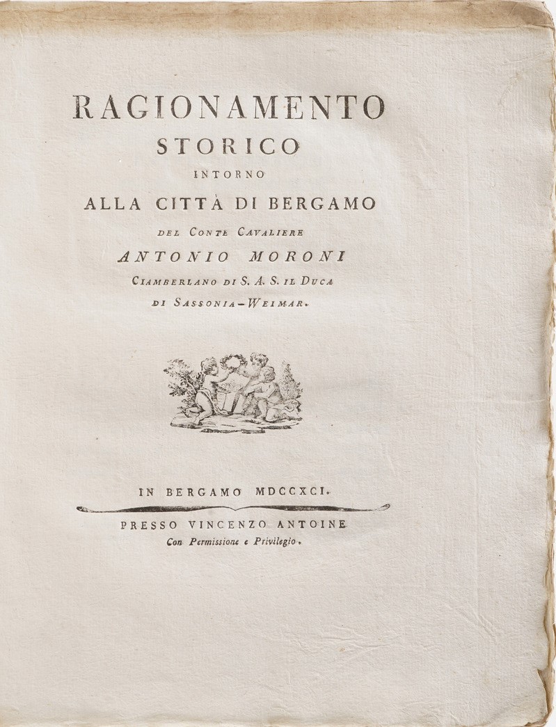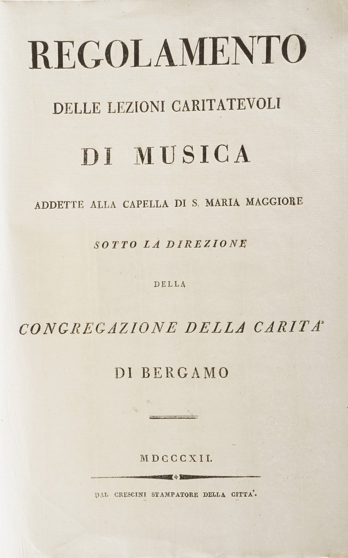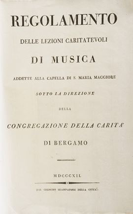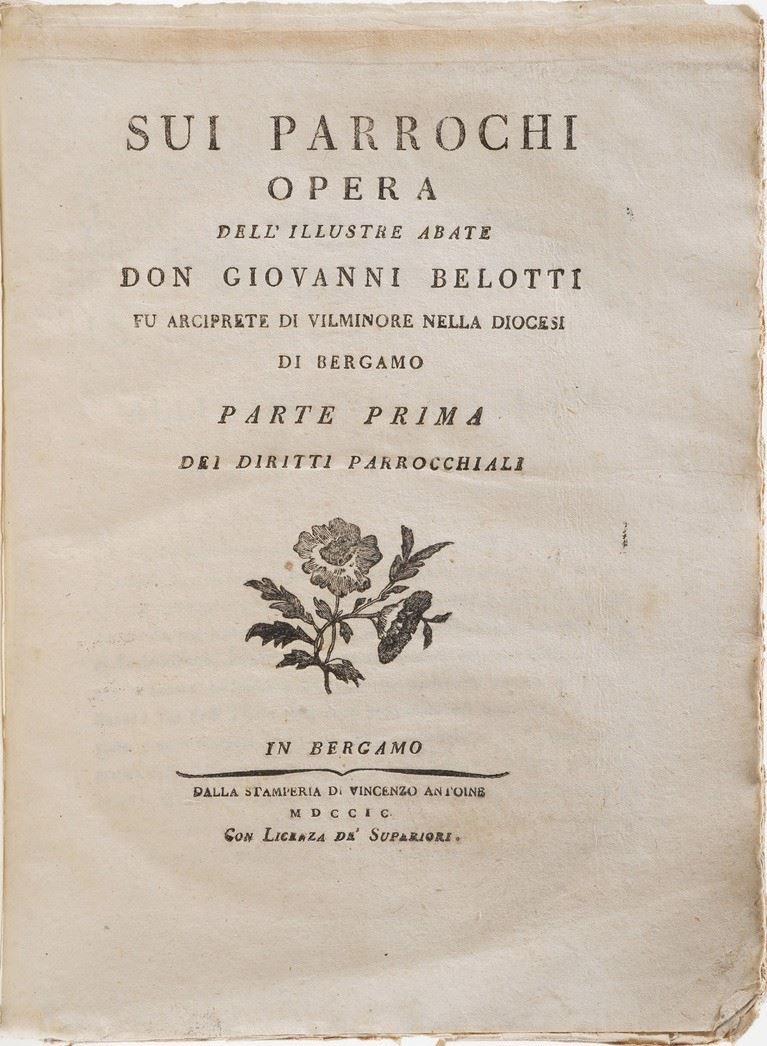 Regolamento delle lezioni caritatevoli di musica, Bergamo, Crescini, 1812; Gio Simone Mayr, Componimenti, Bergamo, Crescini, 1841; Moroni Antonio, Ragionamento Storico intorno alla città di Bergamo, Vincenzo Antoine, 1791; Anonimo, Bergamo La realtà delle cose (scritti anticlericali e liberali), Crema, Tipografia Pantaleone, 1893; Prato Bernardinus, De Vita Servi Dei...Roma, Tipografia salomoniana, 1772; Aavv, Terminazione degli illustrissimi et eccellentissimi signori... Pinelli, 1791; Rottigli Giuseppe Maria, Il penitente degli ultimi tempi... Bergamo, Lancellotti, 1747; Belotti Giovanni, Sui Parrochi... Parti I-II-III rilegate in un volume parte, Bergamo, Vincenzo Antoine, 1799
