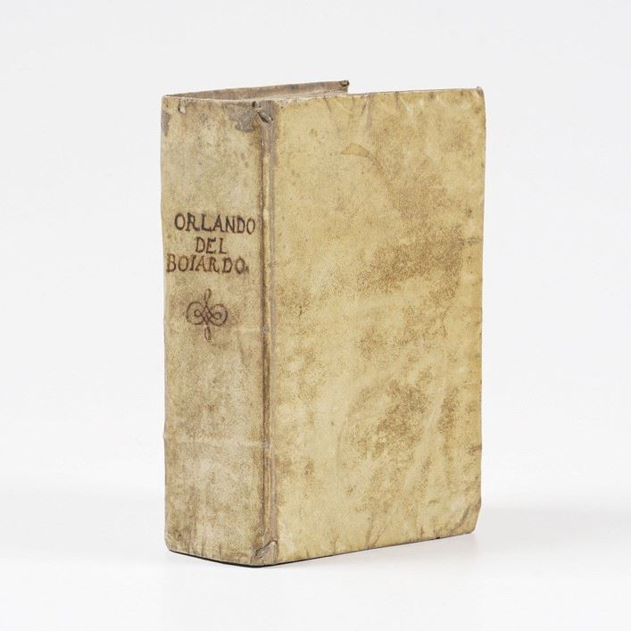 In-8°. Rilegatura coeva in piena pergamena floscia. Titolo manoscritto al dorso. Buon esemplare di questa edizione di gusto popolare del celebre poema cavalleresco, illustrata da belle figure silografiche, intercalate nel testo.