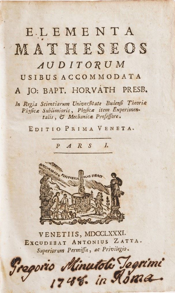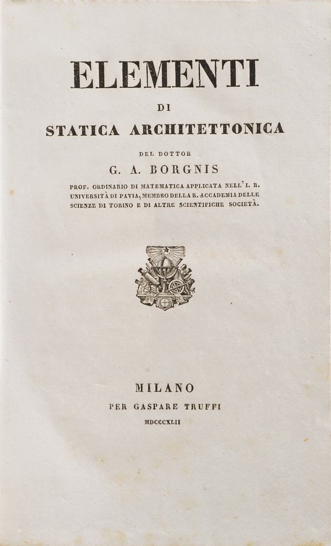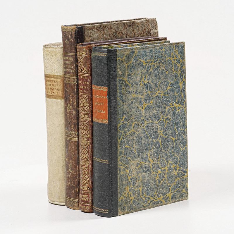 In-8°. Bella rilegatura coeva in marocchino rosso. Ex libris al verso del frotenespizio. Si uniscono nel lotto: Jo Bapt Horvath presb. Elementa Matheseos... Venezia, Zatta, 1781-1782. Parti prima e seconda rilegati insieme; Borgnis, Elementi di Statica Architettonica, Milano, Truffi, 1842; Bordoni Antonio, Degli Argini di terra. Milano, Giusti, 1820