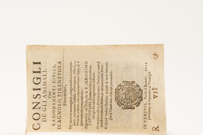 Si aggiungono al lotto: Del Conte Pietro Bonarelli Della Rovere, Discorsi Accademici ; Maolino Bisaccioni; Trattenimenti virtuosi, Ancona, 1667; Emanuele Alvario, De Istitutione Grammatica, Roma, 1541, Ioanni Lodovici, Vivis Valentini, Annover, 1614; Agnolo Firenzuola, Consigli degli animali cioè ragionamenti civili, Venezia, 1622.