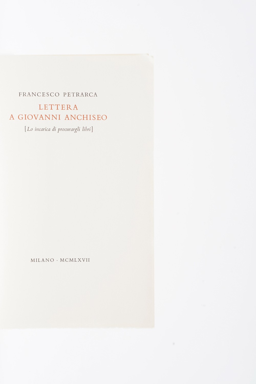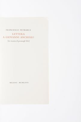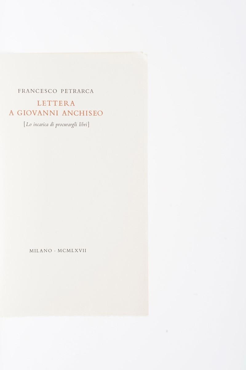In-8°. Rilegatura editoriale in mezza pelle. Tiratura limitata e numerata di 150 esemplari. si aggiunge nel lotto: Petrarca Francesco, lettera a Giovanni Anchiseo edizione speciale realizzata per cura del celebre libraio e antiquario milanese Carlo Alberto Chiesa.