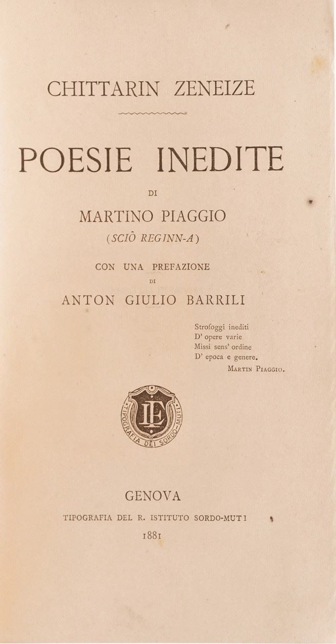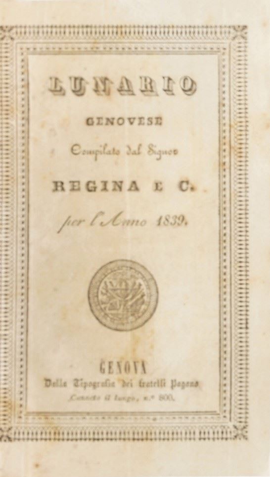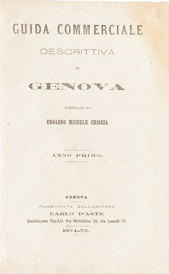 Genova - Autori vari Gazzetta di Genova, 1914-1917, quattro annate complete ben legate; Gervasoni, Elogio dei liguri illustri, Genova, S.N., S.A. (ca. 1880) I vol. solo; Martino Piaggio, Chittarin zeneize, Genova, Sordomuti, 1881 Miscosi, Origini italiche, Genova, Marsano, 1834 Chiozza, Guida commerciale di Genova, Genova, D'Aste, 1874 Regina, Lunario genovese, Genova, Pagano, 1839