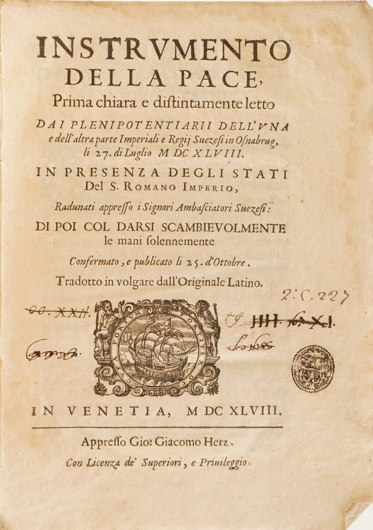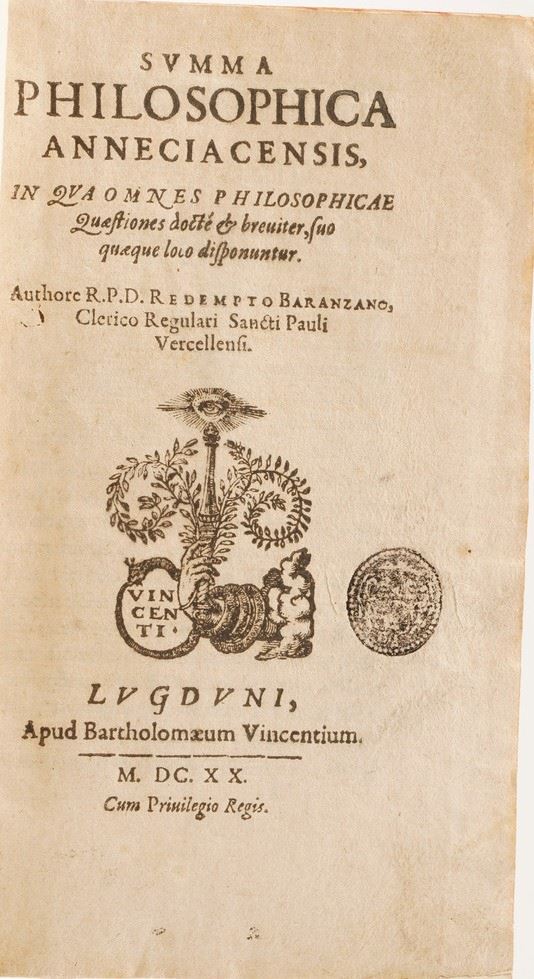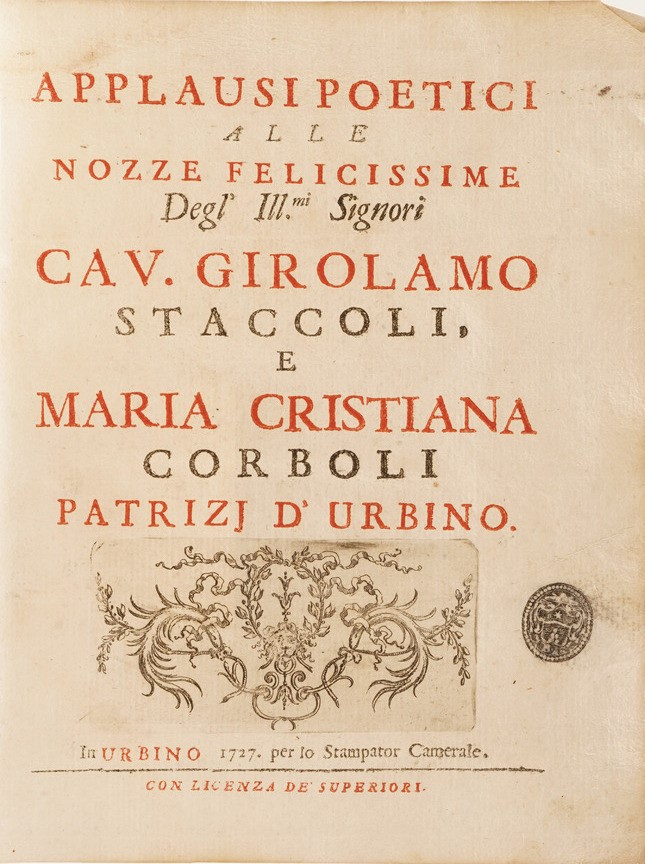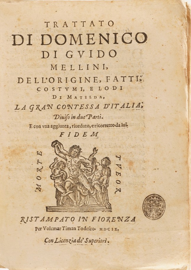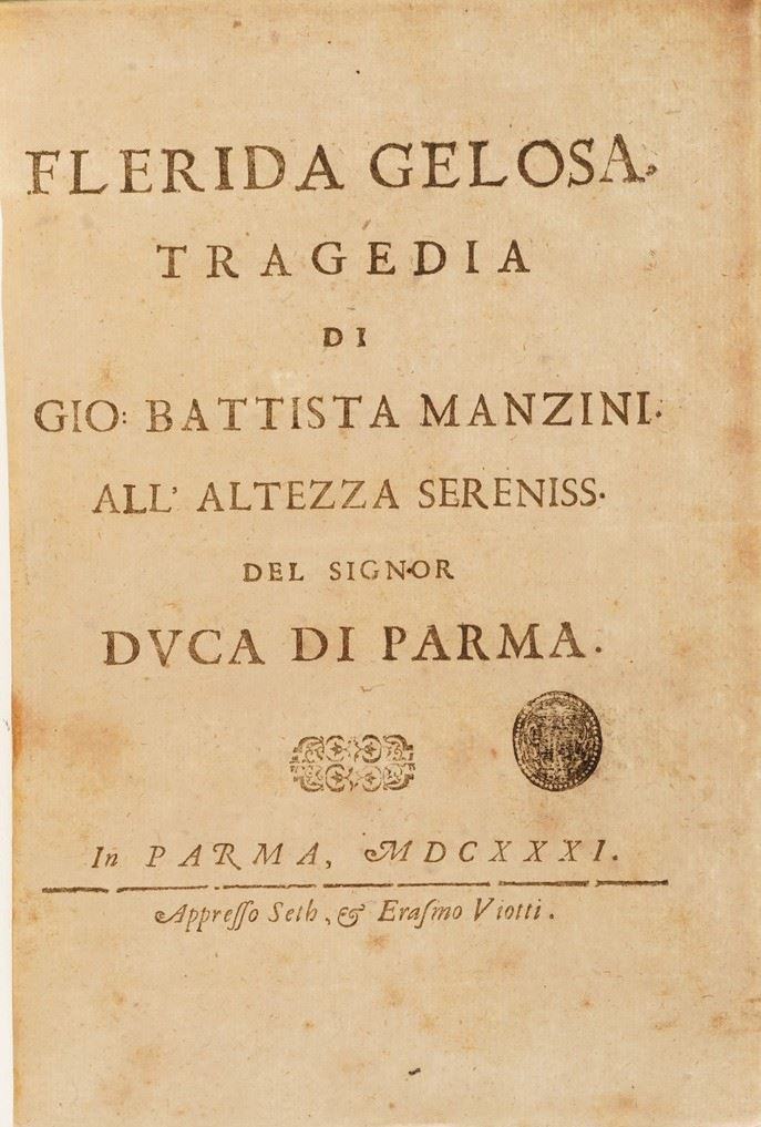 Si aggiungono al lotto: Summa Phlilosophica Anneciacensis, 1620; Rex Mundanorum Ominum, 1616; Gio Domenico Ottonelli, Risposta al Quesito che male sia l’andare conversazione in casa di una persona poco modesta, Firenze 1645; Tributo di lode alle gloriossissime azioni di Massimiliano Emanuele Duca di Baviera, Roma 1694; Trattato di Domenico Di Guido dell’origine, fatti, costumi e lodi di Matelda, Firenze 1609; Applausi Poetici alle nozze felicissime degli ill.mi signori Cav. Girolamo Staccoli e Maria Cristina Corboli, Urbino 1727; Flerida gelosa di battista Manzini, 1631; Instrumento della pace, Venezia 1668; Commentari bellici, 1595; Remarques sur la lingue Francoise, 1667 si aggiunge Paganini Gaudentii I.C. In inclyto Pisarum Athenaeo Eloquentiae Professoris. Obstetrix Literaria, Firenze,Typis Nouis Massae, 1638 (ex libris xilografico).