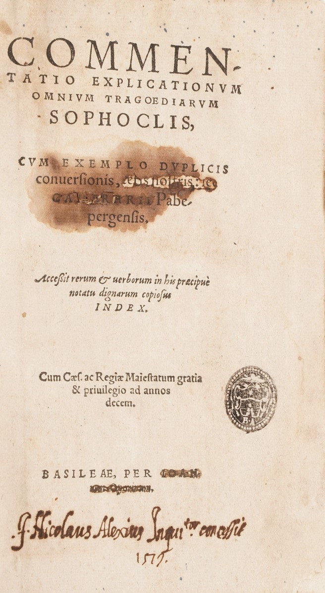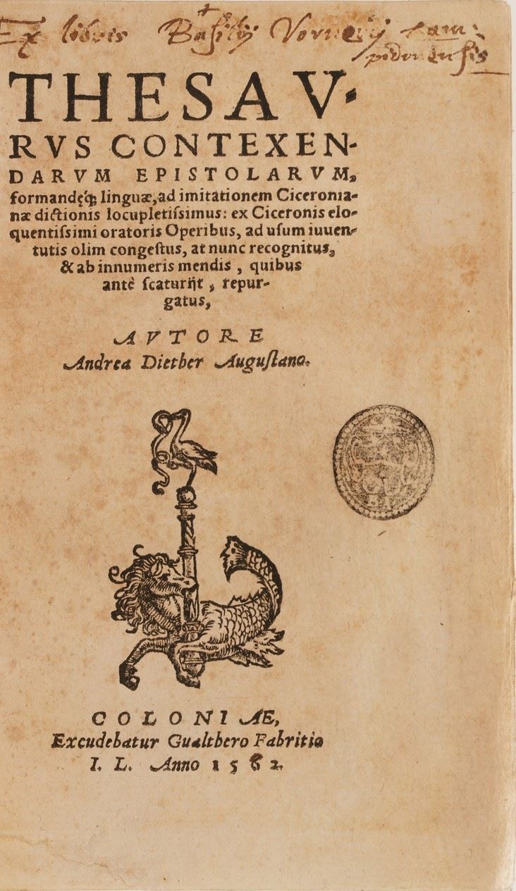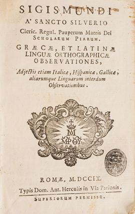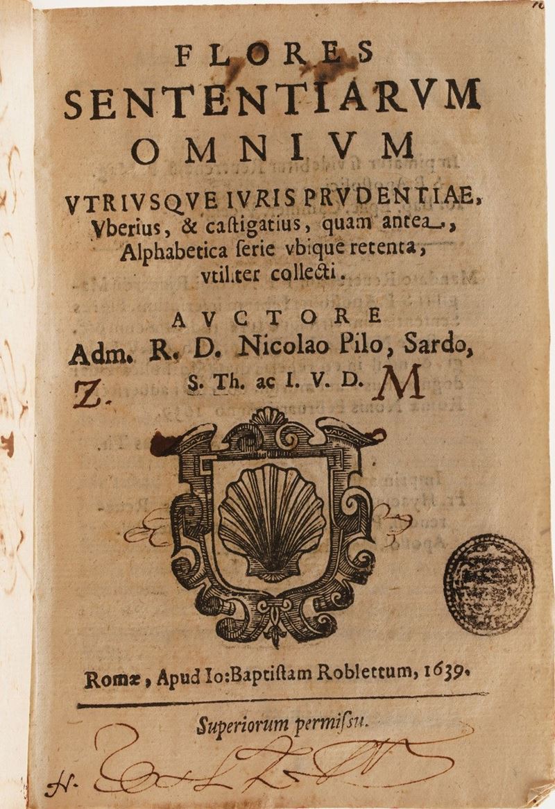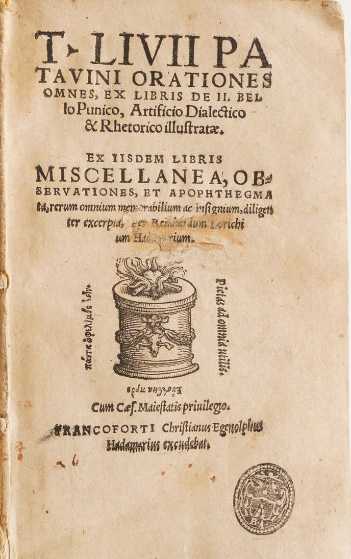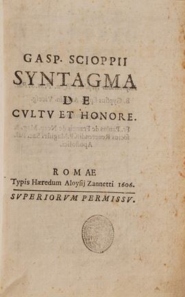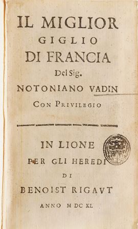 Si aggiungono al lotto:Commentatio Explicathionum Omnium Tragioediarum Sophoclis ... Basilea; Il Miglior Giglio di Francia Del Sig. Notoniano Vadin, In Lione Per gli Heredi di Benoist Rigaut, 1640;T. Livii Patavini Orathiones ... Francoforte;Flores Sententiarum Amnium ... Roma 1639; Memoires de Danne Mark, Utrecht; Dialoghi di varia lezione ... in Firenze, 1638; Gasp. Scioppii Syntagma De Cultu Et Honore, Roma 1606, Thersaurus Contexendarum Epistolarum, Andrea Dietber, Colonia 1582; De Literis Libri Duo, Jacobo Matthie, Basilea; Sigismundi a Santo Silverio ... Roma 1709; Lettre a Monseigneiur le Vesque de Troyes, 1750