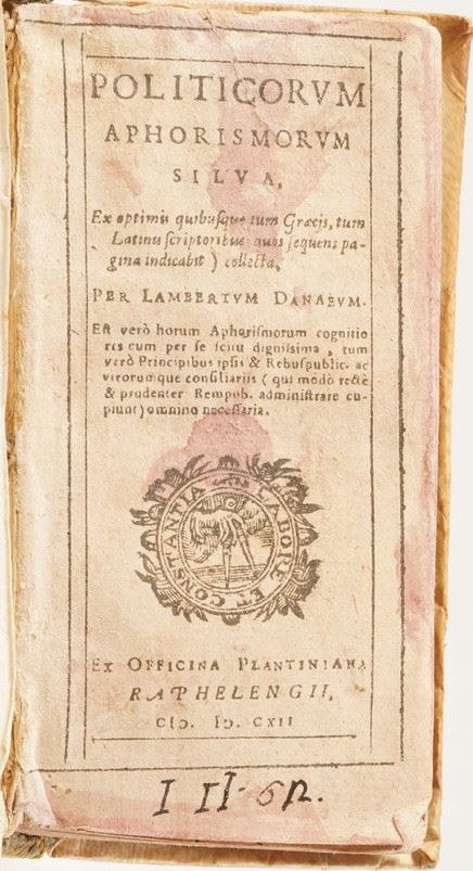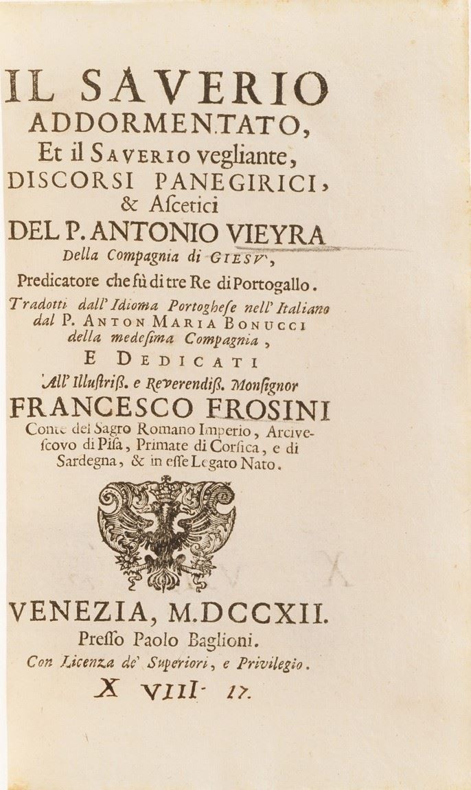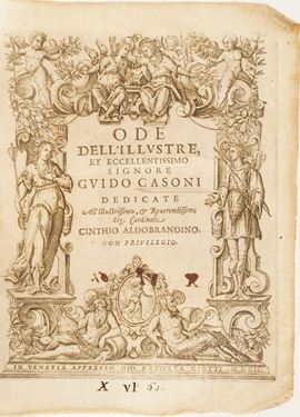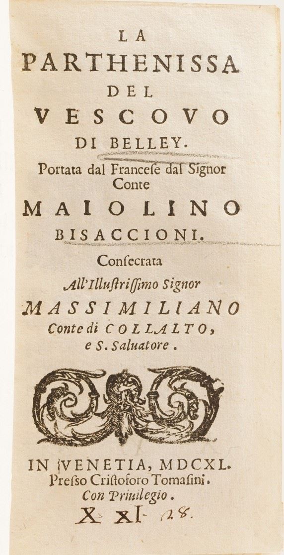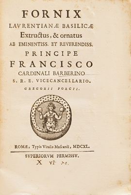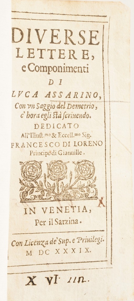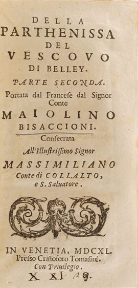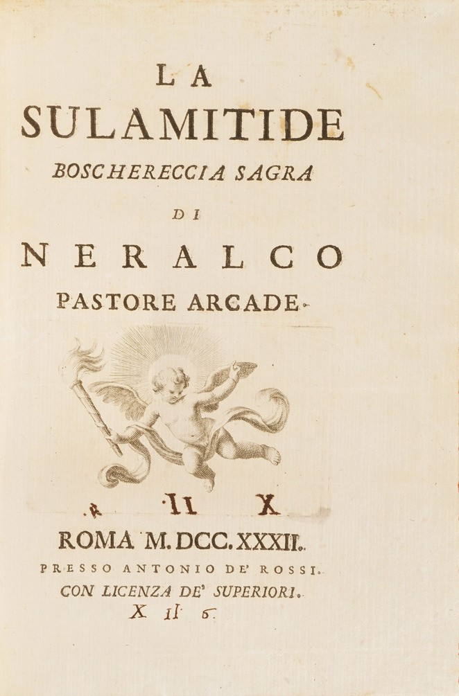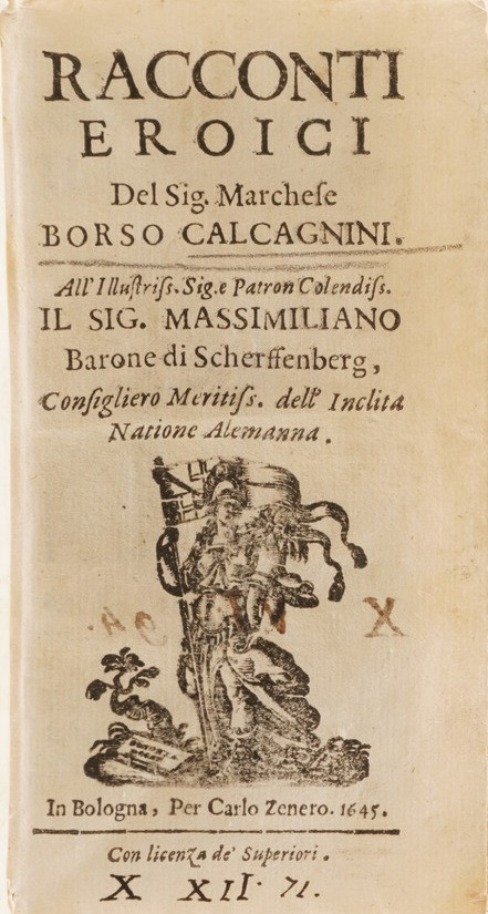 La Parthenissa del Vescovo di Bellei, in Venezia 1640; Illustrium Poetarium Flores, Lugduni 1614; La Scuola della Verità aperta á Prencipi ... Bologna 1652; C. Plinii, Sec. Epist. Lib. IX ... 1604; Politicorum Aphorismorum Silva ... Ex Officina Plantiniana; Diverse lettere e componimenti di Luca Assarino ... in Venezia per il Sarzina 1639; Racconti eroici del Sig. Marchese Borso Calcagnini ... in Bologna per Carlo Zenero 1645; Avis Des Interesse aux Habitans Des Pais Bas; Ode dell’Illustre ed eccellentissimo Signore Guido Casone, in Venezia appresso Giò Battista Ciotti 1602; Indicazione Antiquaria per la Villa Suburbana dell’eccellentissima Casa Albani, in Roma 1785; La Sulamitide Boschereccia Sagra di Neralco Pastore Arcade, Roma 1732; Herodiade Tragedia del Signor Giovan Battista Marti ... In Fiorenza appresso Francesco Tosi, 1594; Dialoghi sull’Economia, Firenze Apud Caietanum Cambiaagi, 1797; Il Saverio Addormentato e il Saverio Vegliante del P. Antonio Vieyra, Venezia 1712 si aggiunge Fornix Laurentianae basilicae, Romae, Typis Vitalis Mascardi, 1640.