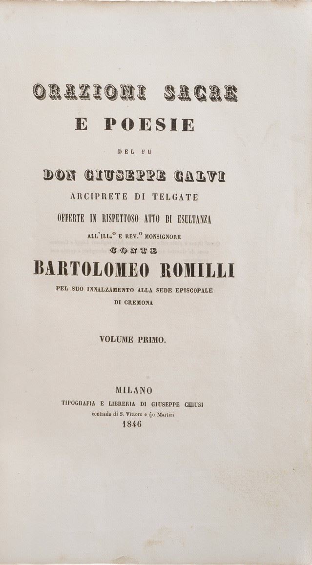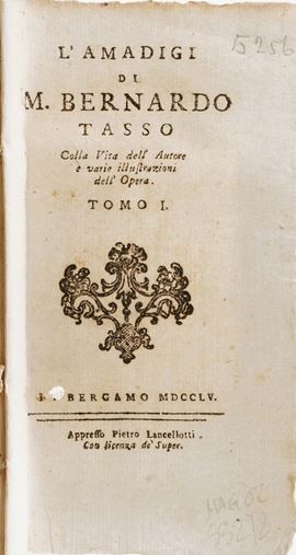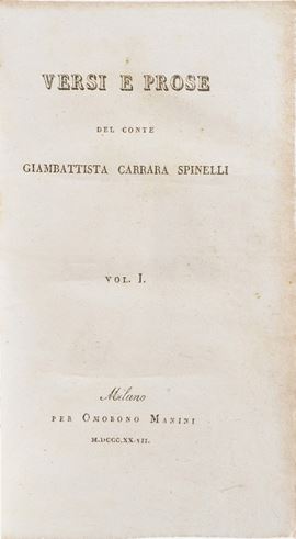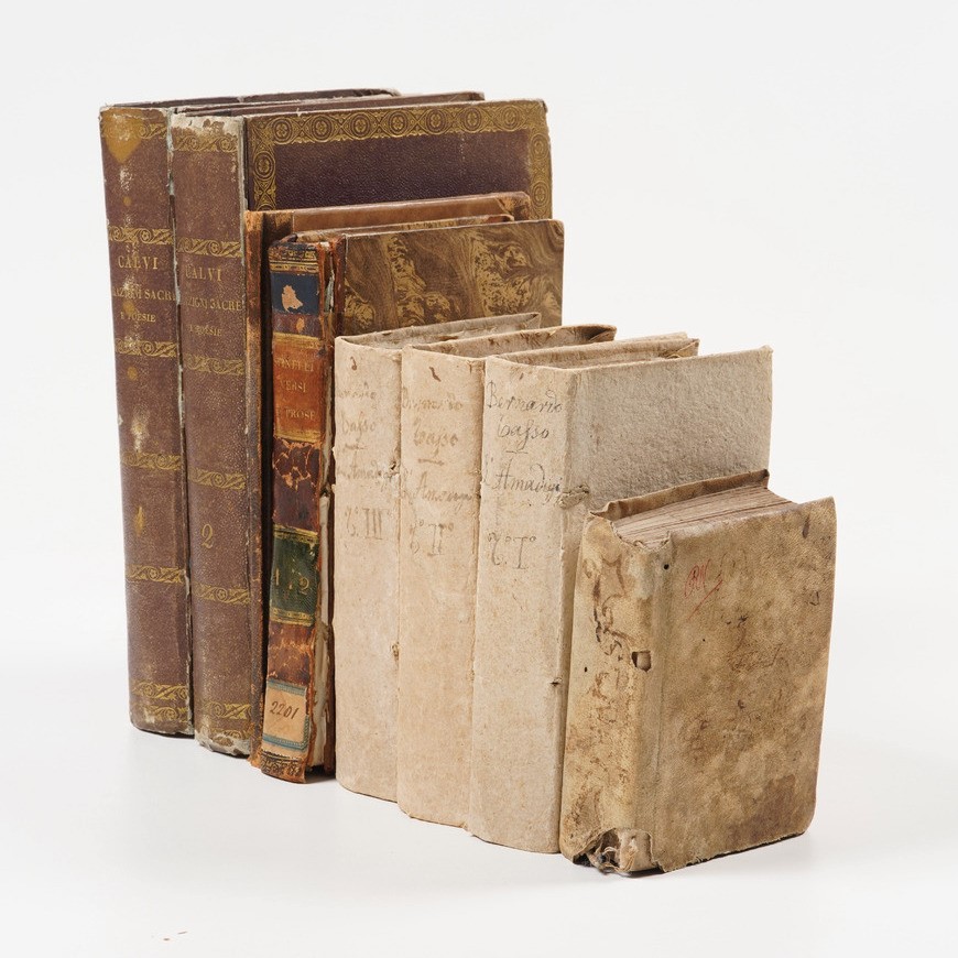 In-8°. Rilegatura moderna in mezza pelle e punte. Si uniscono nel lotto: Calvi Giuseppe, Orazioni sacre e poesie, volumi I e II, Milano, Giuseppe Chiusi, 1846; Spinelli Gian battista Carrara, versi e prose, Milano, Manini, 1827; Bernardo Tasso, L'Amadigi, 3 tomi, Bergamo, Lancellotti, 1755; Seneca, Tragedie, Bergamo, eredi di Antonio Rossi, 1674