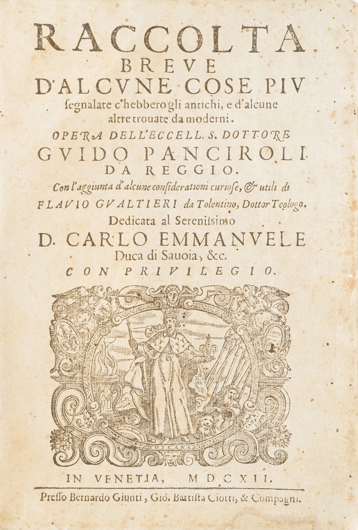 Panciroli Guido Raccolta breve di alcune cose più segnalate che ebbero gli antichi...Venezia, Giunti e Ciotti, 1612.