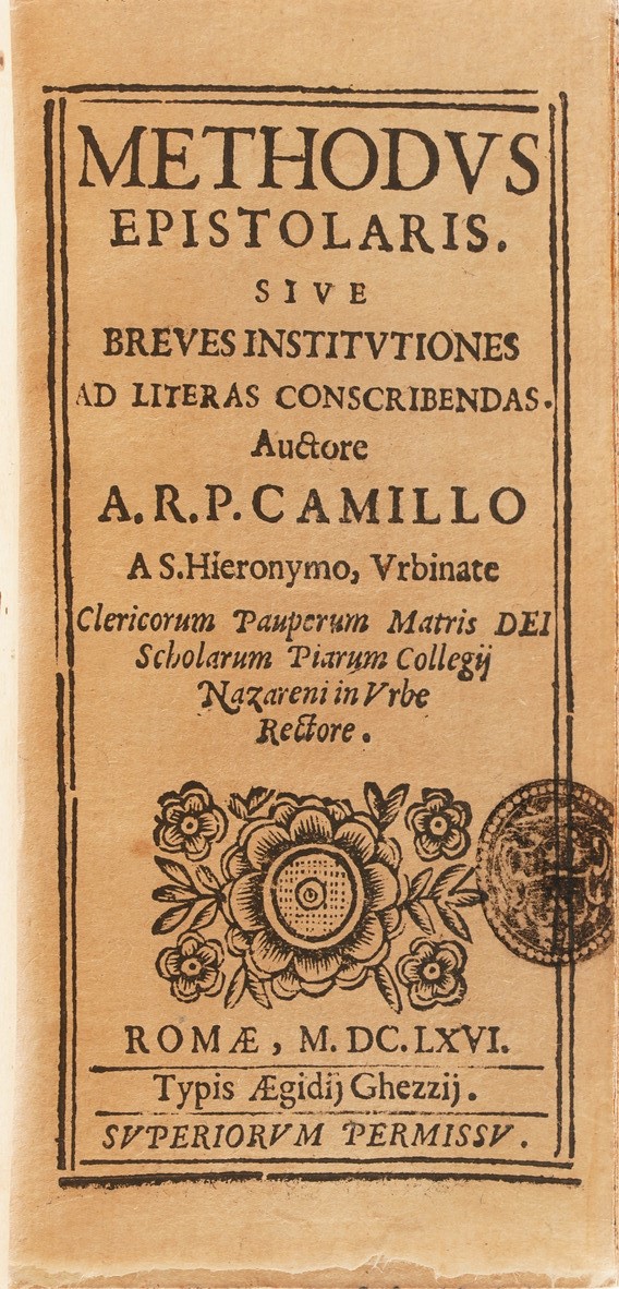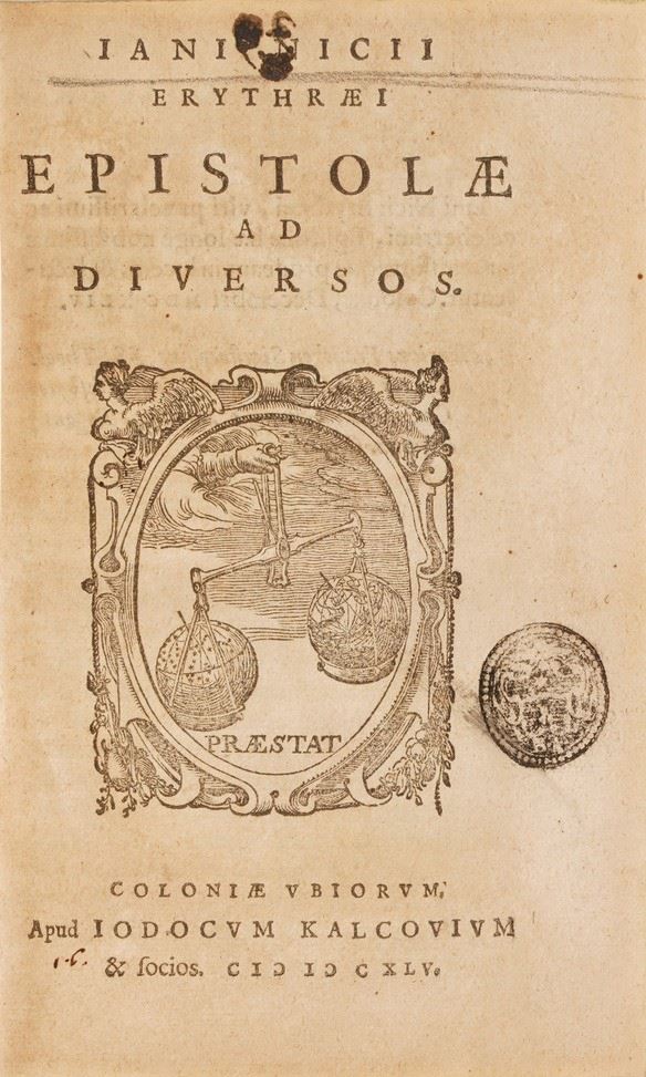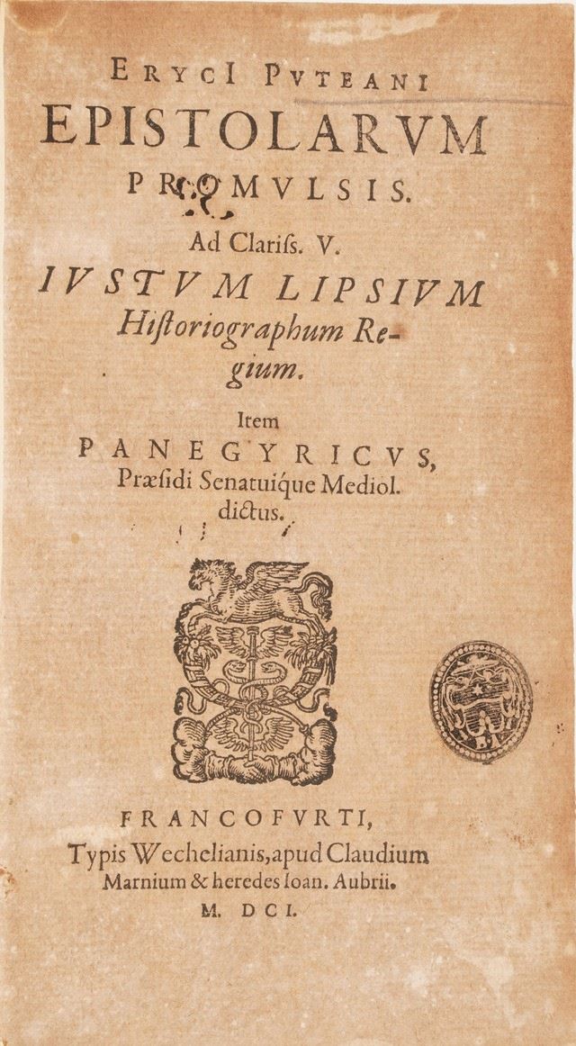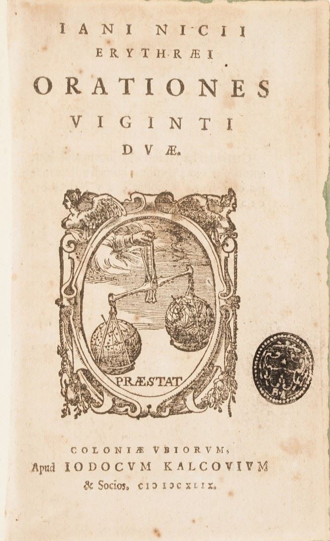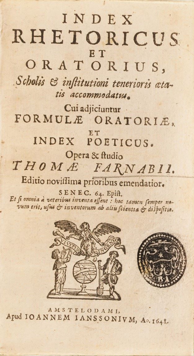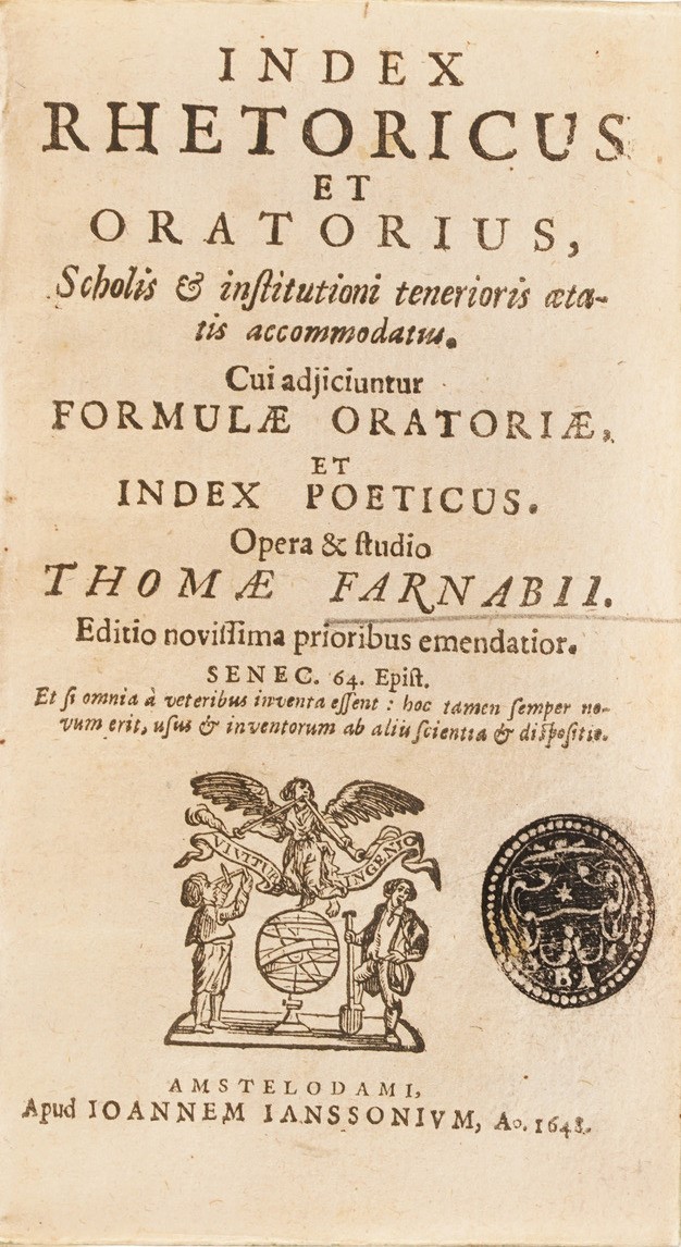Suffrido Petro, De scriptoribus Frisiae, Apud Henricum Falckenburh, Anno 1293; P. Scriverii, Animaduerisones in Martialem, Lugduni Bataorum, Apud Ioannem Marie; Discorsi del C.Guidobaldo Bonarelli della Rovere in difesa del doppio amore della sua Celia; Iani Nicii Erythraei, Orationes Viginti Duae, Apud Ioducum Kalcovium; Erycli Puteani, Epistolarum Promulsis, Francoforte, 1601; Francisci Nigri, De Conscribendis Epistolis tractatio, Venezia, 1588; Epistolae ad diversos, Apud Ioducum Kalkovivium; Methodus epistolaris sive brevis istitutiones, Roma 1646; De formarum origine Guglielmi Pembelli, Londra 1629; Index hetoricus et oratorius, Amsterdam 1648; Oratio Paraenetica de avctoritate regnum et principum afferenda bellorum causis in Europa, 1619; Novvelle Methode pour apprendre facilment et peu de temps la lingue italienne, Lione 1672; Onomasticon latino-graecum in sum gymnasiorum societatis iesu concinnatum, Avignone 1646; S.D.N Gregorii XV, Epistola ad persarum regem Sciahabbas, 1627