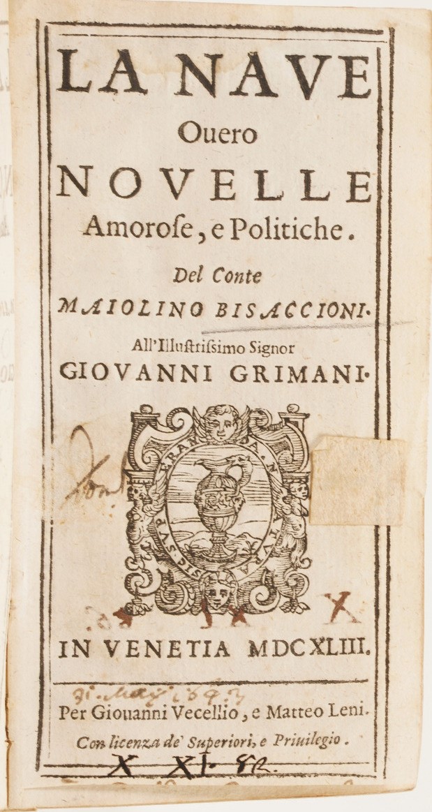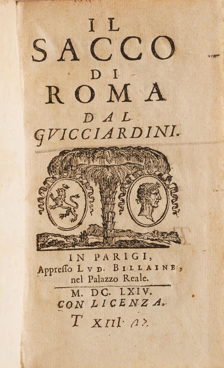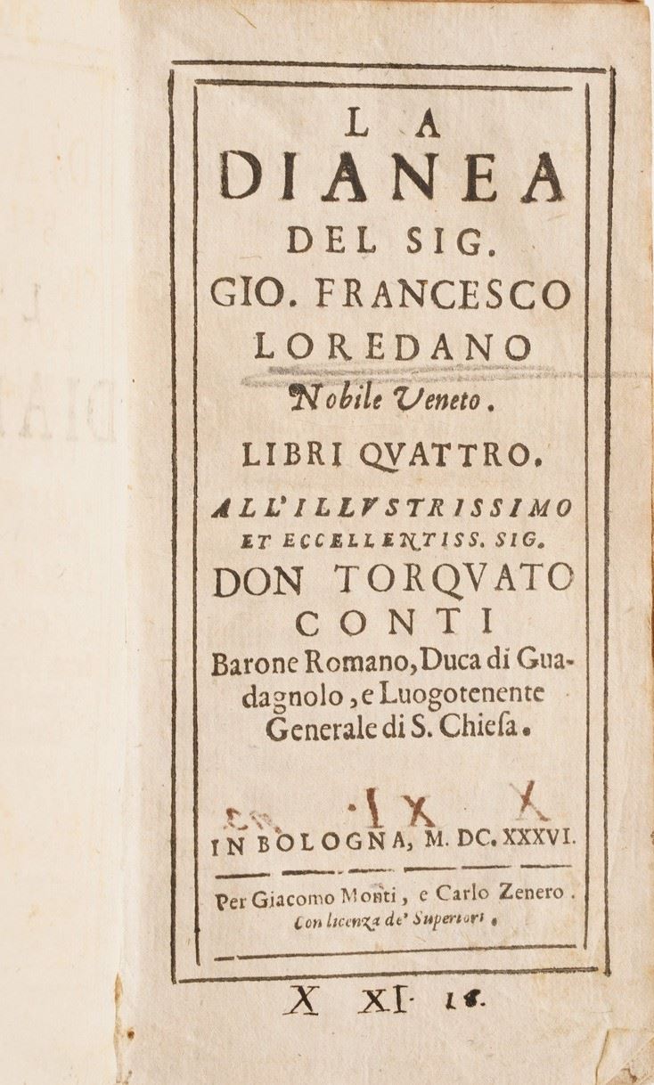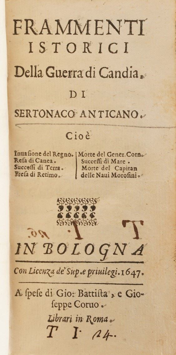 Si aggiungono al lotto: Io. Stephani Sicinianensis compendium regularum, Venezia 1639; Il Sacco di Roma dal Guicciardini, Parigi 1664; Vita del conte Guidubaldo Bonarelli Della Rovere; Sertonaco Anticano, Frammenti Istorici Della Guerra di Candia, Bologna 1647; Giò Francesco Loredano, La Dianea, Bologna 1636; Maiolino Bisaccioni, La Nave Ouero Novelle Amorose e Politiche, Venezia 1643; Le Rime del sig. Balducci, Roma 1645; Maiolino Bisaccioni, La Cleopatra, Venezia 1672; M. Tulii Ciceronis, Oratiorum pars tertia, 1507; Horatius M. Antonii Mureti in eum scholia sive annotationes, Venezia 1542.