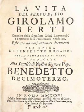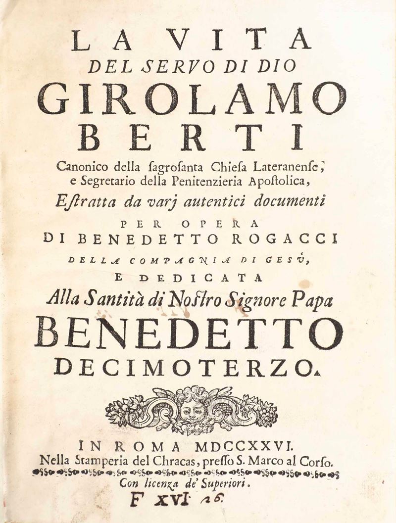 Rogacci Benedetto La vita del servo di Dio Gerolamo Berti in Roma della stamperia del Chracas 1726