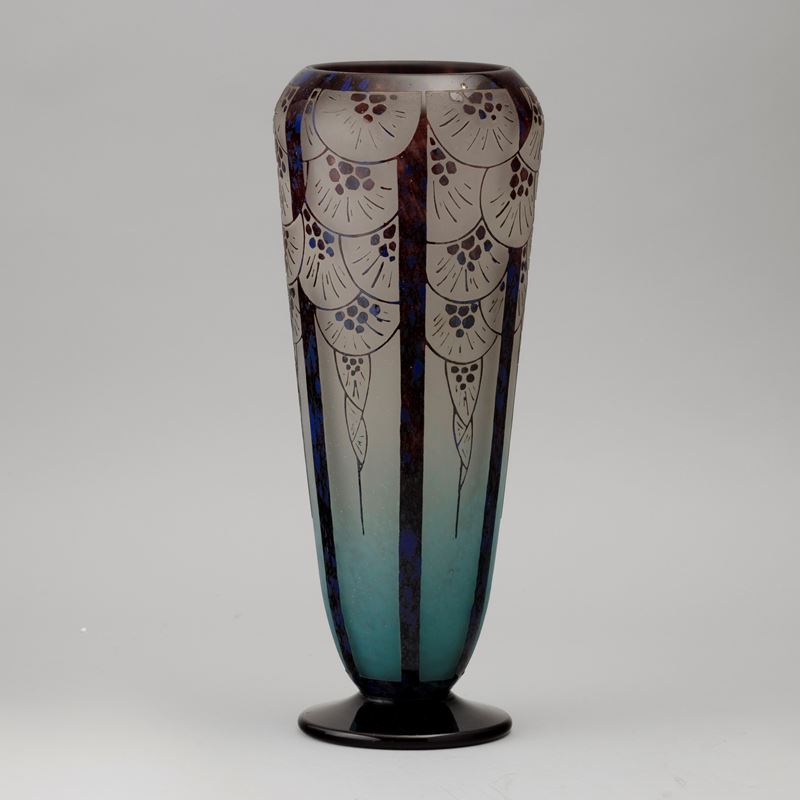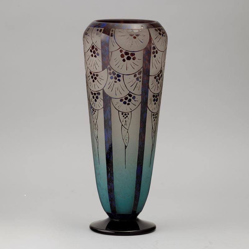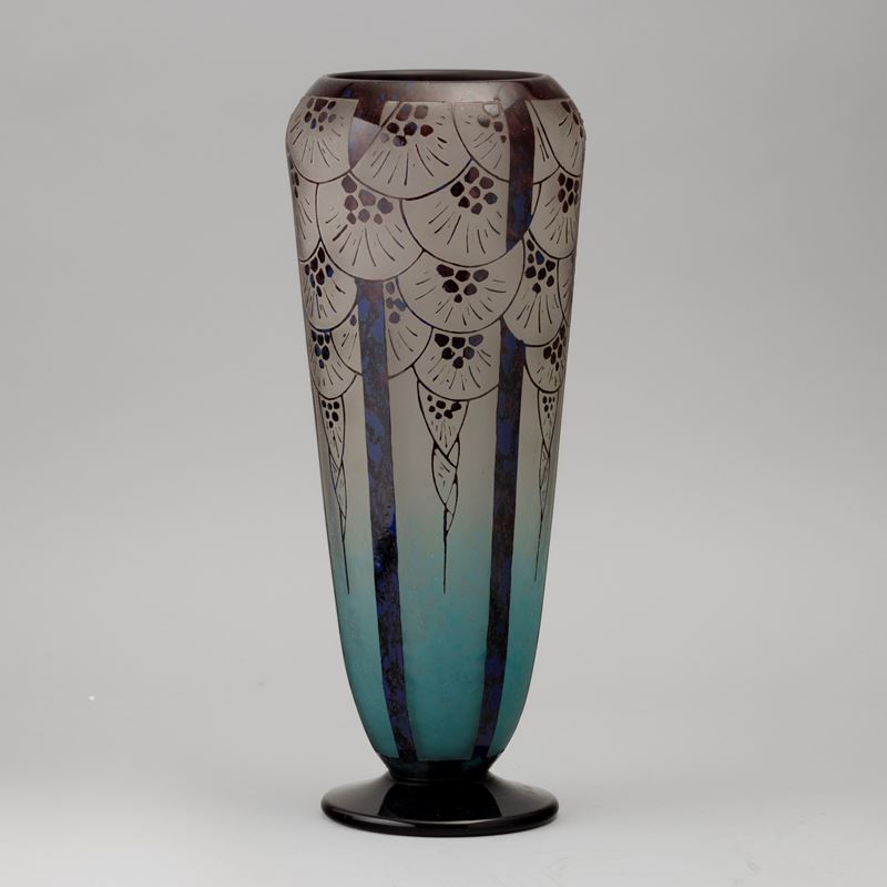 A cameo glass vase with an outlined decor. Engraved signature