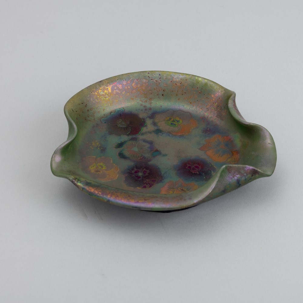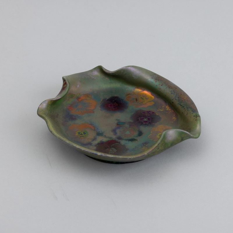 A ceramic leaf-shaped bowl with a polychrome luster decor. Engraved signature