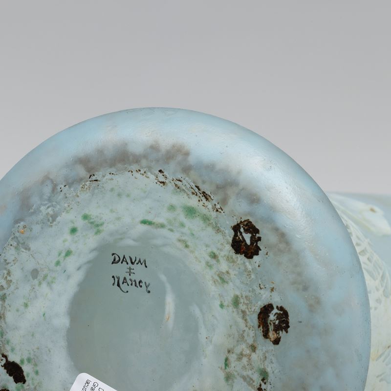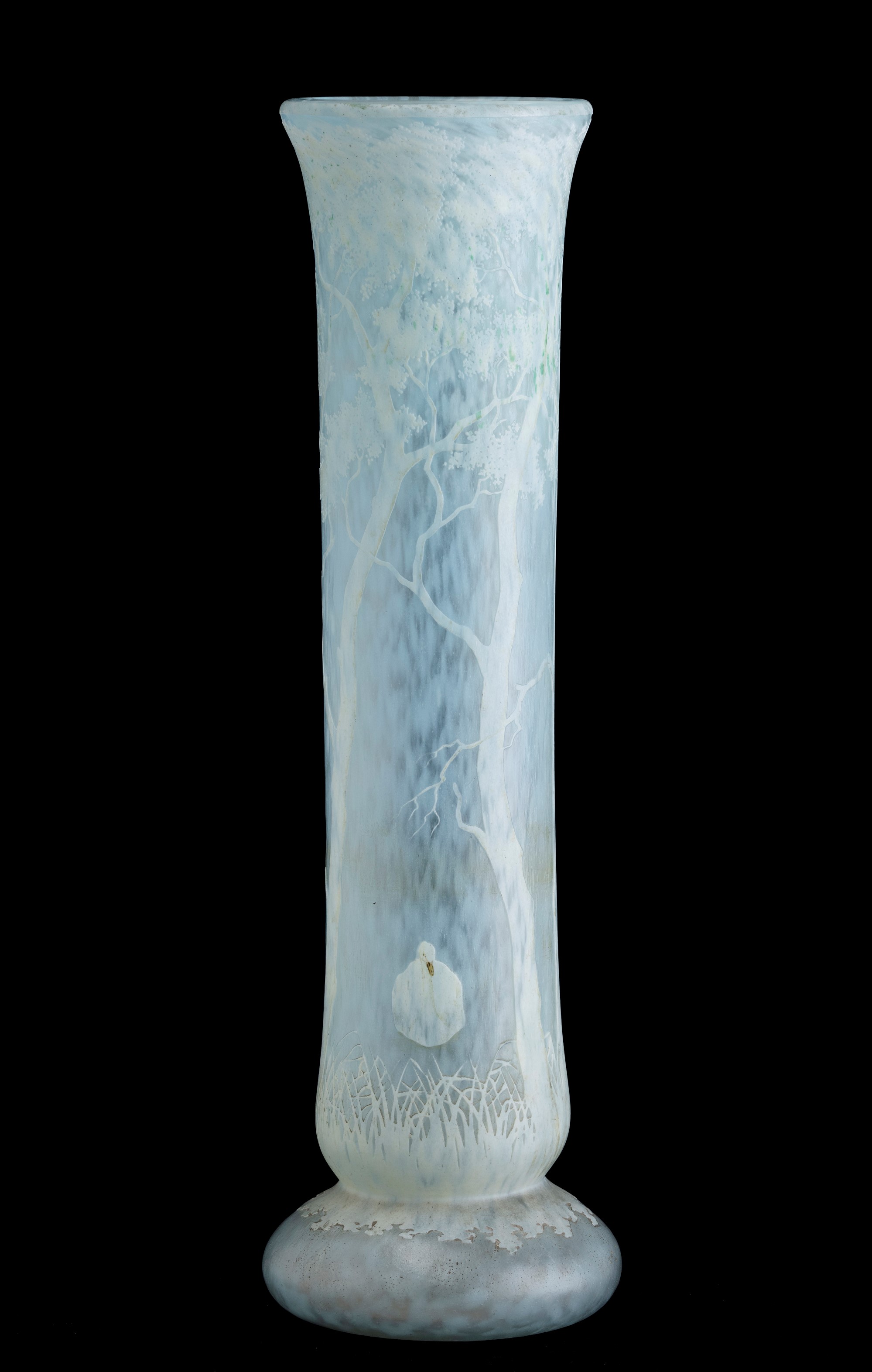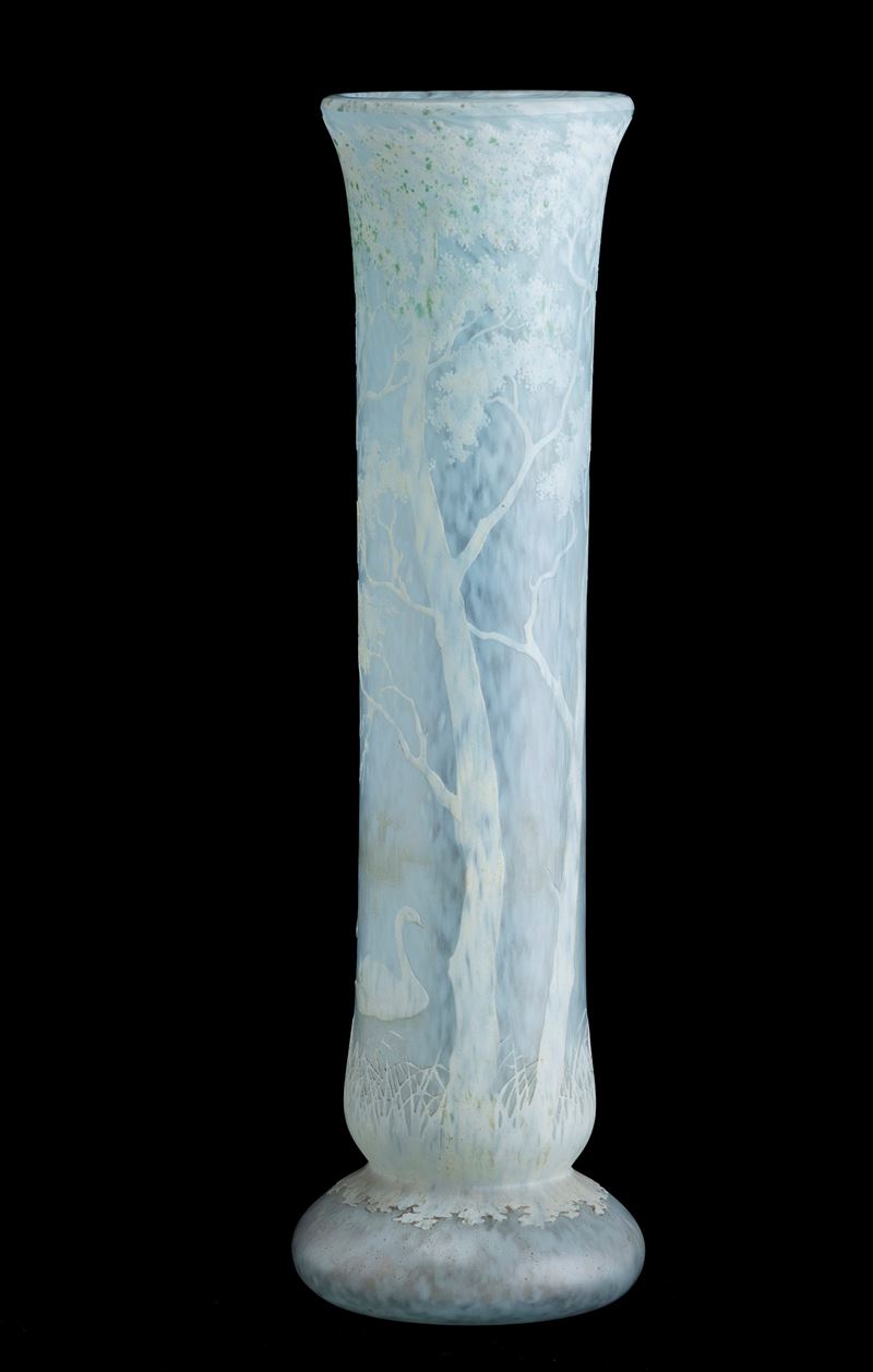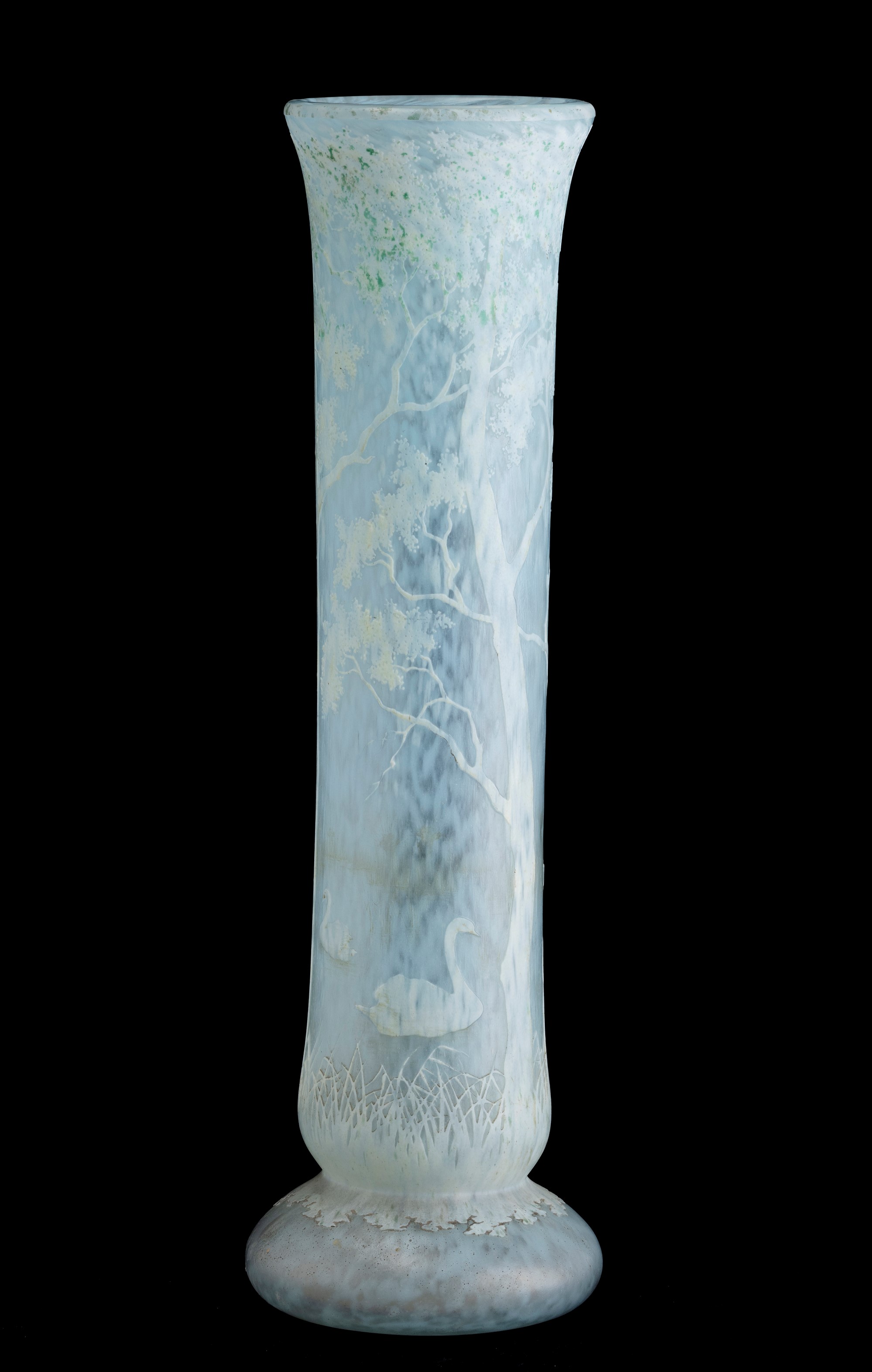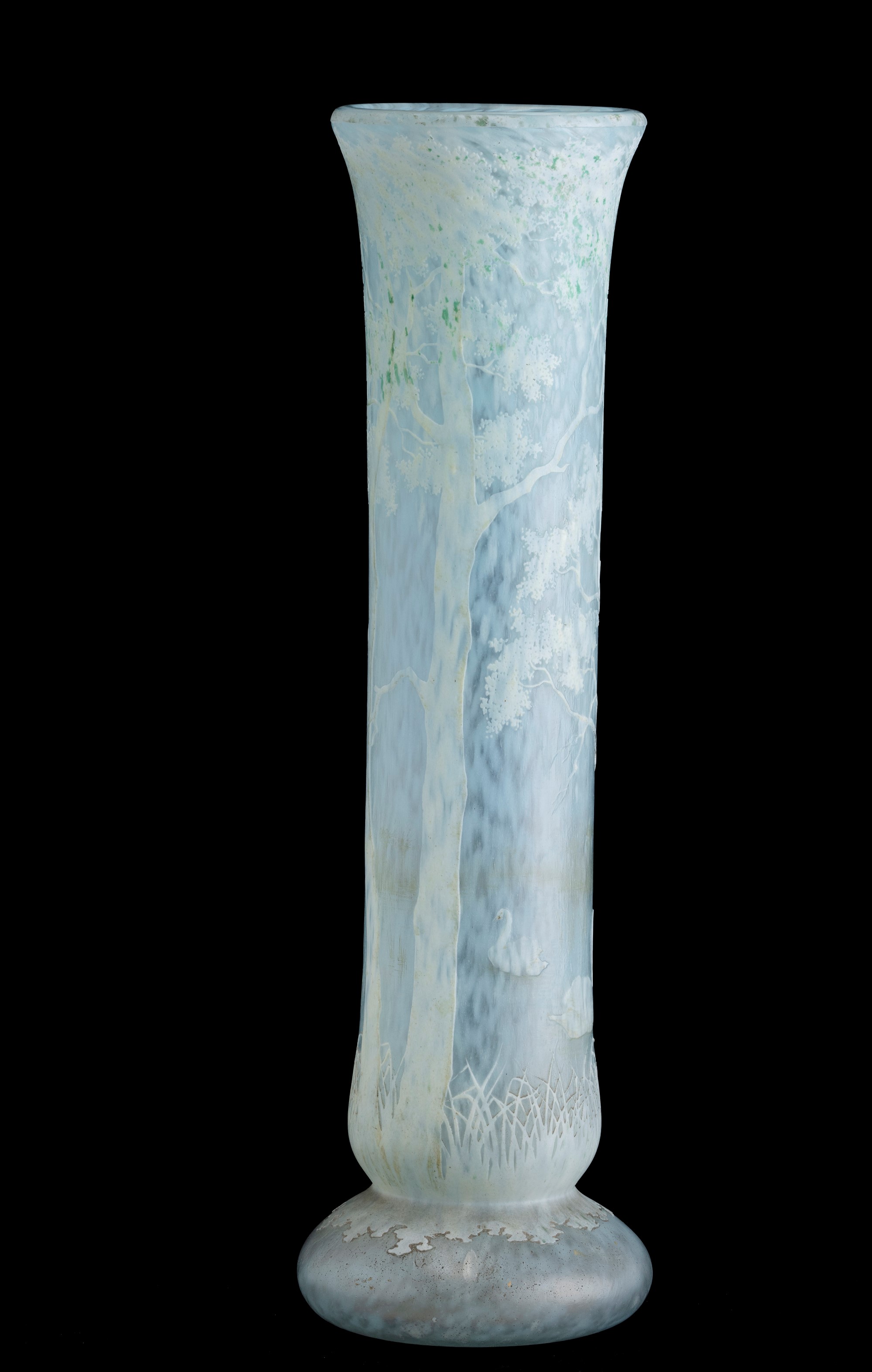 A cameo glass vase with a decor of a lake and swans. Enamelled signature
