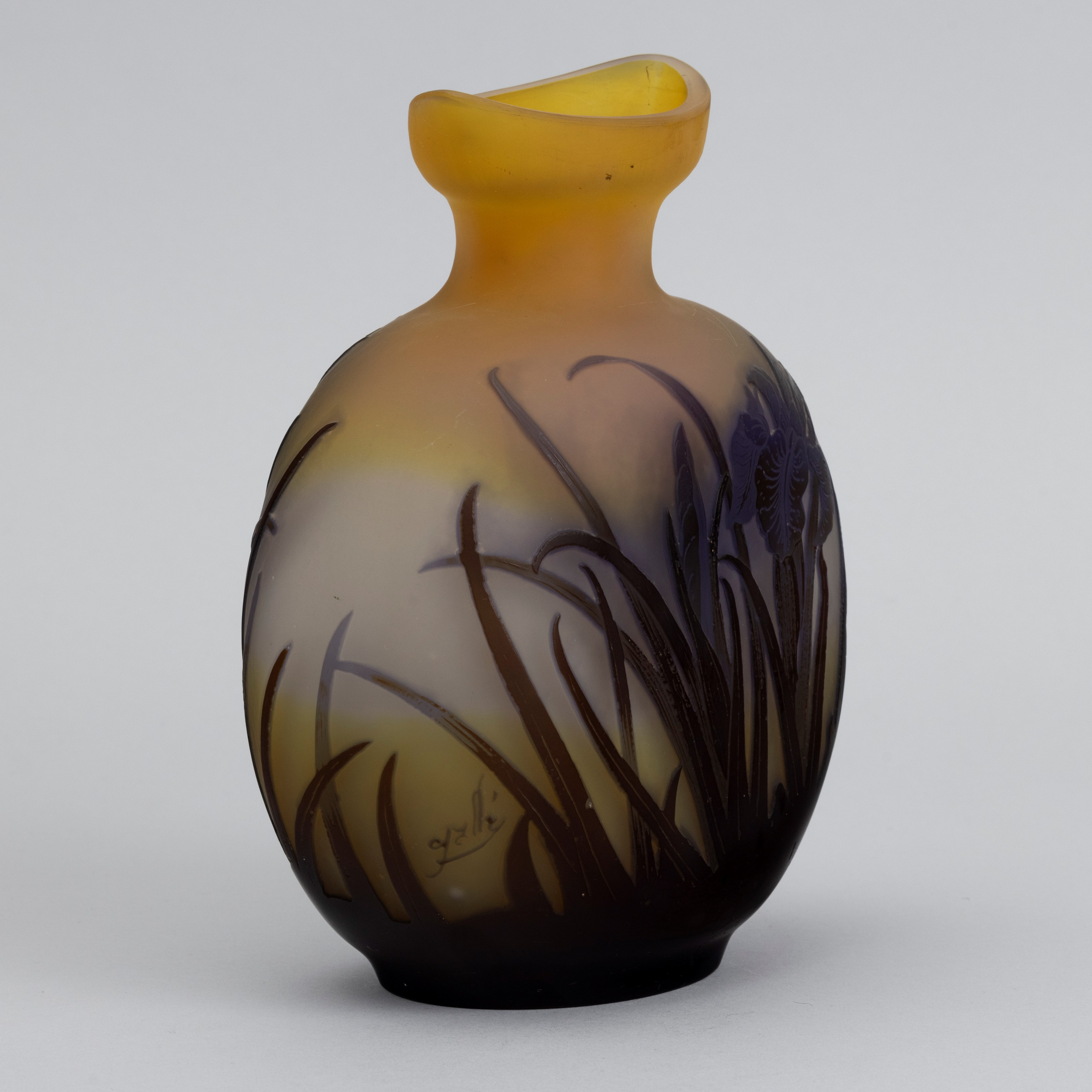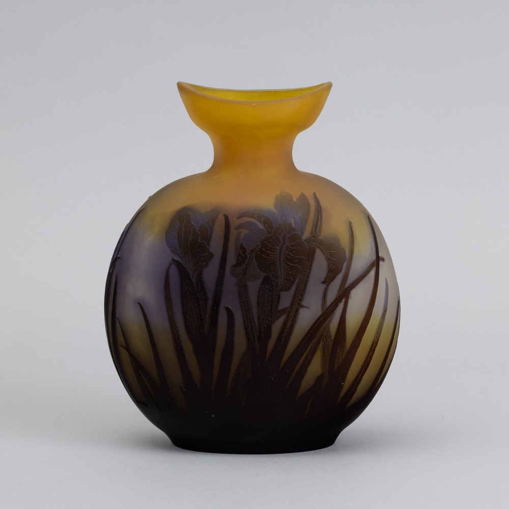 A cameo glass vase with a decor of irises. Embossed signature