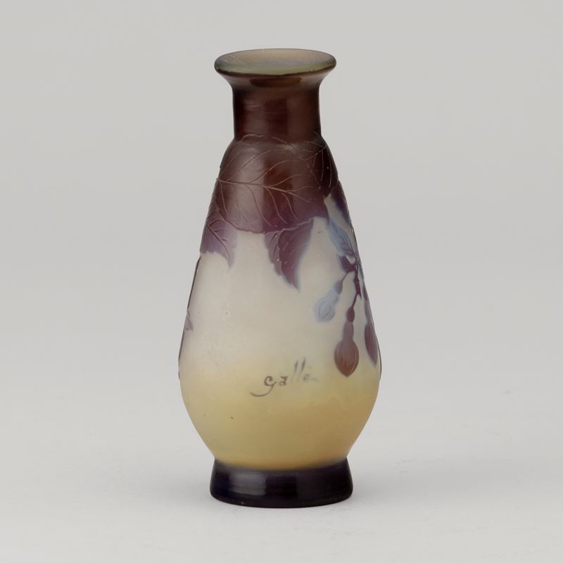 A small cameo glass vase with a decor of fuchsias. Embossed signature