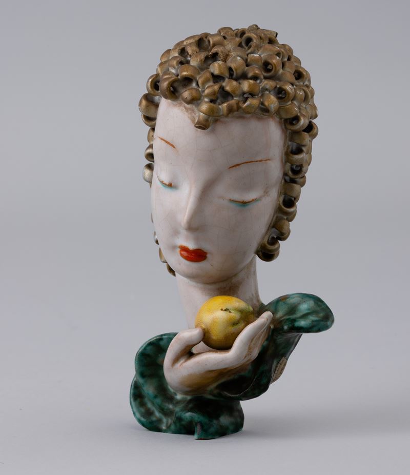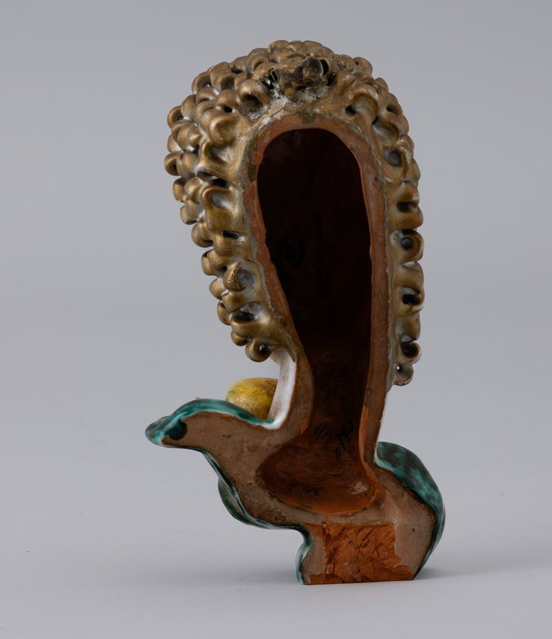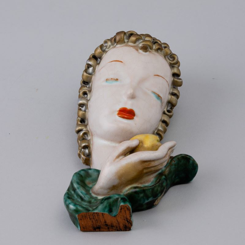 A majolica-tiled terracotta profile of a woman with a polychrome enamel decor. Maker's mark and label