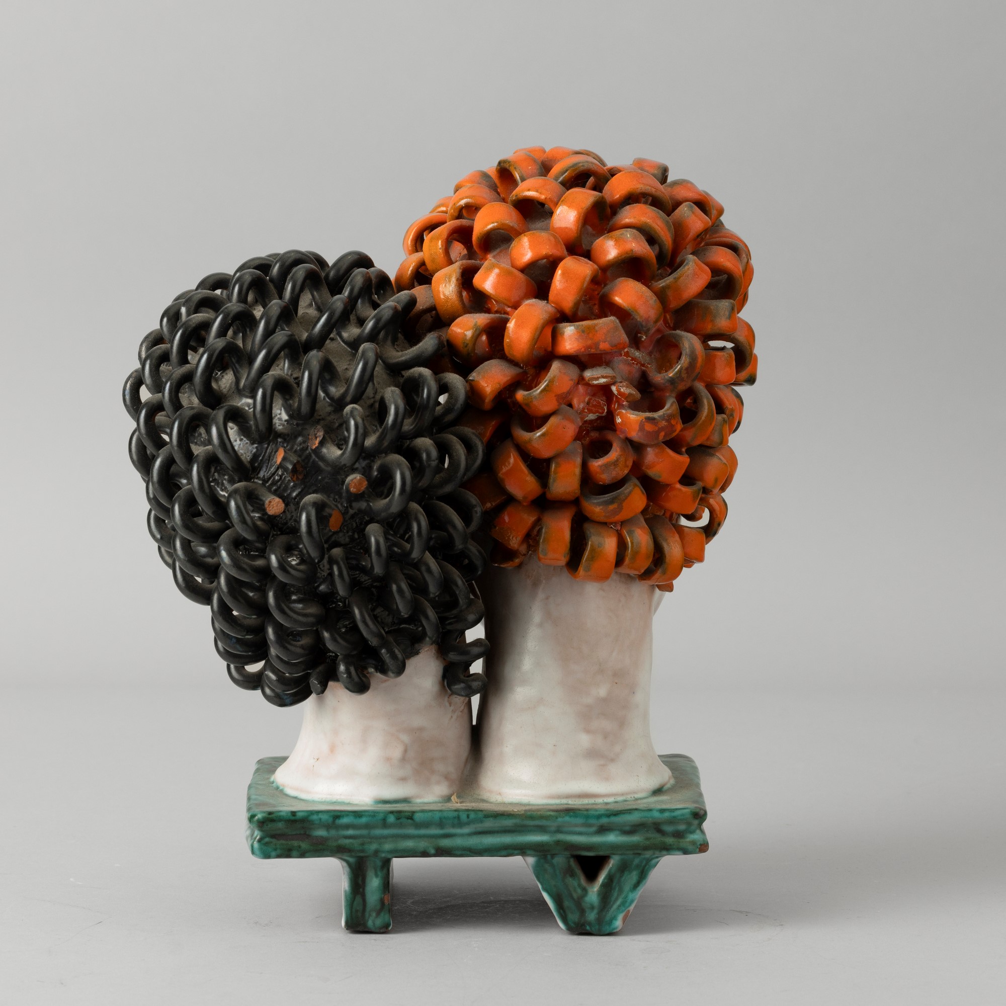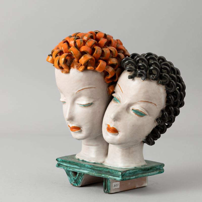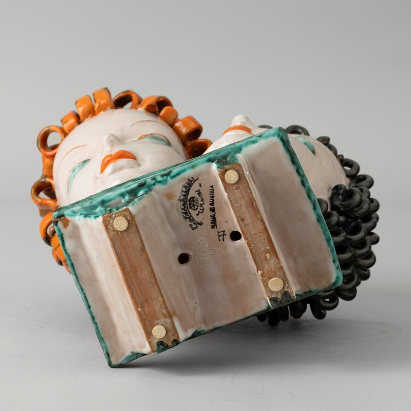 Two majolica-tiled terracotta women heads with a polychrome enamel decor. Maker's mark. Faults