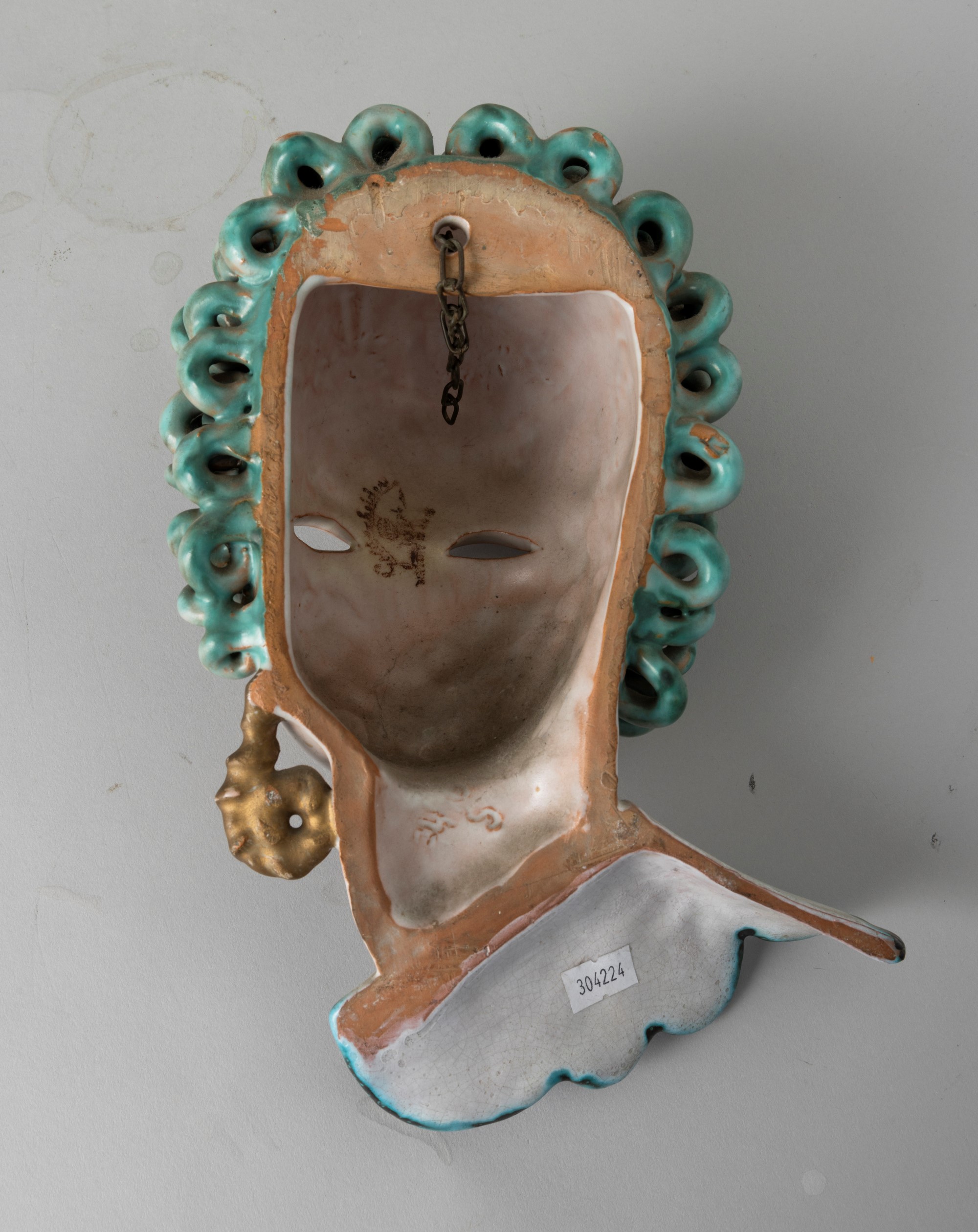 A majolica-tiled terracotta profile of a woman with a polychrome enamel decor. Maker's mark. Faults