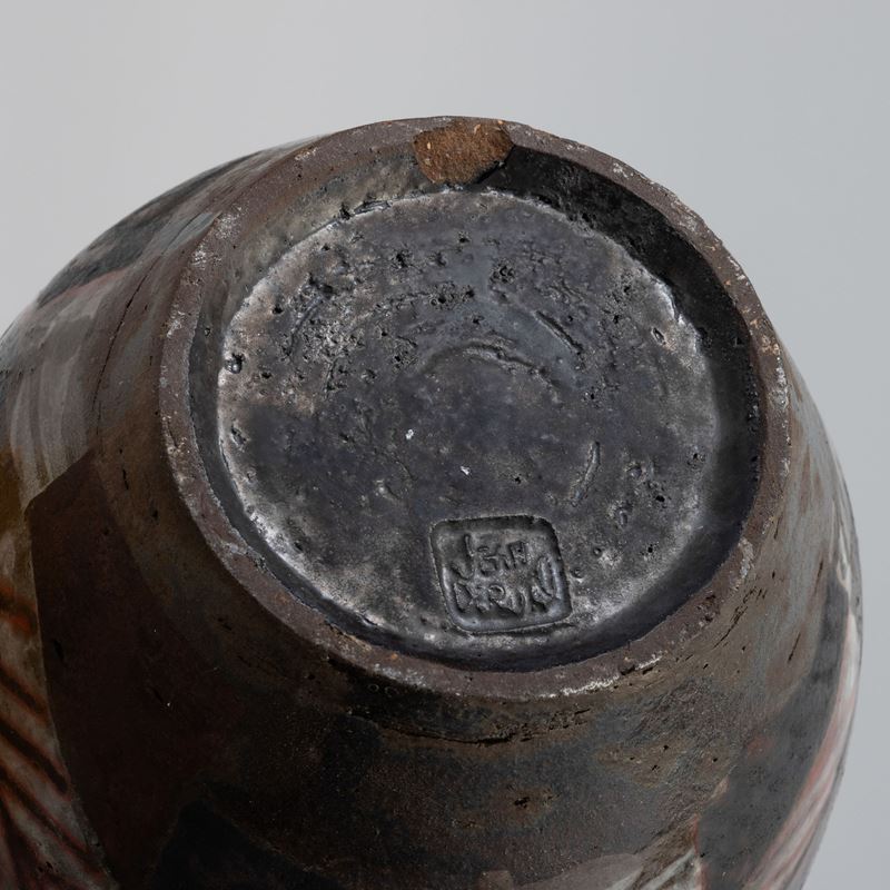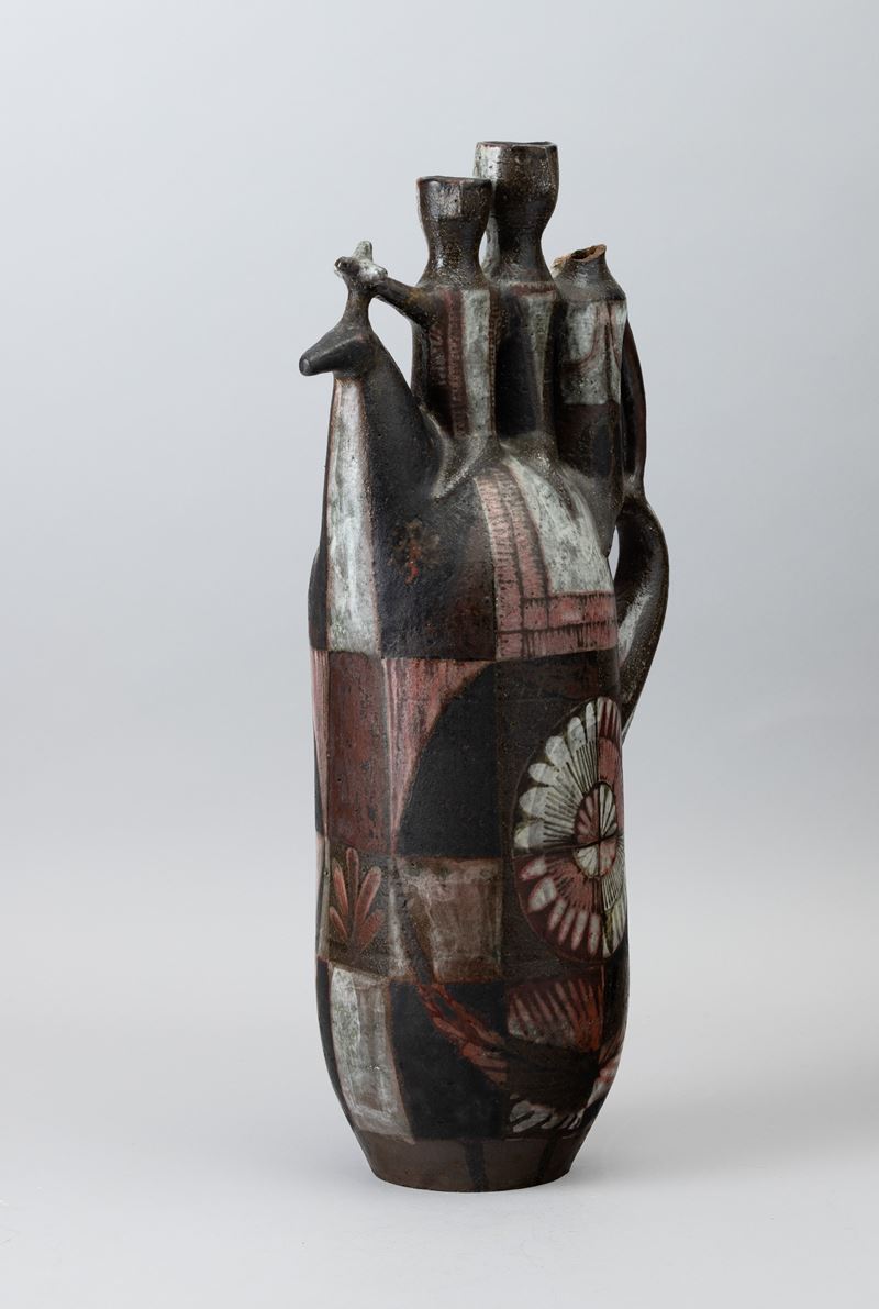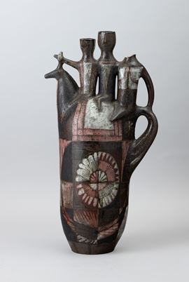 Large stoneware wineskin vase with stylized figures of horsemen and polychrome glaze decoration. One head missing. Imprinted signature.