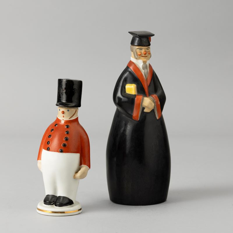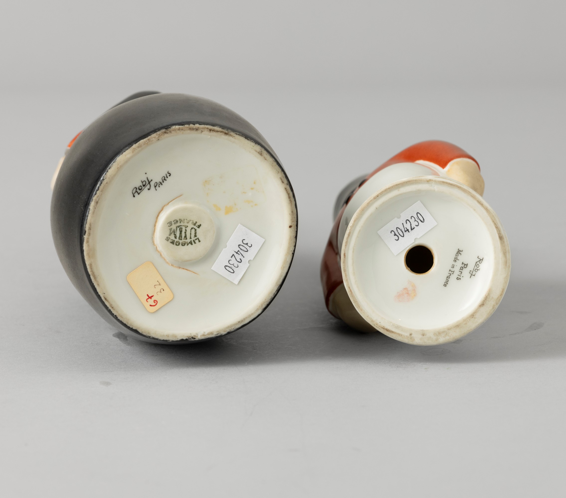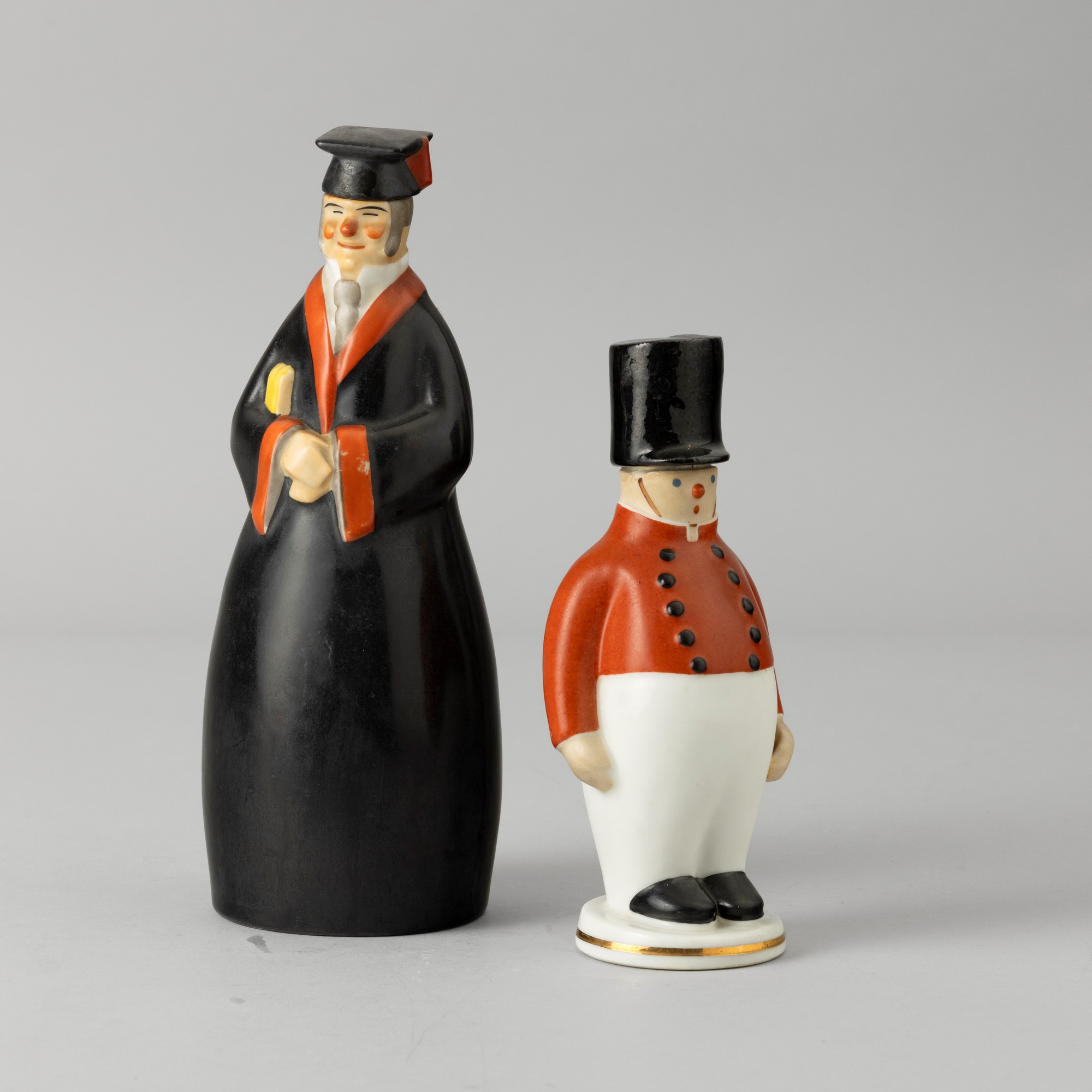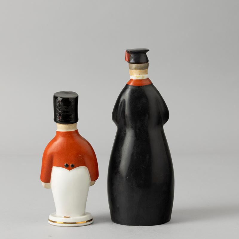Two porcelain bottles in the shape of men with a polychrome enamel decor. Maker's mark