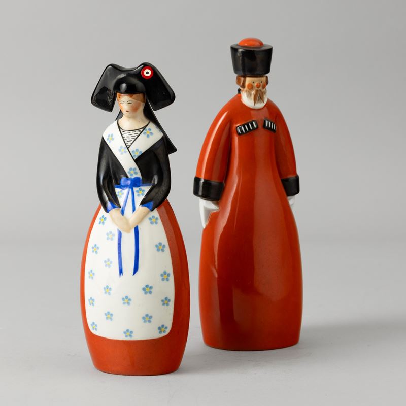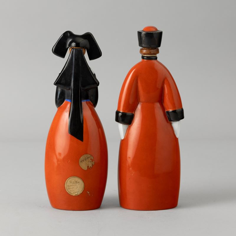 Two porcelain bottles in the shape of a man in Russian clothes and a woman in French clothes with a polychrome enamel decor. Maker's mark and old label