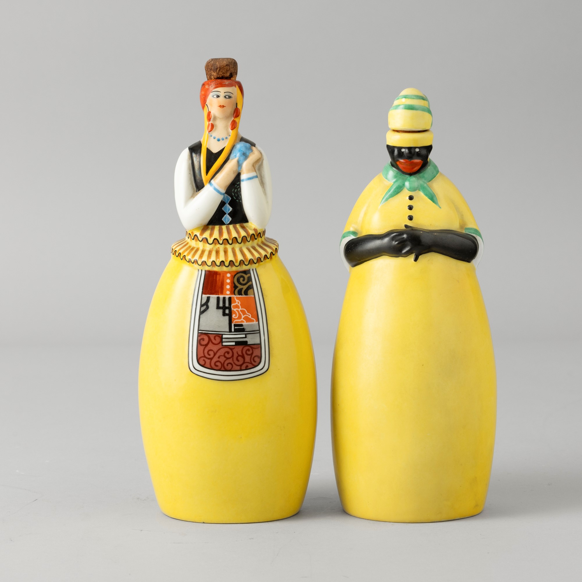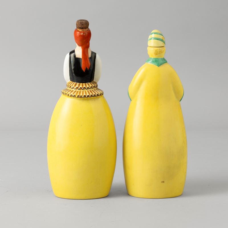Two porcelain bottles in the shape of people wearing traditional clothing from the Antilles with a polychrome enamel decor. Maker's mark. Restored part