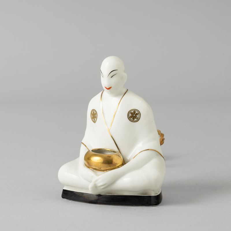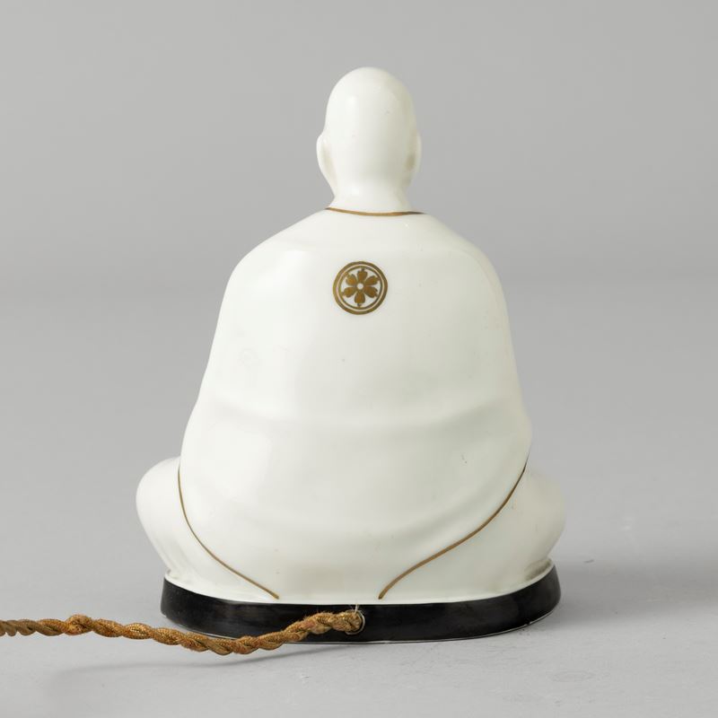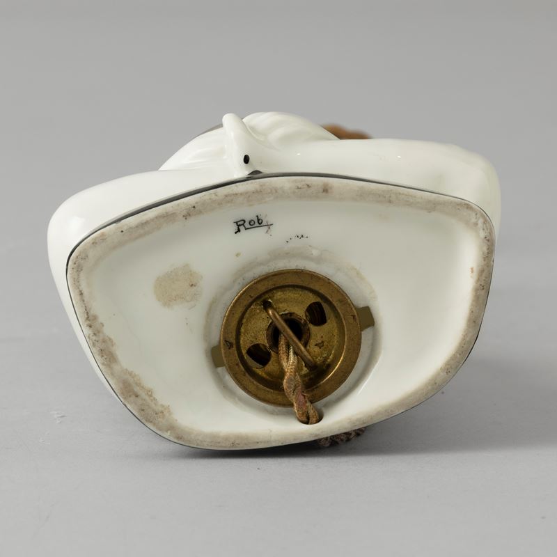 A porcelain veilleuse in the shape of an Oriental-style figure with a polychrome enamel decor. Maker's mark