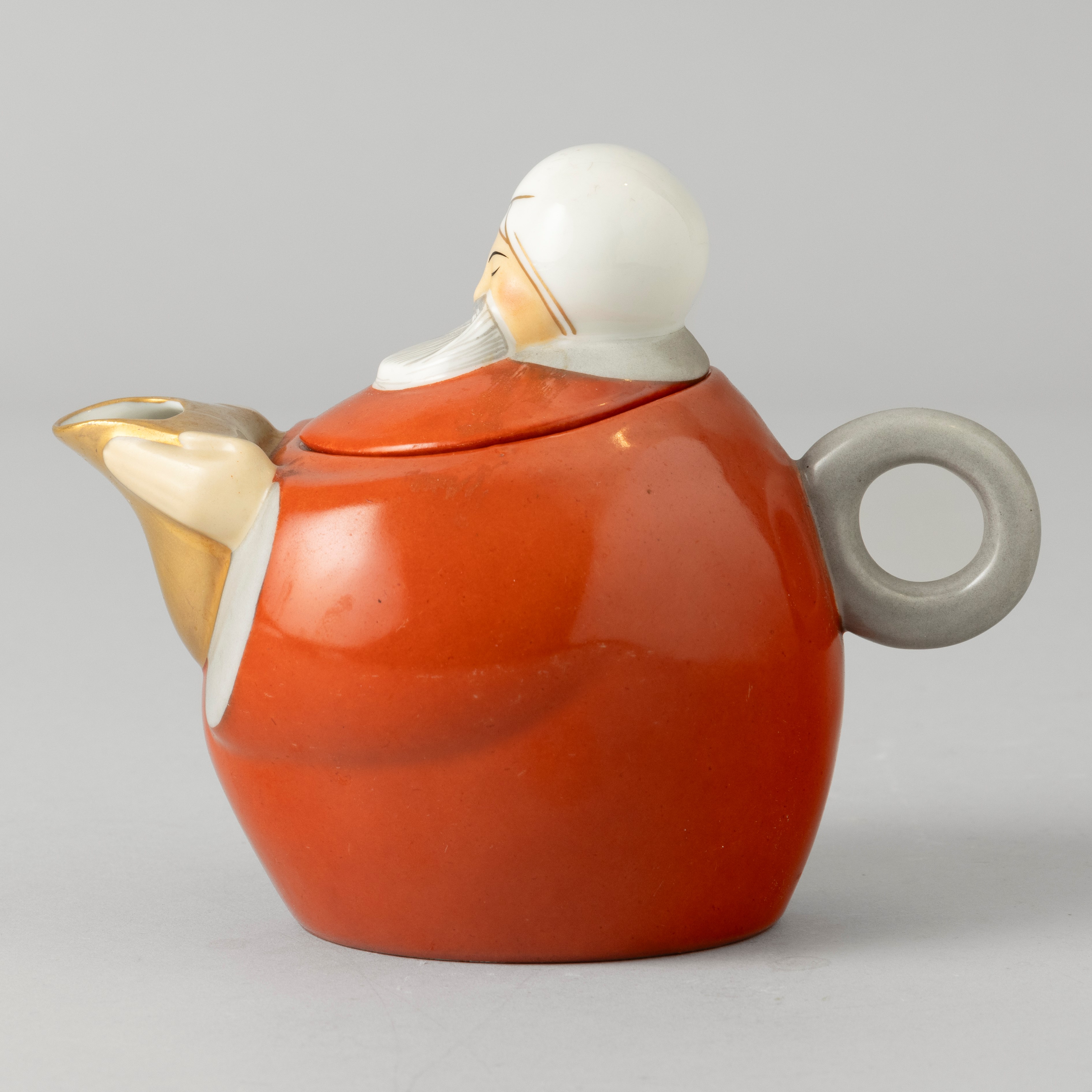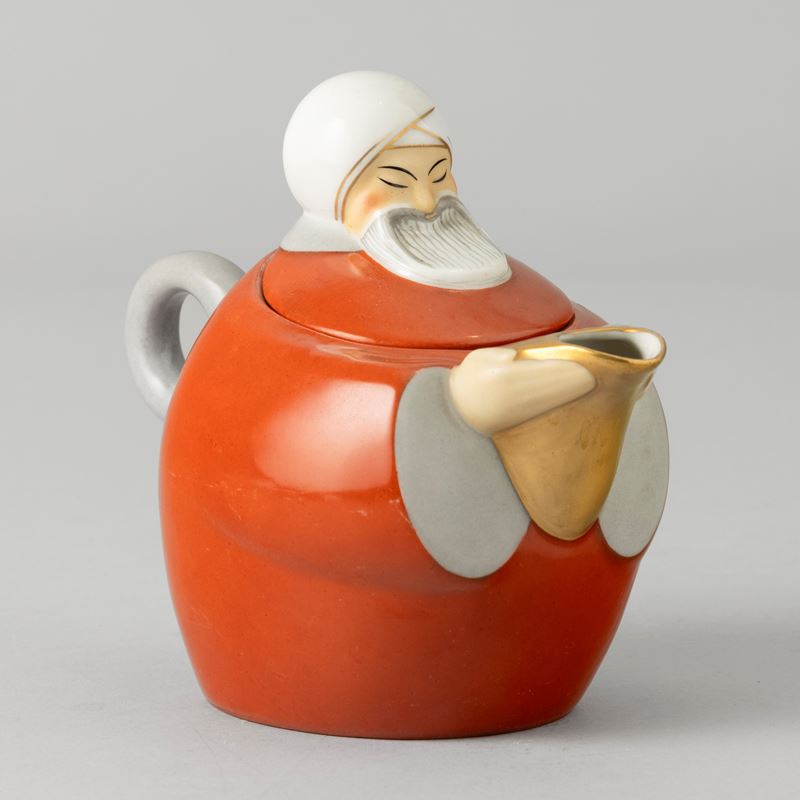 A porcelain teapot in the shape of a man in Oriental clothes with a polychrome enamel decor. Maker's mark