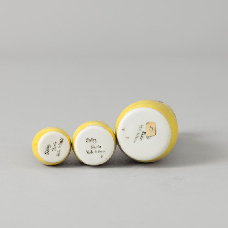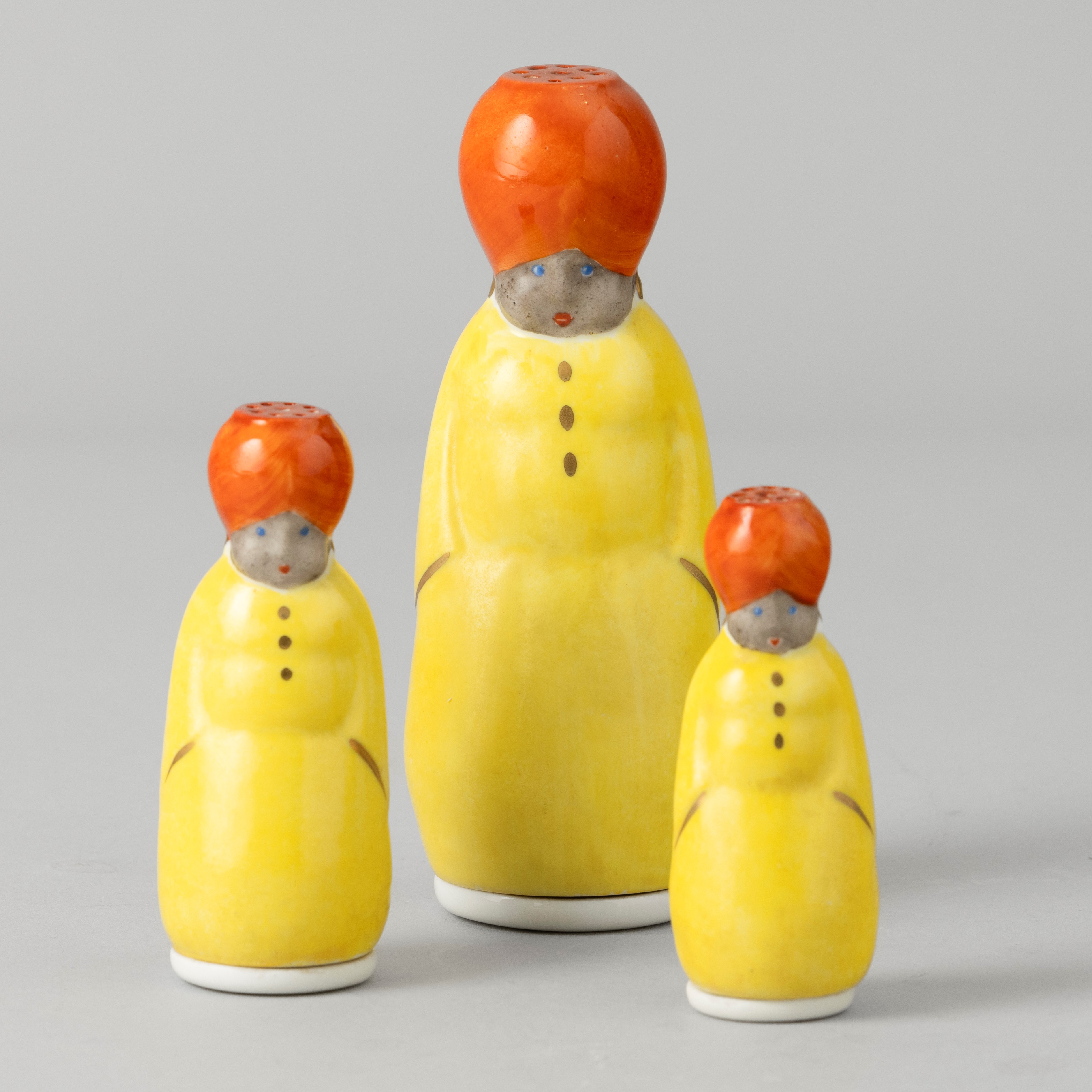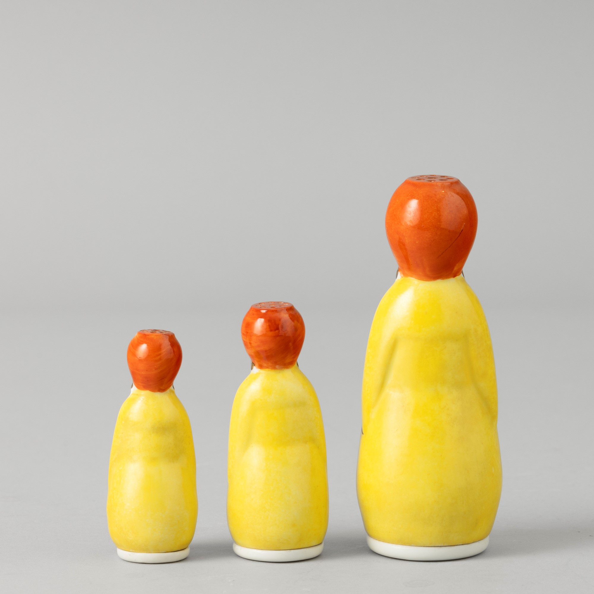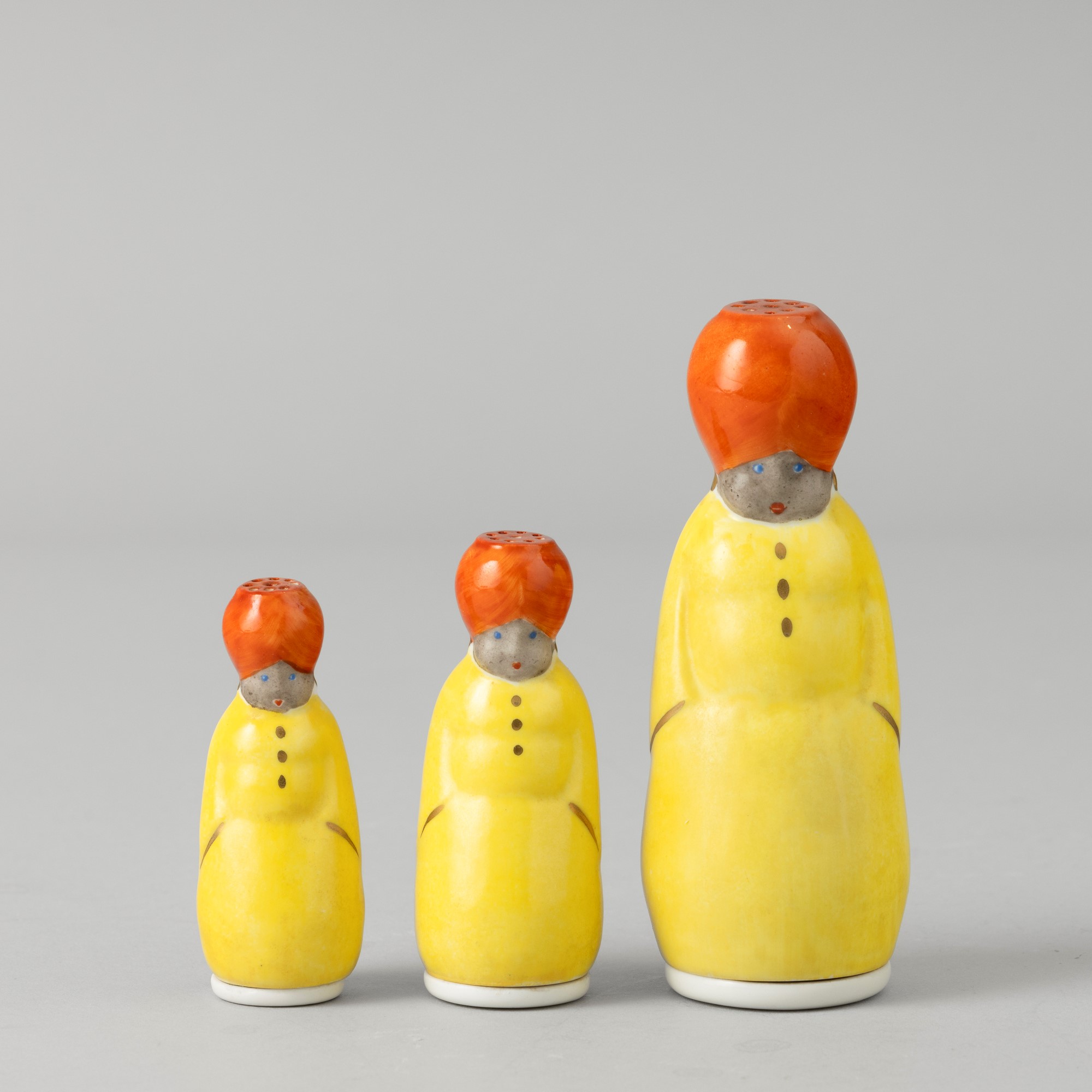 Three porcelain salt shakers in the shape of Oriental figures with a polychrome enamel decors. Maker's mark