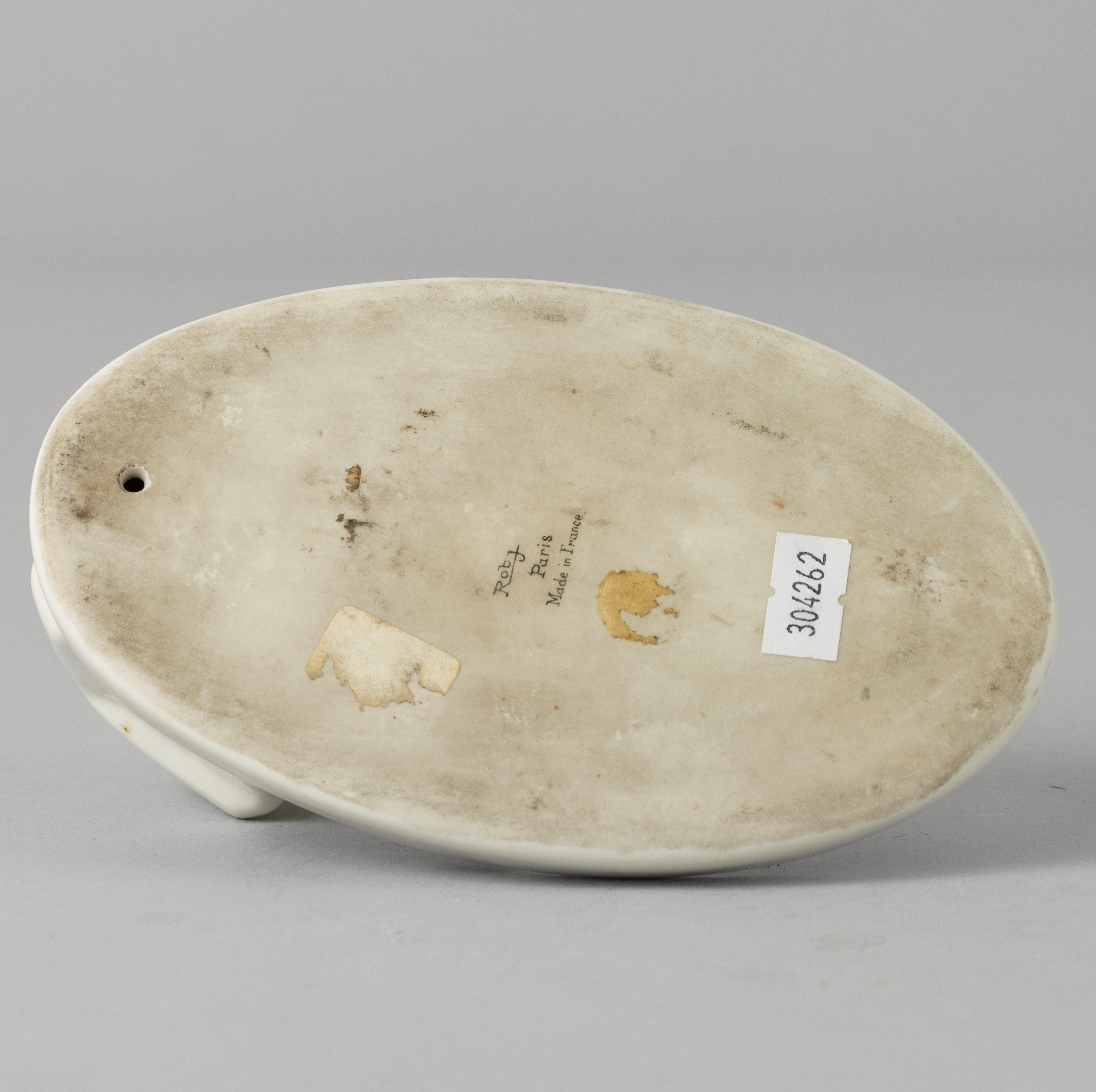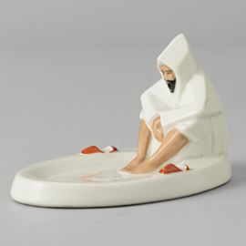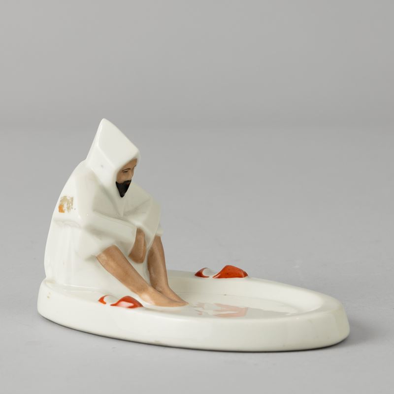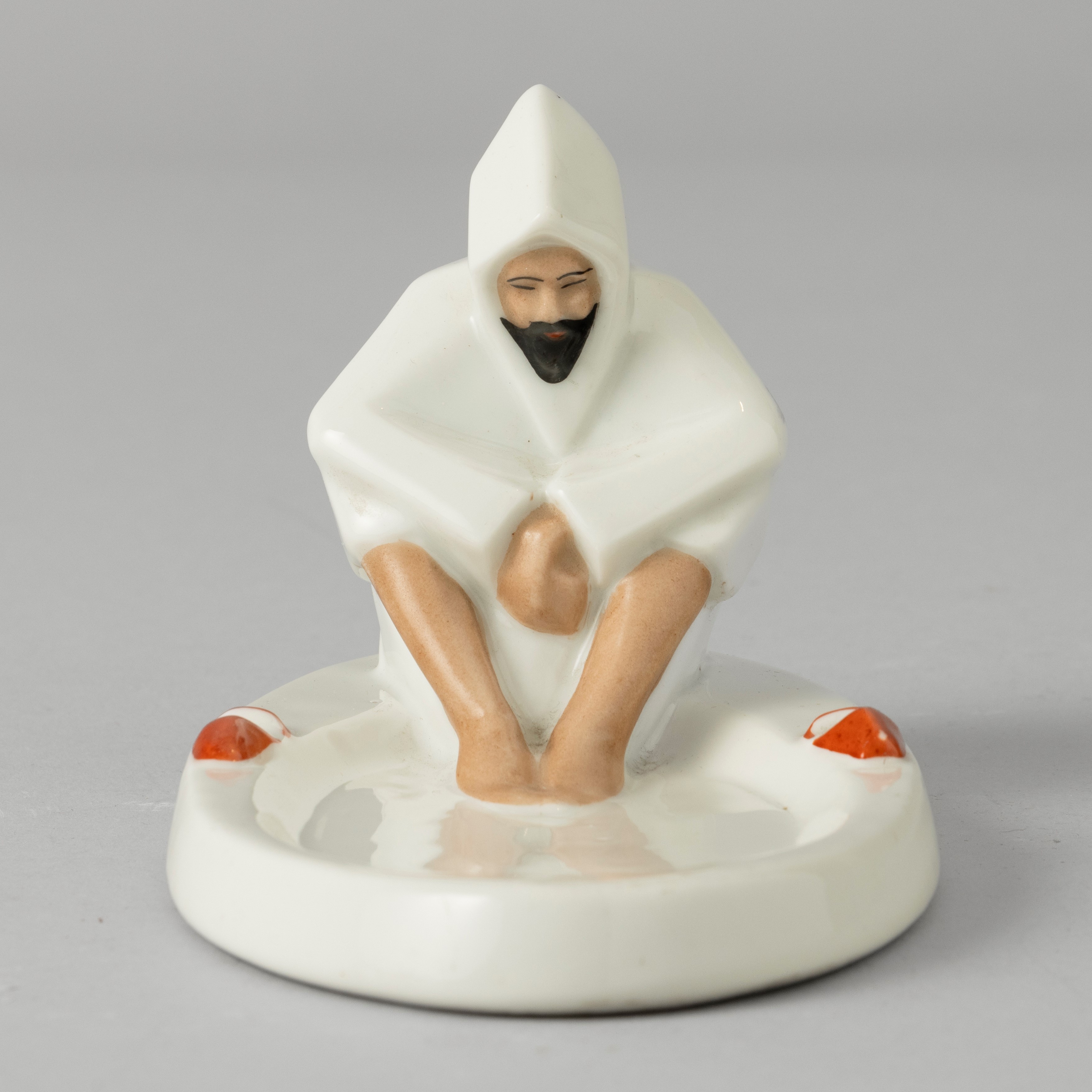 A porcelain dish with a figure of a bedouin in a polychrome enamel decor. Maker's mark. Traces of old label and minor scratches