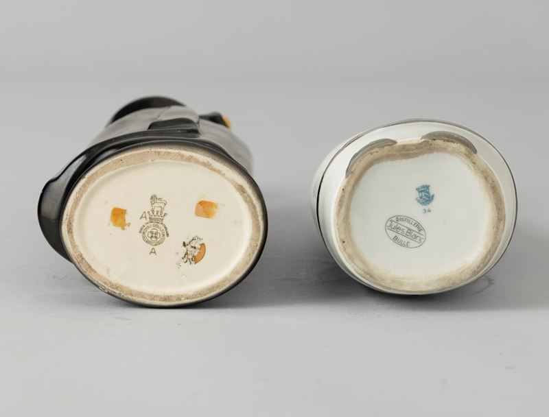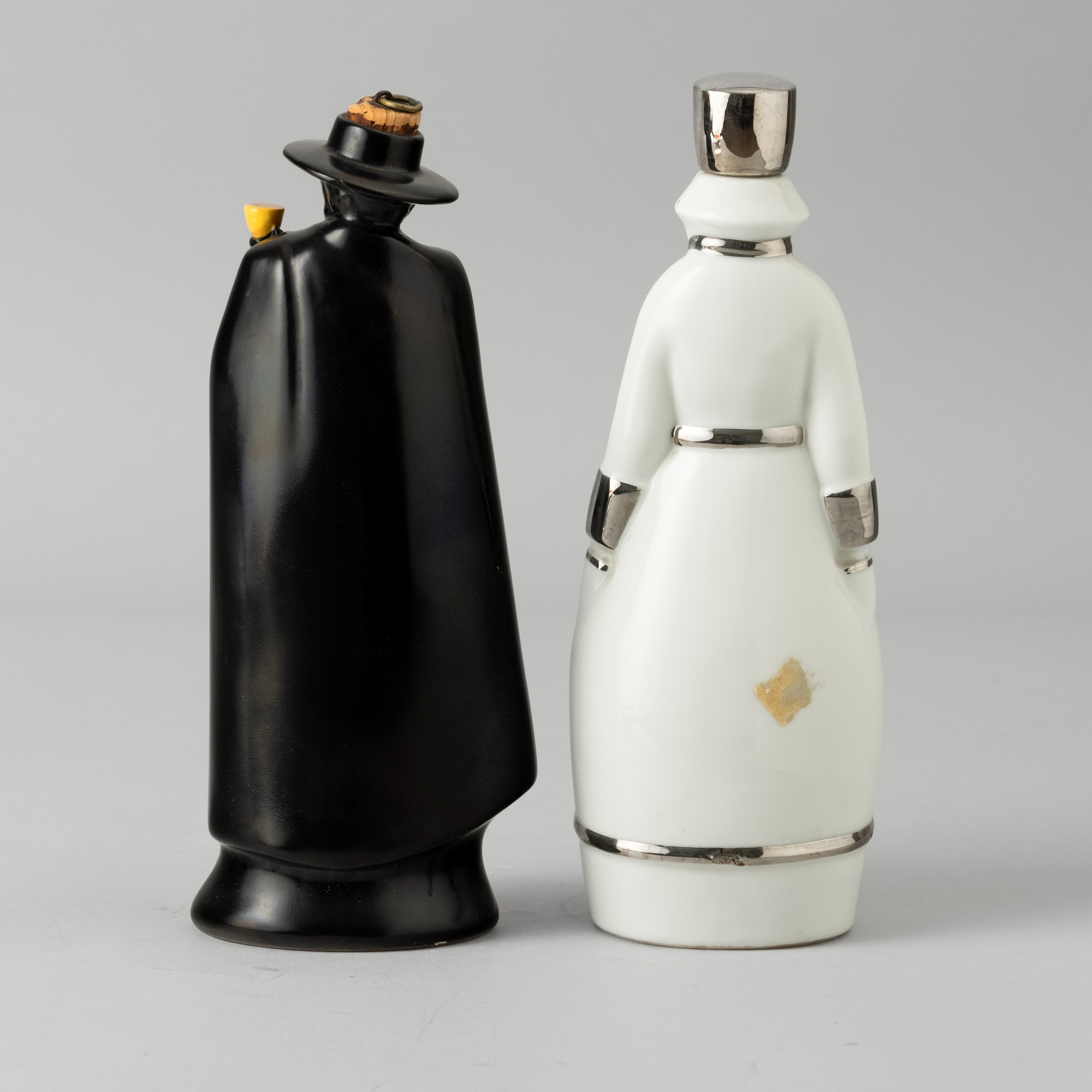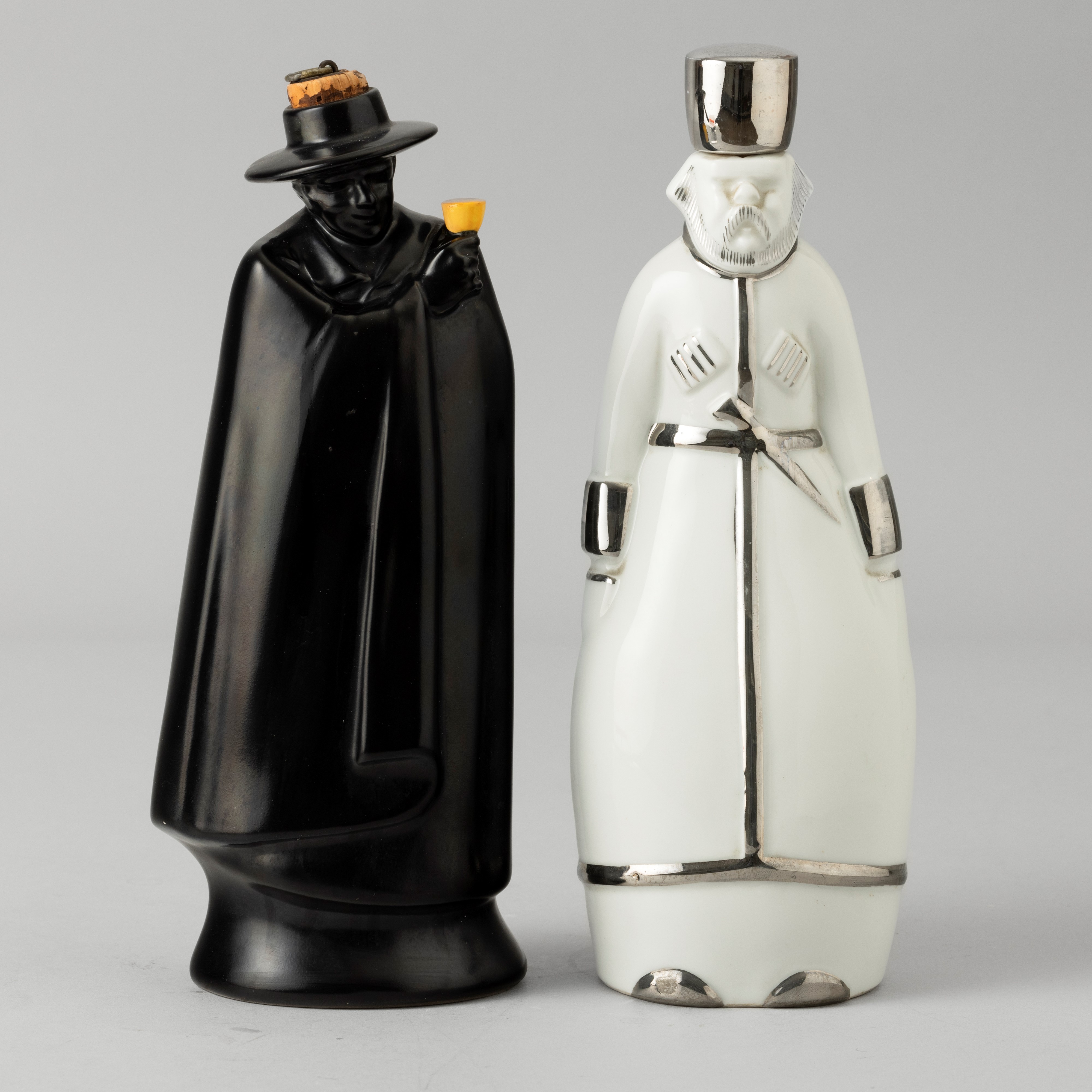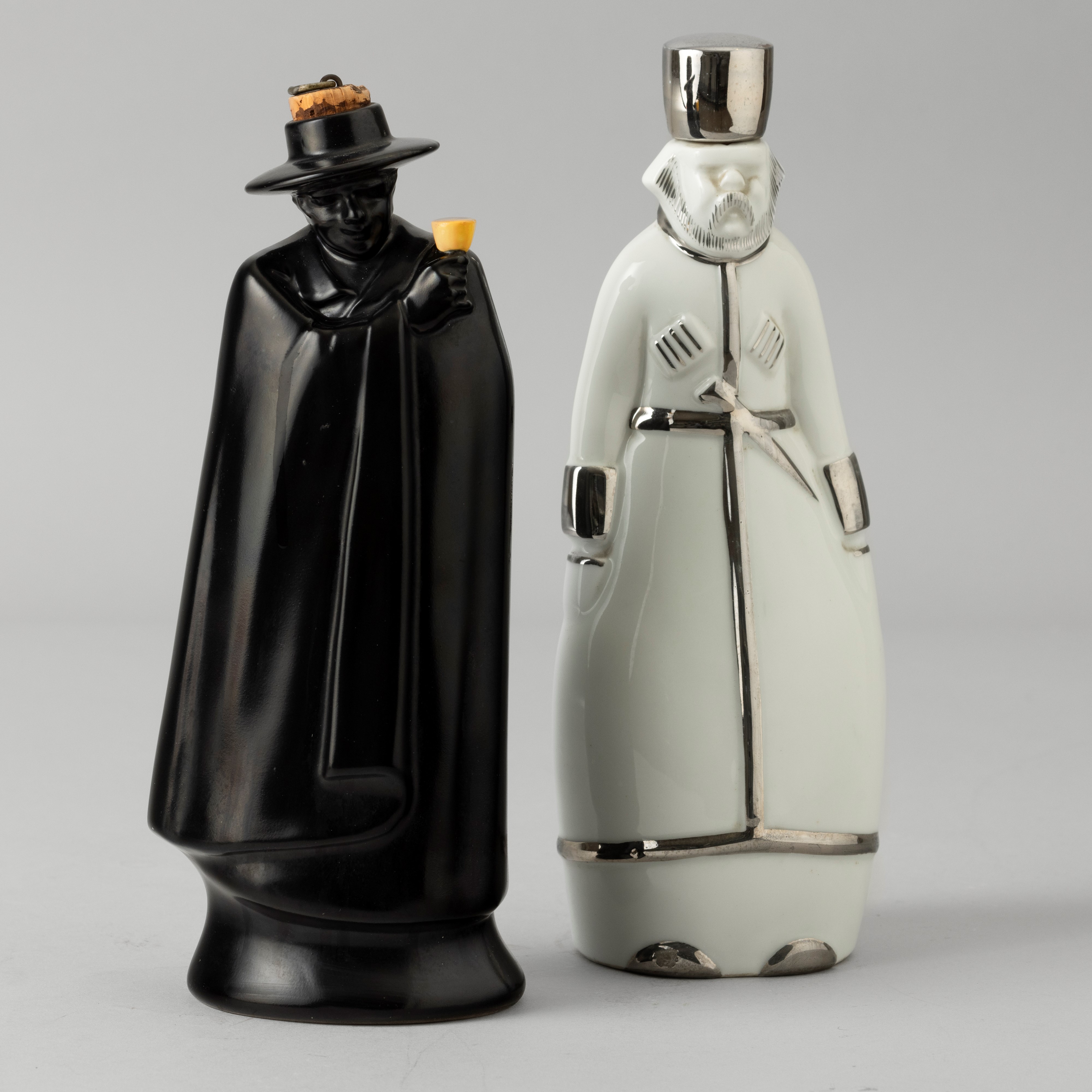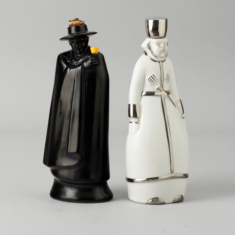 Two porcelain bottles, one in the shape of a Russian-style man with a silver decor, the other a man wearing a black cloak with a polychrome enamel decor. Maker's marks and mark for Distillerie Jules Blanc. Faults
