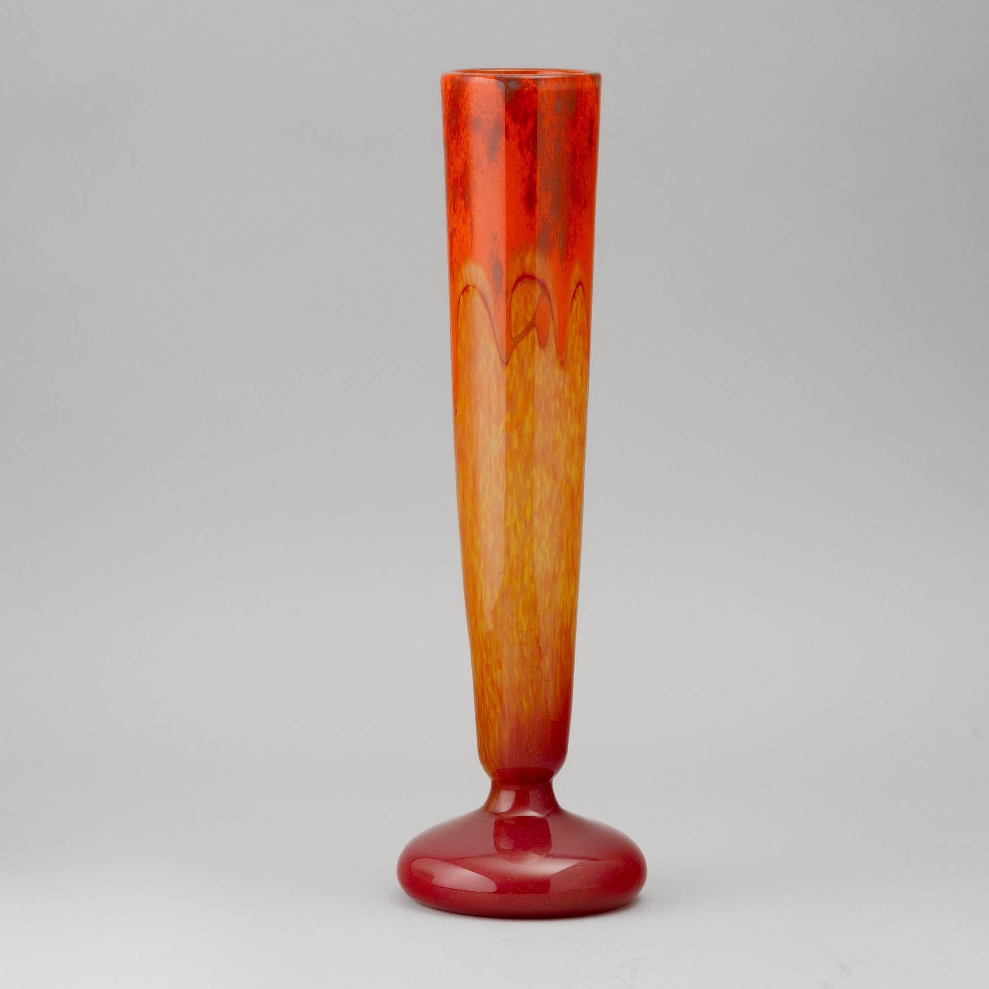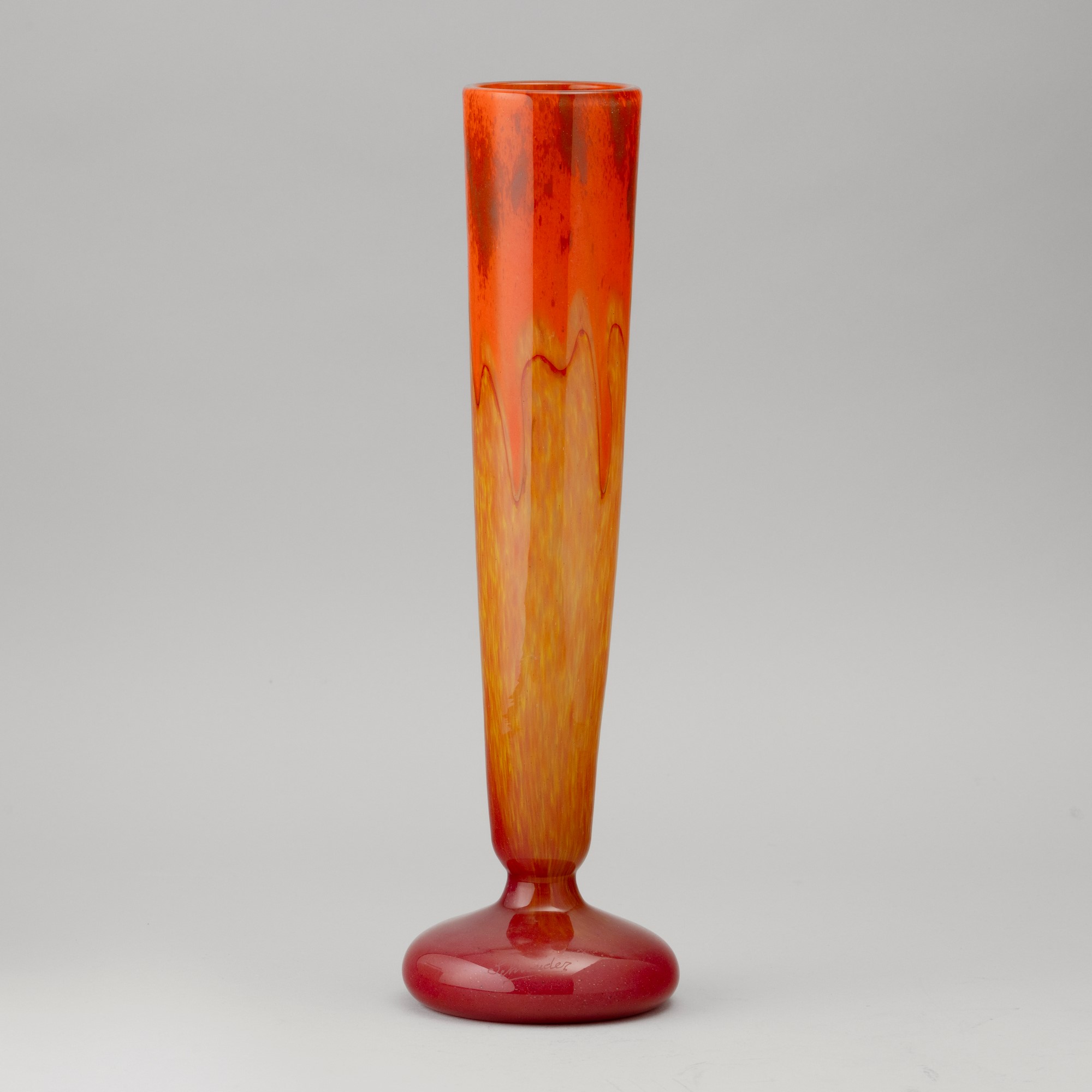 A glass vase with a polychrome powder decor. Engraved signature