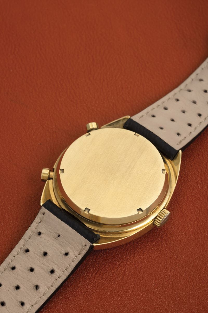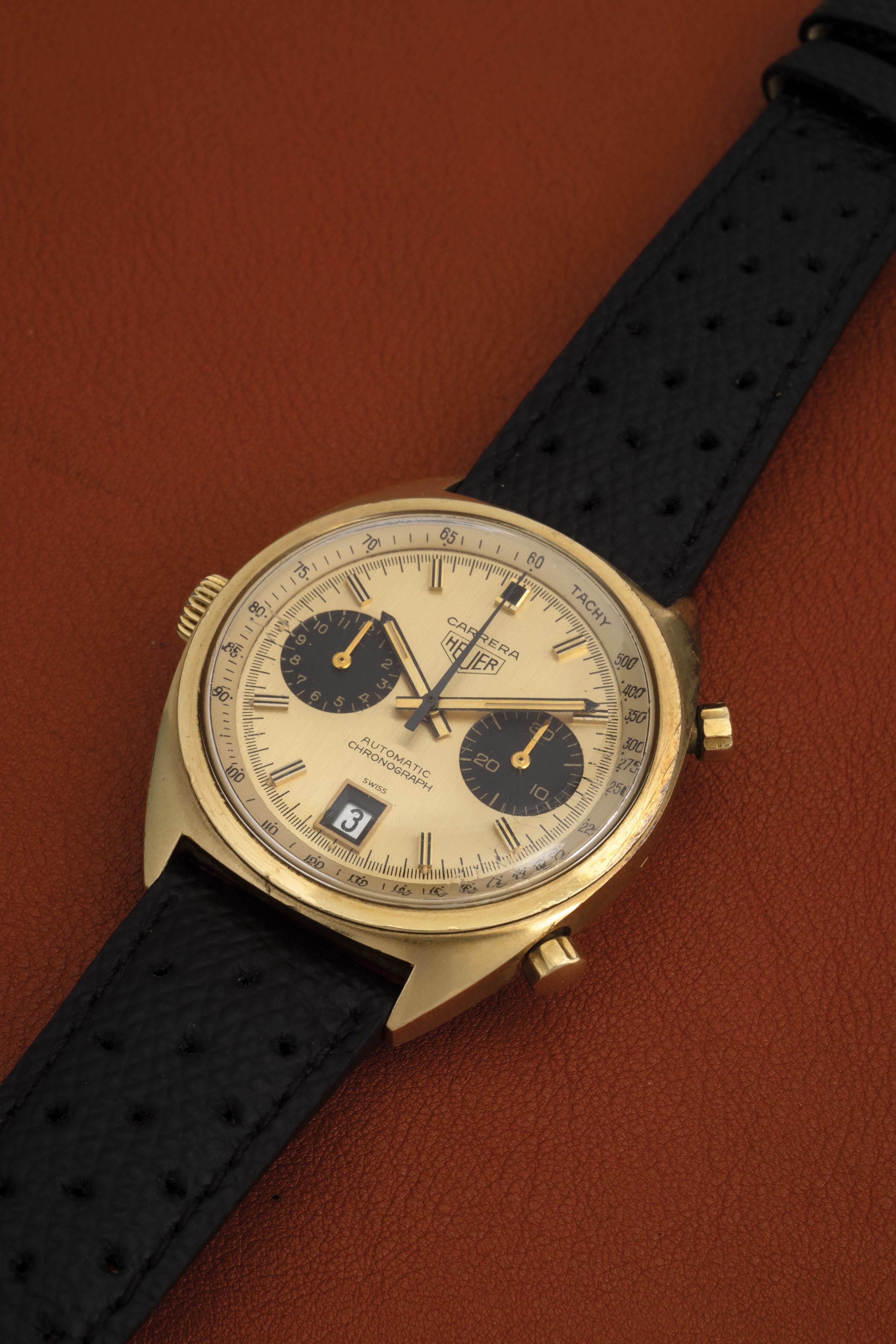 The Carrera 1158 in gold is probably the most iconic gold chronograph ever produced by Heuer. Known among collectors as the “Ferrari Carrera ”because of its close partnership with Ferrari from 1971 to 1979, during which the team benefited from Heuer's timekeeping instrument and a number of famous drivers received this watch. The present example is particularly beautiful and well-preserved, with the black edges of the hands matching those of the hour markers and counters. Striking a perfect balance between Heuer's sporty DNA and the sleek and elegant 18K yellow gold case, this watch embodies the glamorous era of 1970s race tracks.
